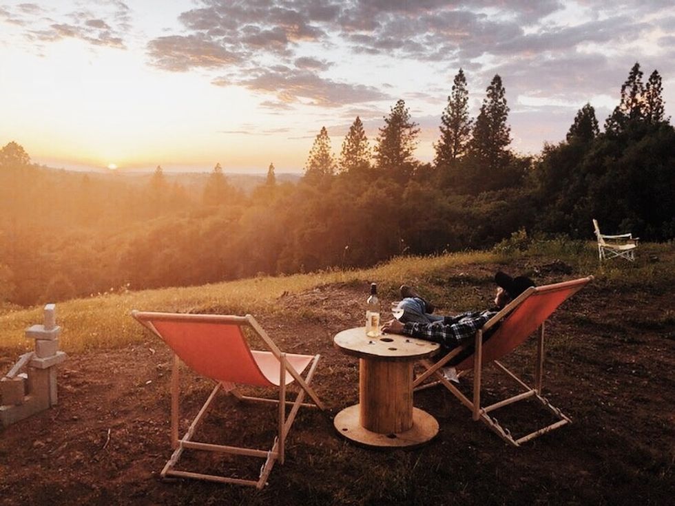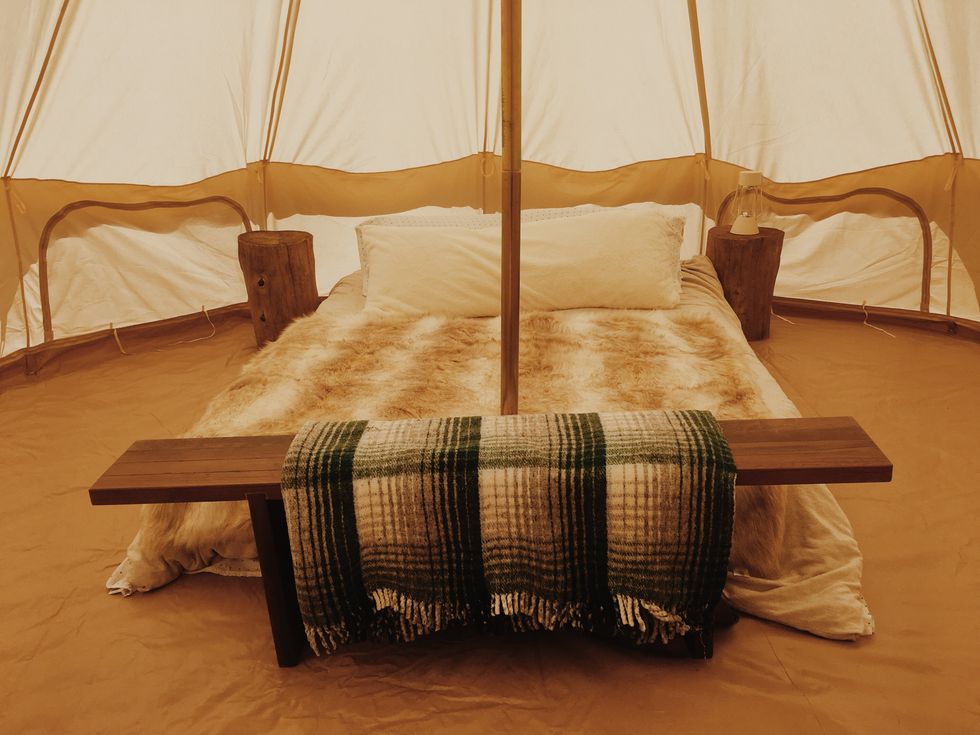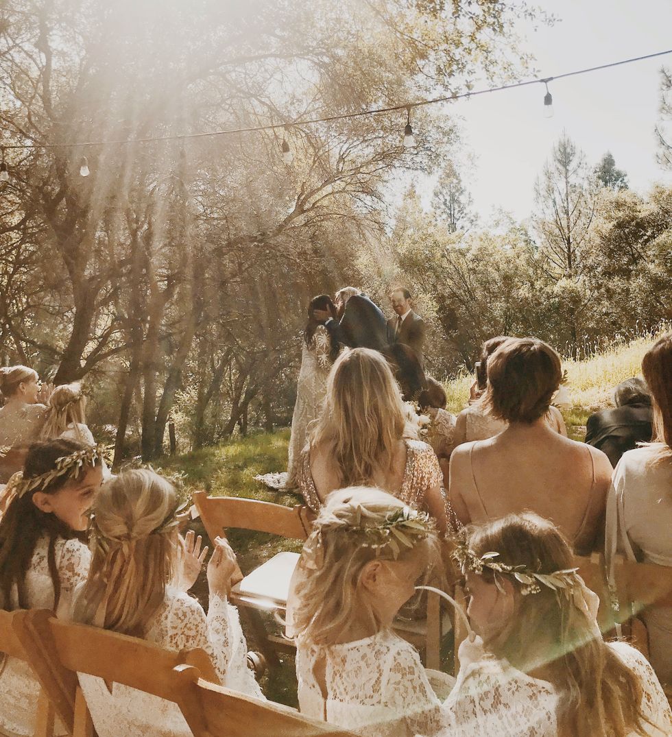 A carefree attitude reined in the days before the event as friends settled into furnished tents around the property—"We wanted to camp with our friends while still having it be as comfy and luxe as possible"—and the mood carried into the ceremony and reception where they all drank wine and lounged in hammocks and watched the sun set.