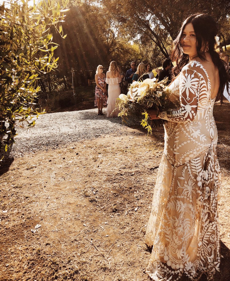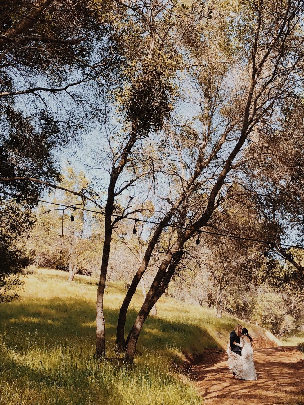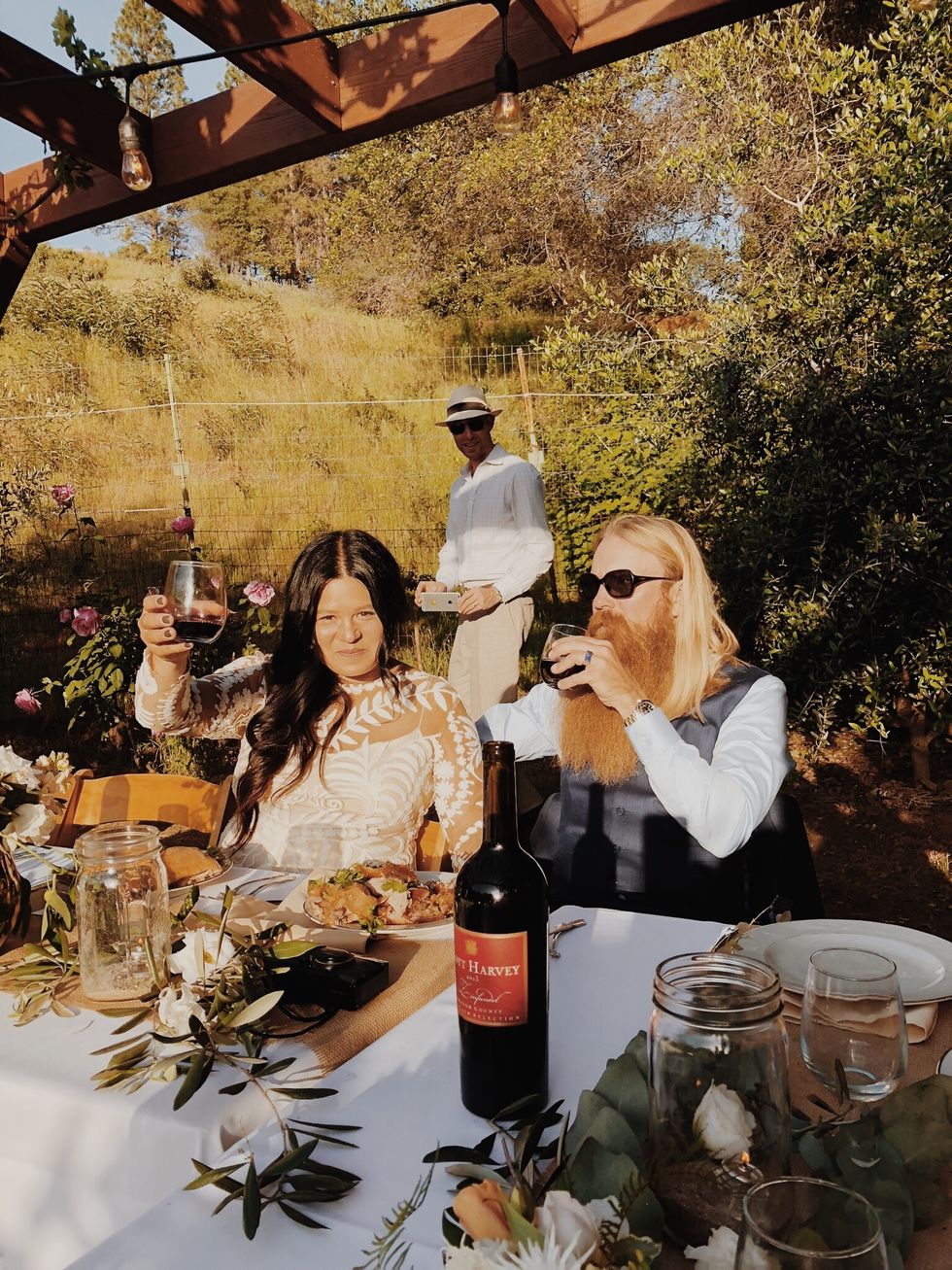 The lovebirds planned their big day at Gong's parents' property in Sutter Creek, located in Amador County, where plenty of open space and a vineyard would provide the perfect rustic setting. They hung lights and set up a camping area for guests complete with an outdoor shower, a horse trough swimming pool, and an outdoor kitchen where a chef-friend would cook for them over the fire. An extra long communal table—no assigned seating—was set with eucalyptus runners for a dinner of mixed charcuterie with spring pickles and ricotta, fire-roasted porchetta, and campfire chicken served with salads and summer squash.