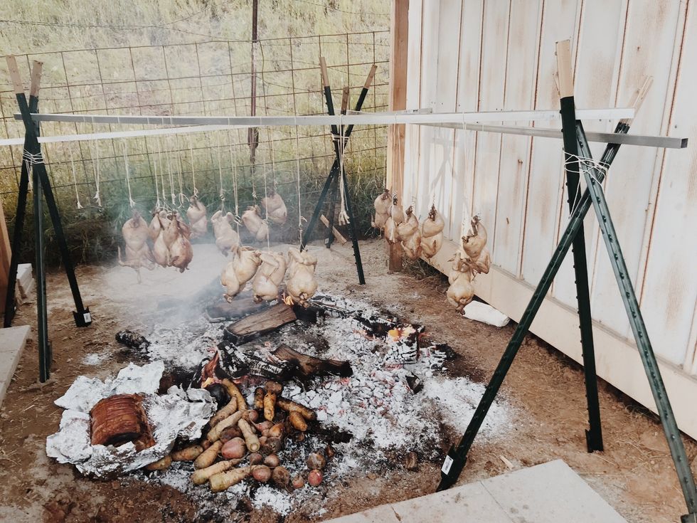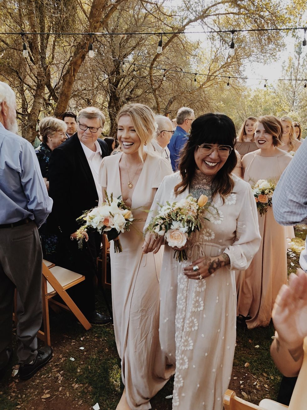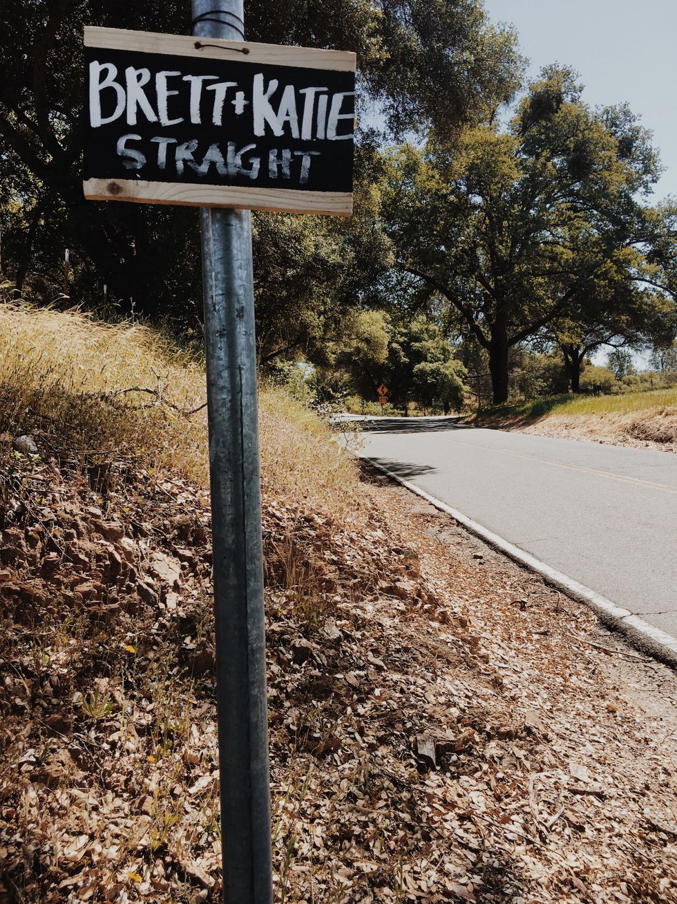The lovebirds planned their big day at Gong's parents' property in Sutter Creek, located in Amador County, where plenty of open space and a vineyard would provide the perfect rustic setting. They hung lights and set up a camping area for guests complete with an outdoor shower, a horse trough swimming pool, and an outdoor kitchen where a chef-friend would cook for them over the fire. An extra long communal table—no assigned seating—was set with eucalyptus runners for a dinner of mixed charcuterie with spring pickles and ricotta, fire-roasted porchetta, and campfire chicken served with salads and summer squash.