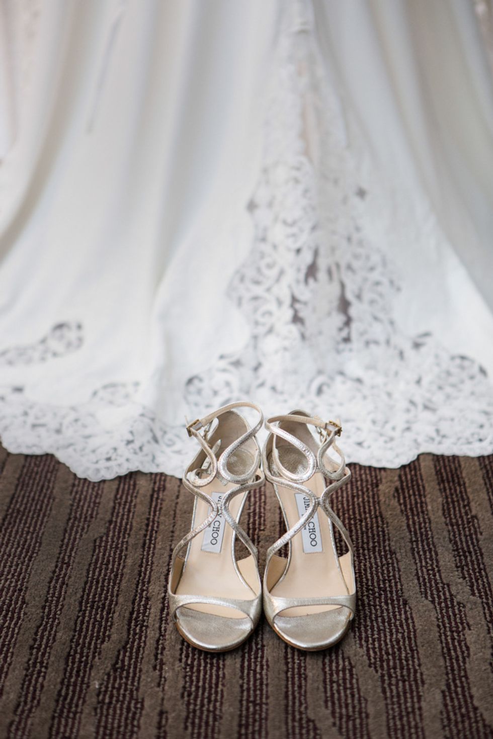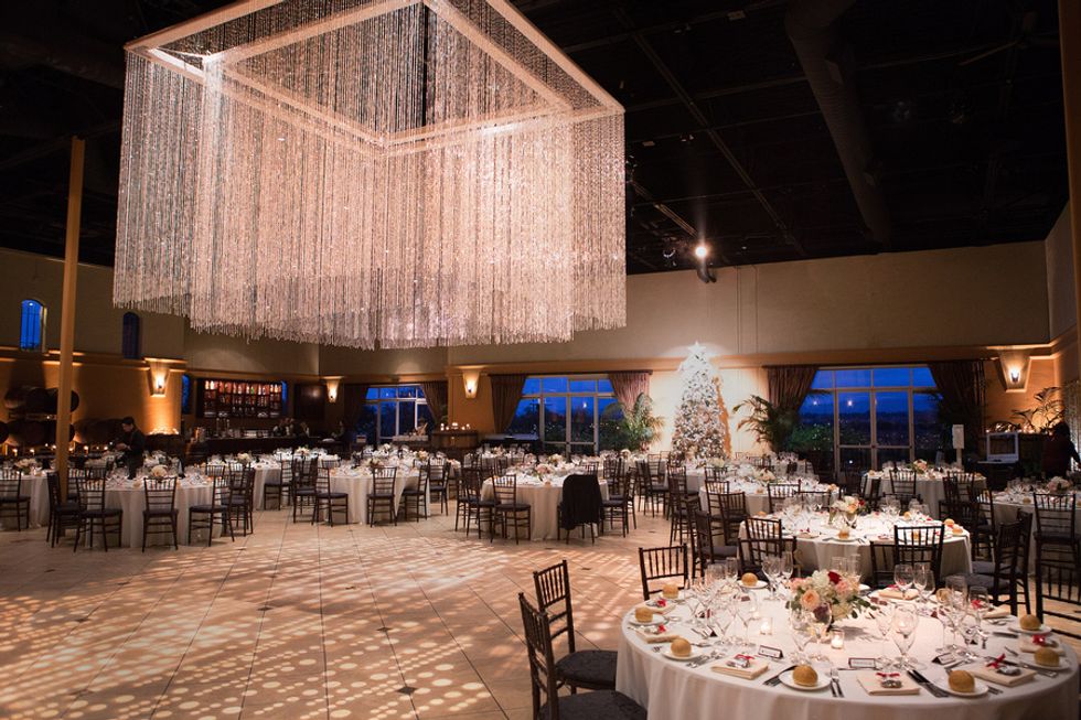 Floating candles, a breakfast bar with waffles and mimosas, and a stunning four-tiered wedding cake set the stage for an elegant but homey party. Guests nibbled and Jessica and Ryan danced the night away beneath an enormous crystal chandelier.
