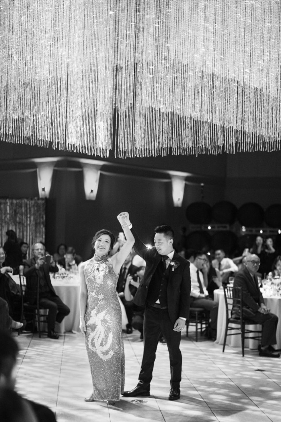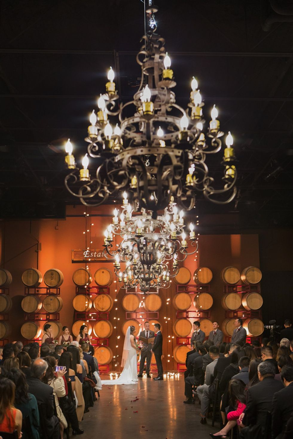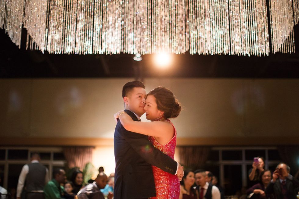 Pleasanton's Palm Event Center provided a beautiful setting for their ceremony and the vineyard an ideal place to snap some pics. Through redwood doors, guests entered the reception to find a churros cart and Jessica wearing an entirely new dress–a Chinese gown with intricate red and gold beading.