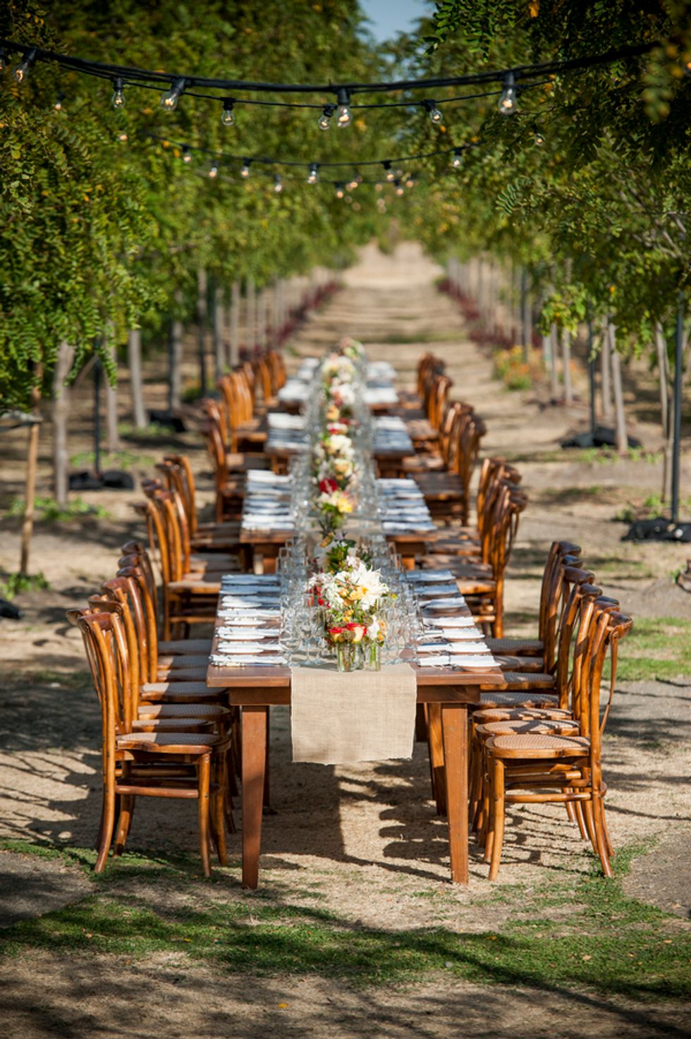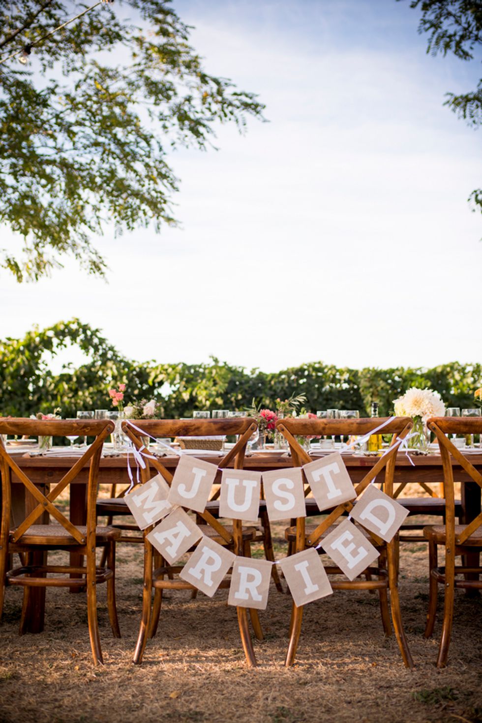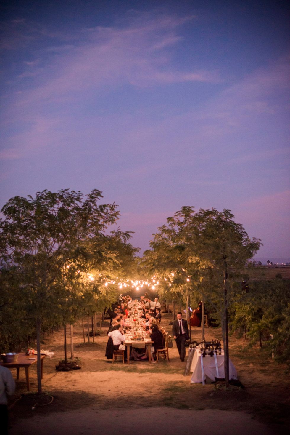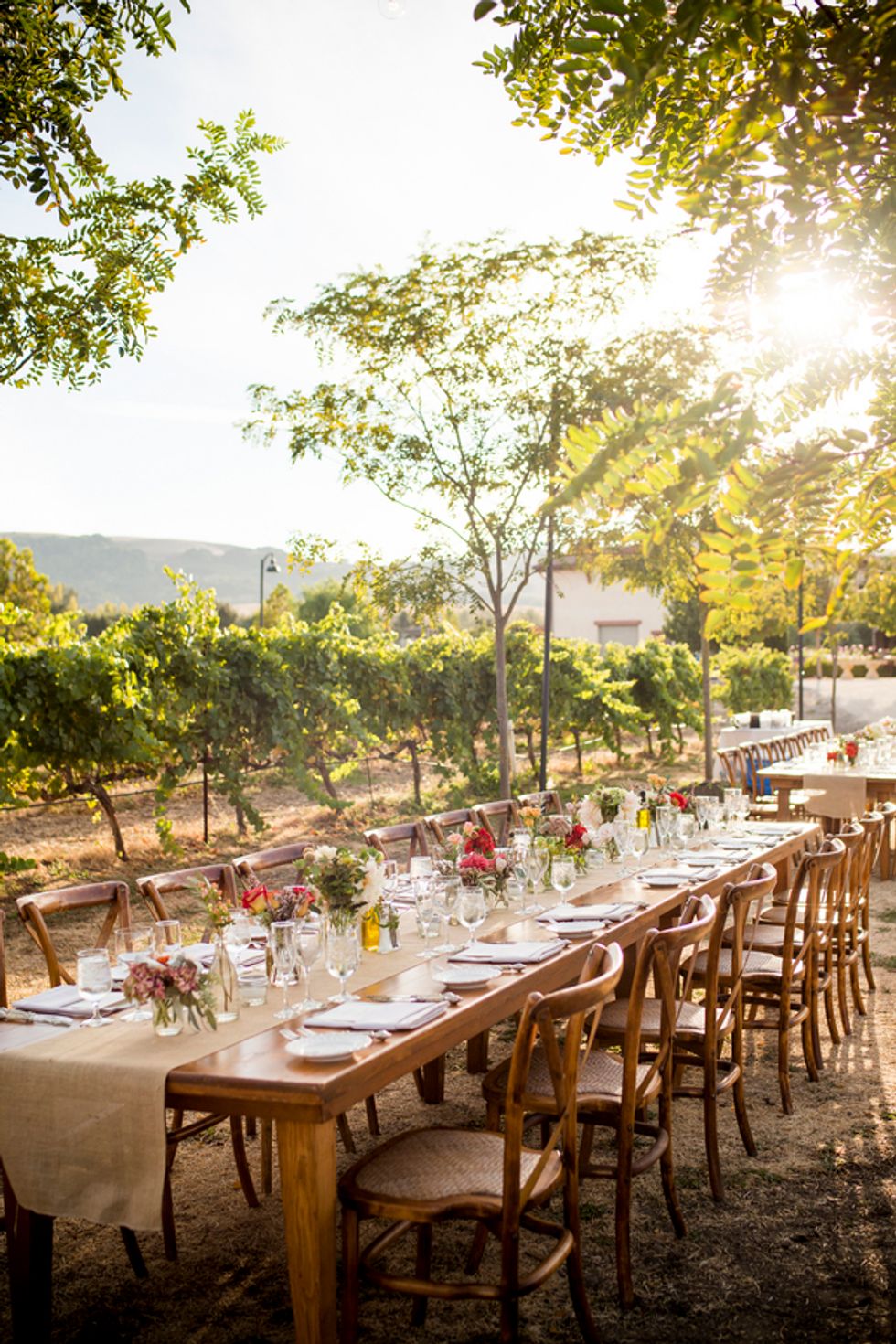On the big day, beautiful, sunny weather provided the perfect lighting for the outdoor ceremony and the elegant dinner in the vineyard. One long table was set up right between the grapevines with Italian string lights above. Guests enjoyed butternut squash ravioli and short rib as the sun set over Wine Country. After the dinner, the party moved into the barrel room of the winery for dancing and cake. Custom cocktails and handcrafted tequila Jell-O shots with edible flowers in the center kept the party going. At the end of the evening, Sonoma County school buses picked everyone up and took them back to the hotel for the after party.