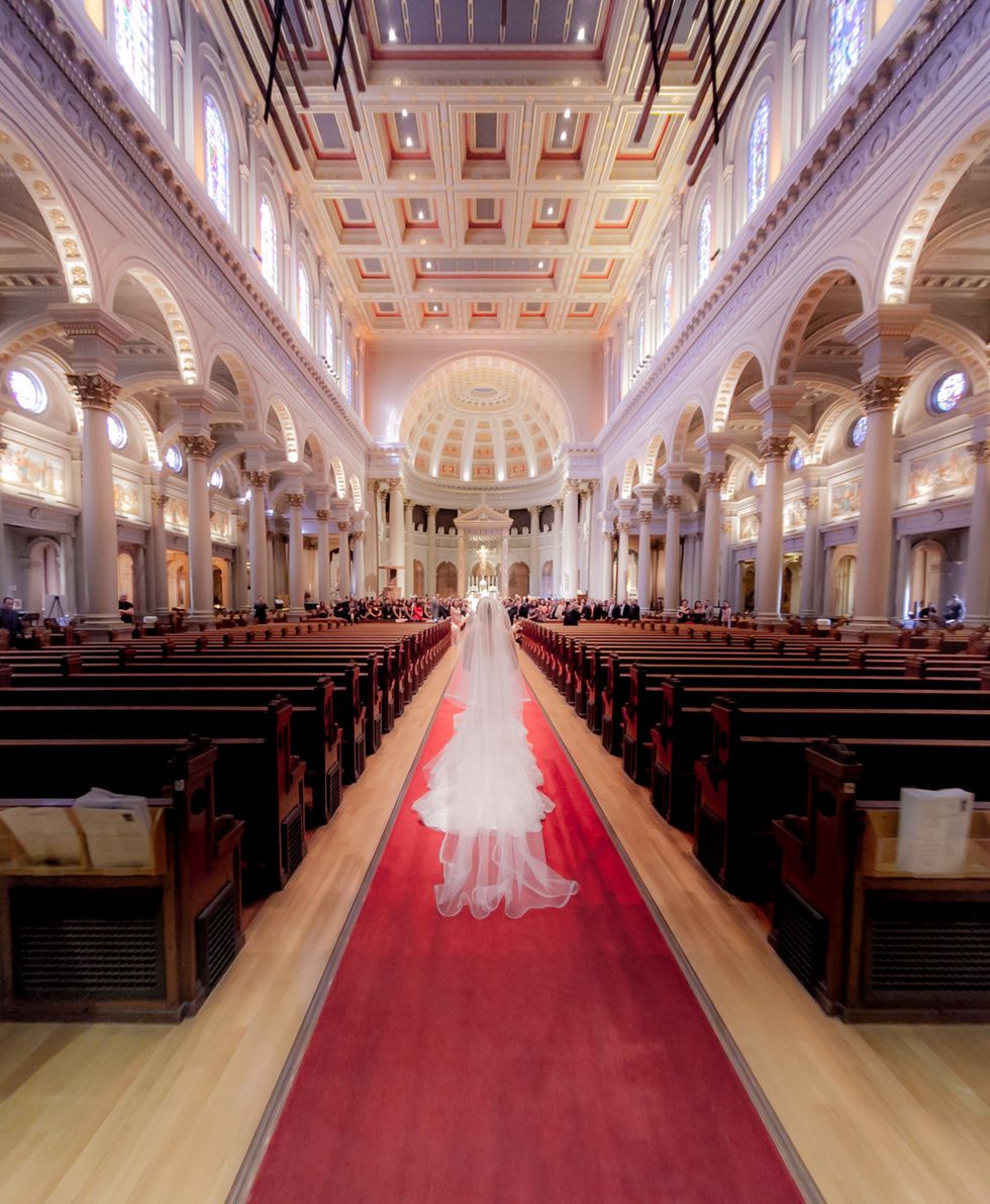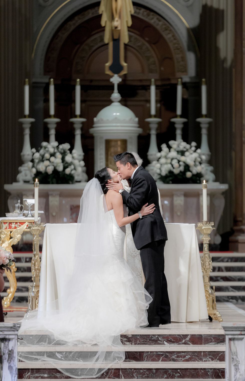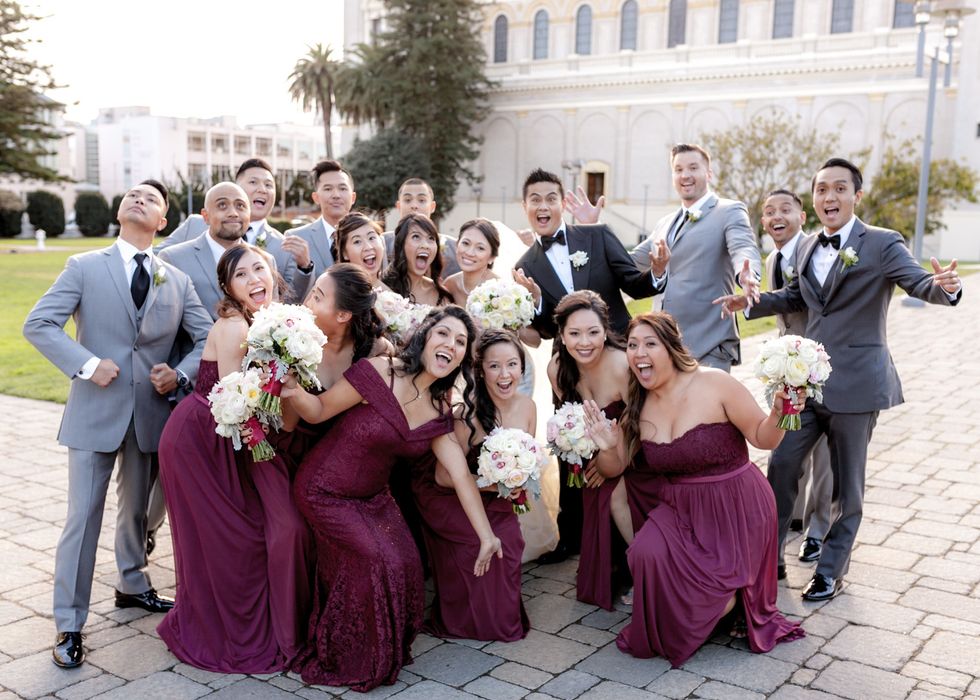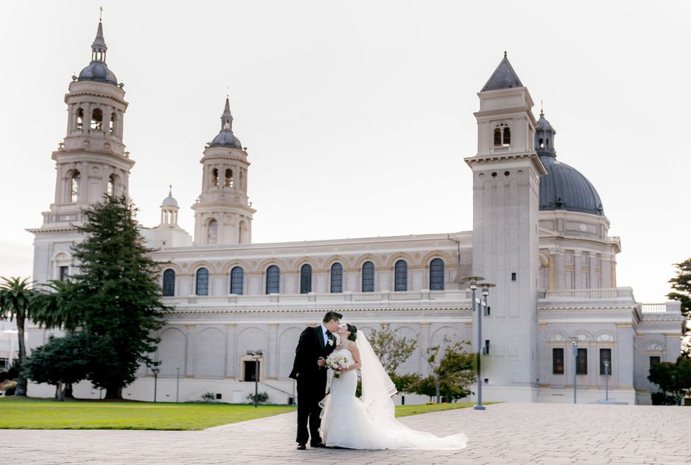 The action junkies shared a regal ceremony at USF's ornate Saint Ignatius Church alongside bridesmaids swathed in flowing crimson gowns and groomsmen in grey suits and black ties.