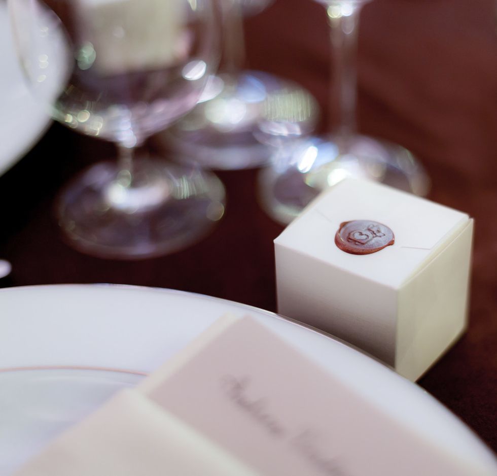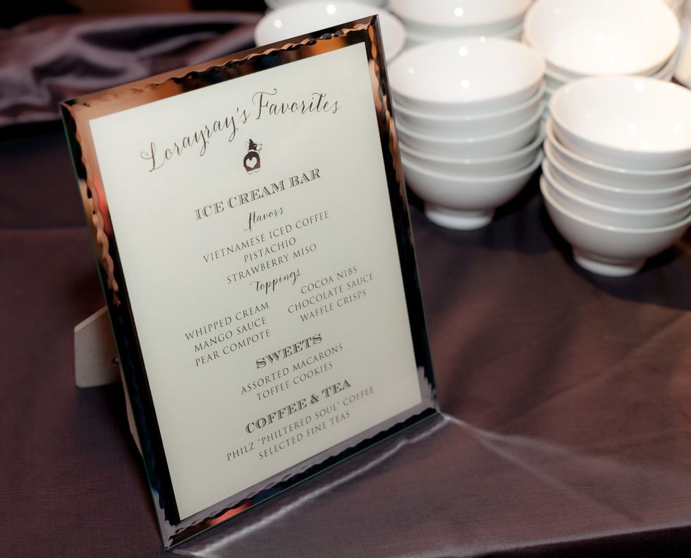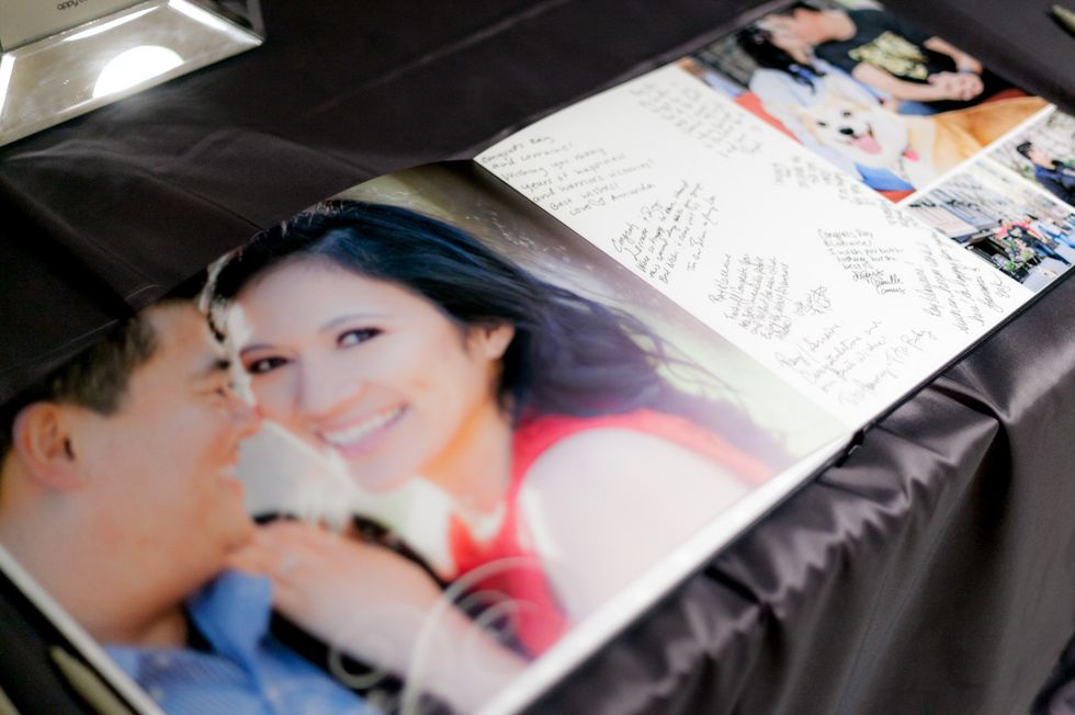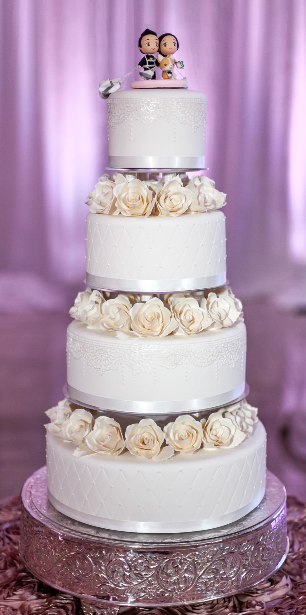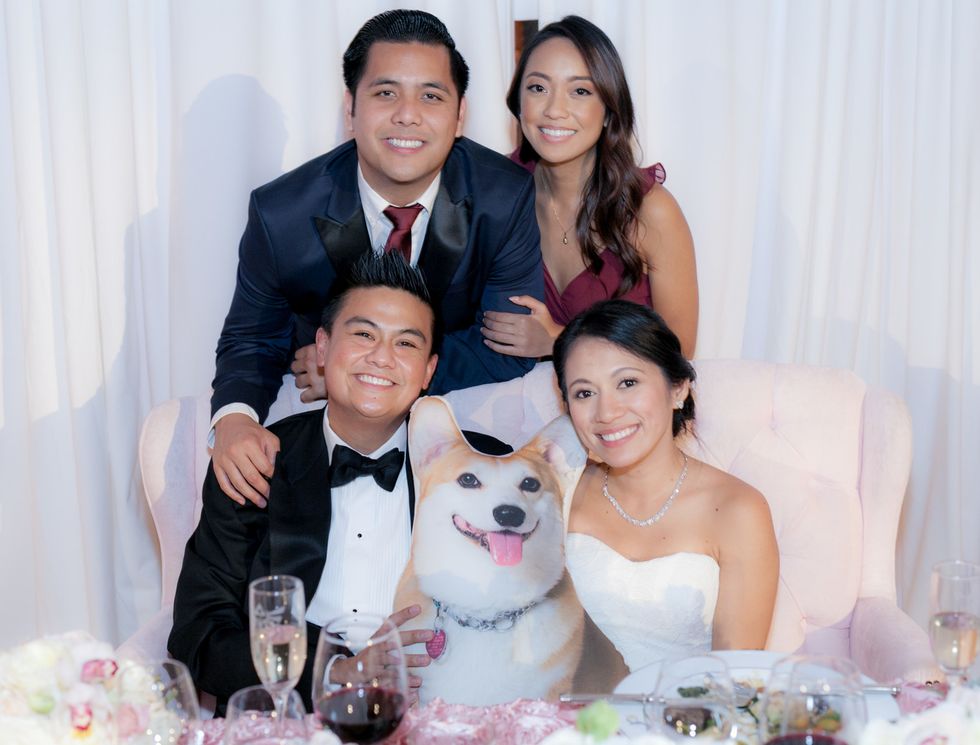 Capping it all off was a presentation by Golden State Warriors hypeman Franco Finn and a three-layer cake with a bride and groom harnessed in parachutes. Their corgi also made an appearance on the celebratory confectionary as well as in cardboard cutouts at their table.