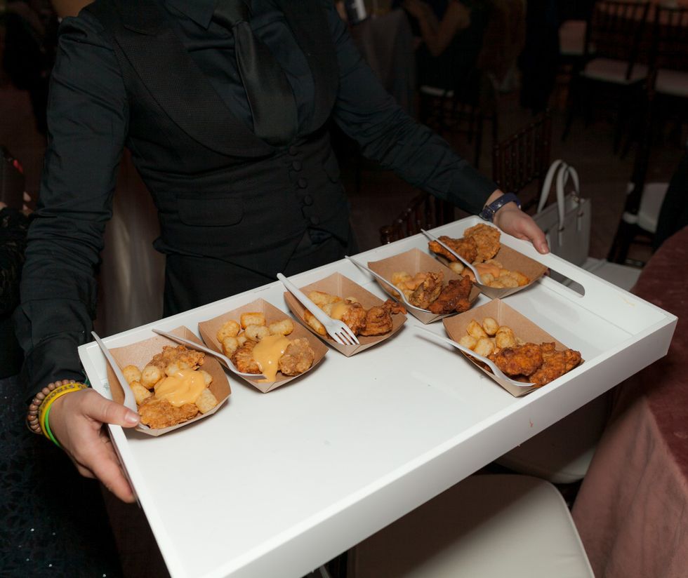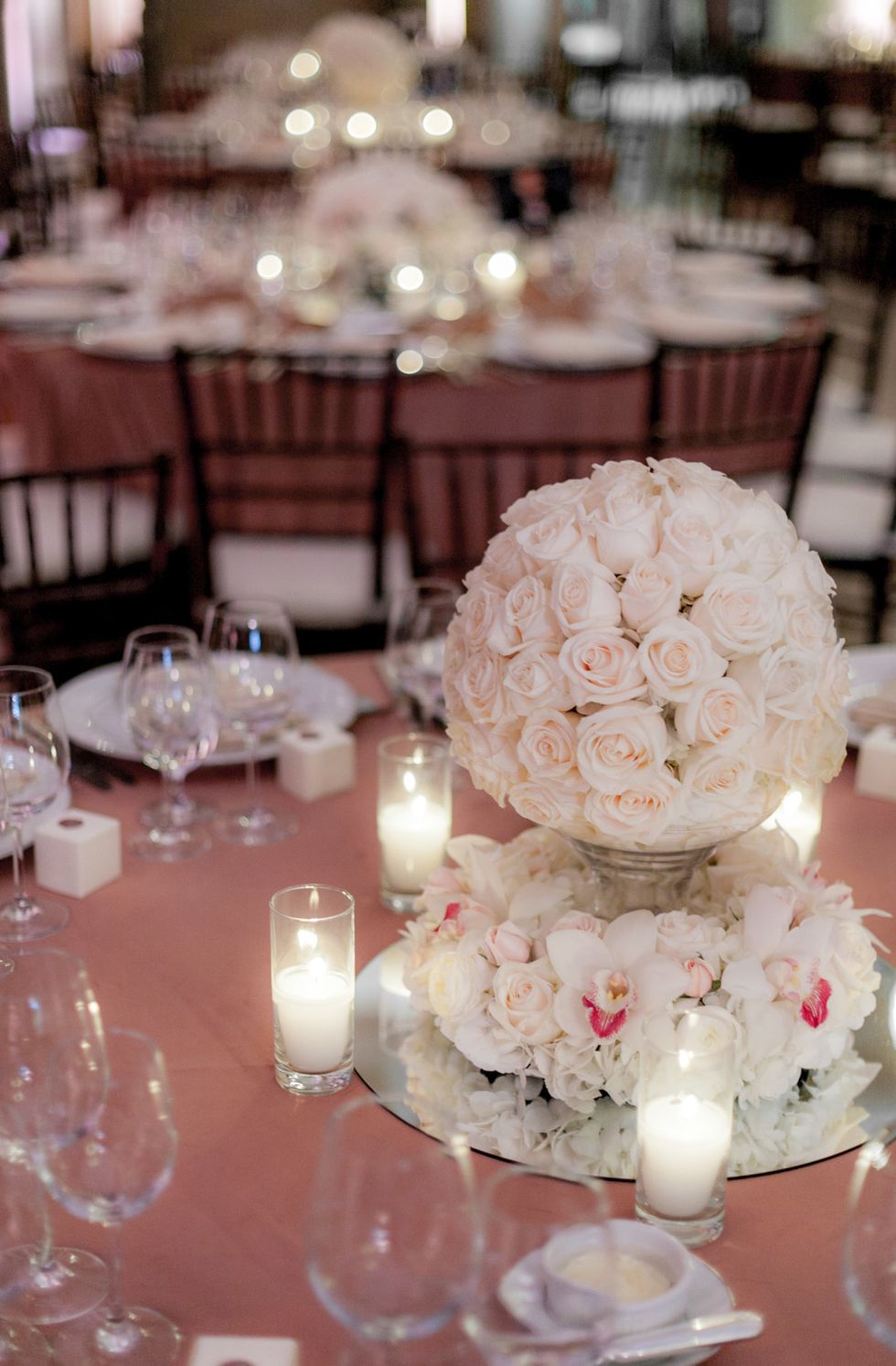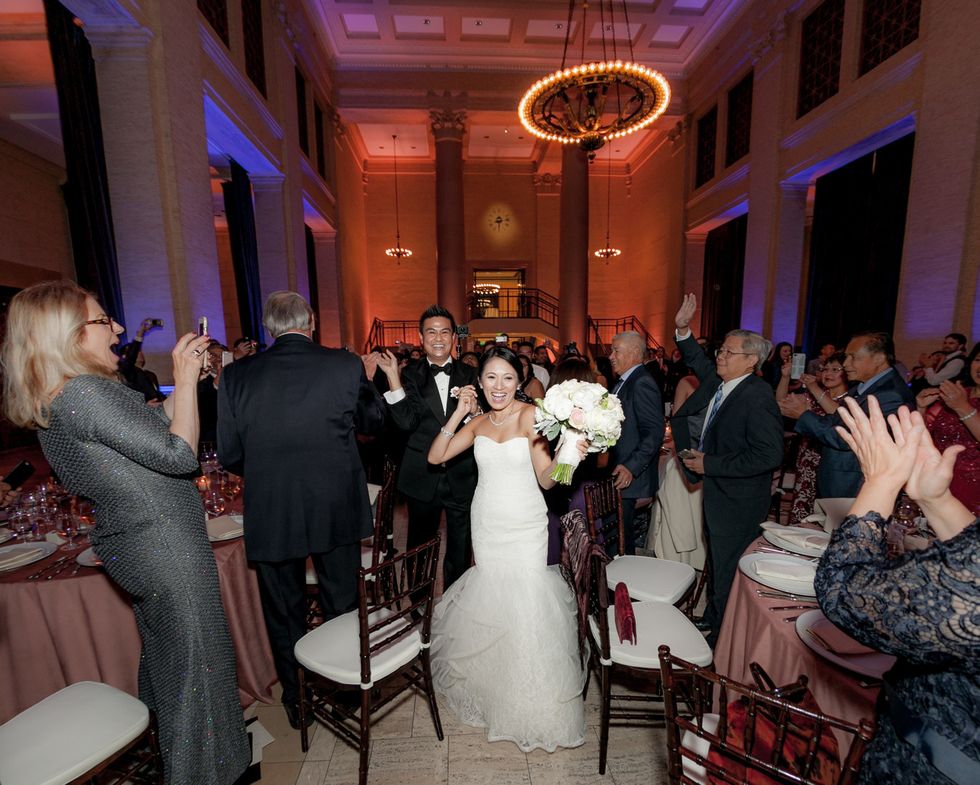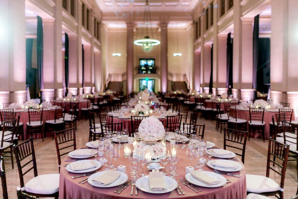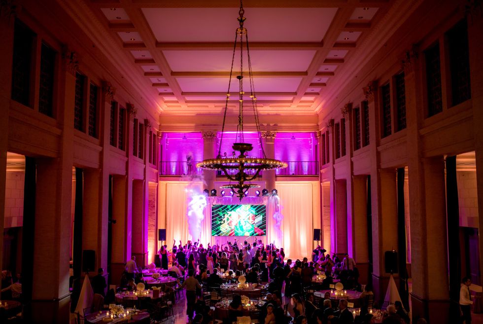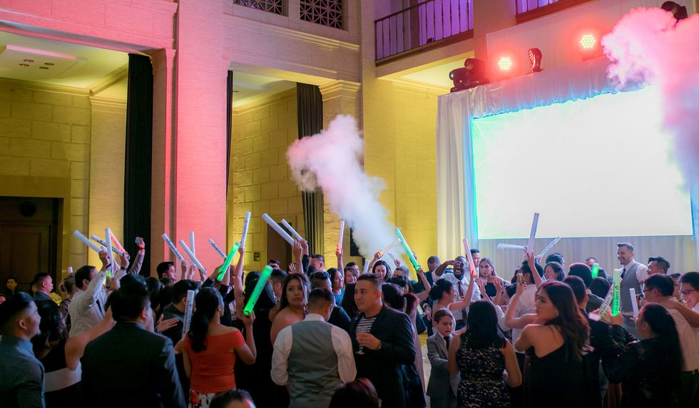 Ready to celebrate, the wedding party made their way to downtown's Bently Reserve, where round tables were covered in lilac linens and set with two-tiered floral arrangements bursting with cream roses and orchids. The space was pimped out to the max and rager-ready with an LED video wall and dance platforms, DMX lighting show, CO2 cannons, custom audio visual products, and all the EDM.