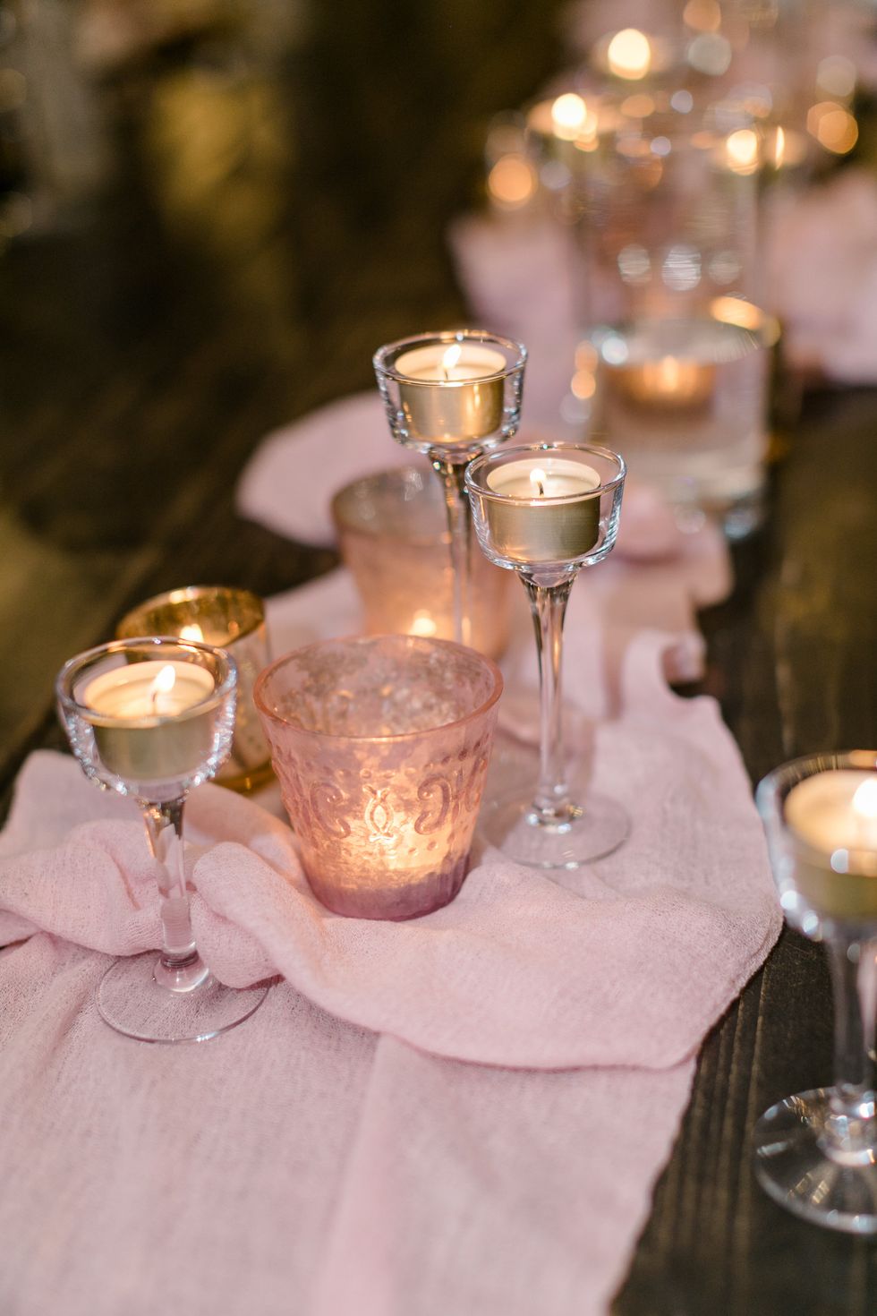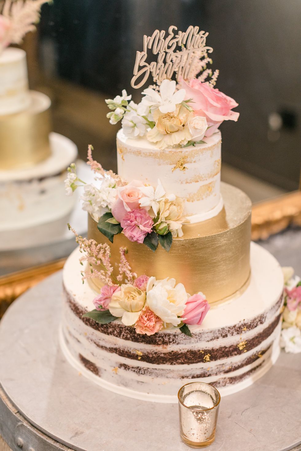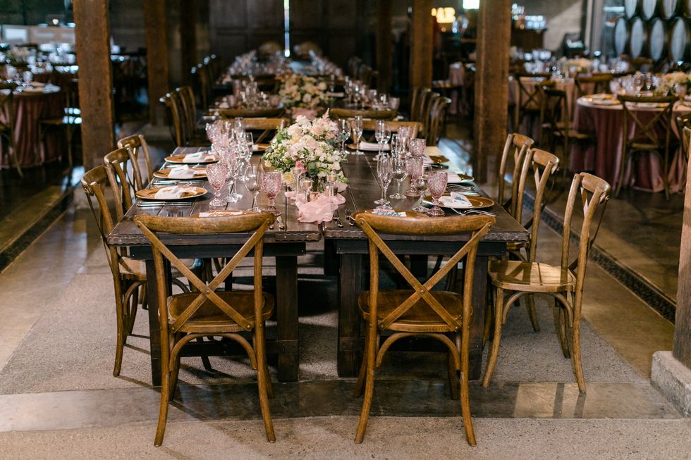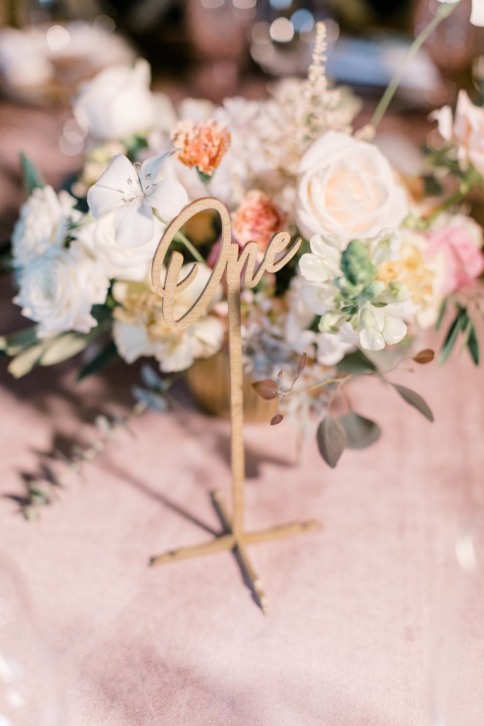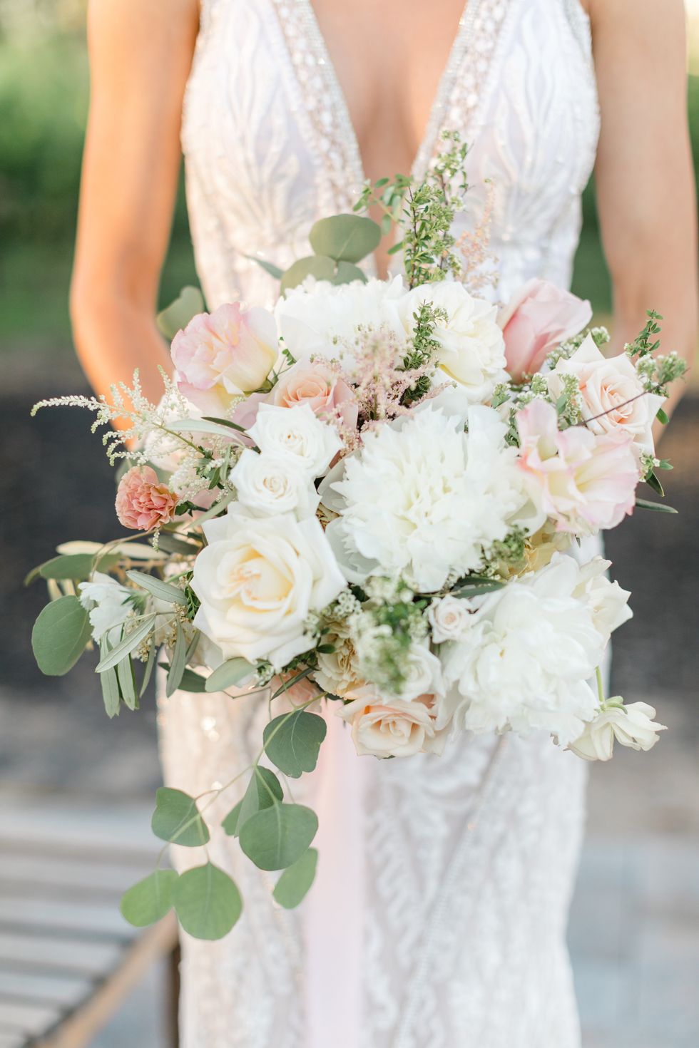 Their event was swathed in a sweet neutral palette, with bouquets of blooming blush peonies, white roses, and eucalyptus. Ivory candles, faceted pink goblets, and touches of gold in the place settings and on the three-layer wedding cake added a bit of sparkle.