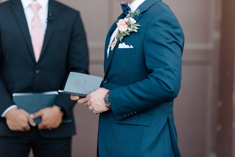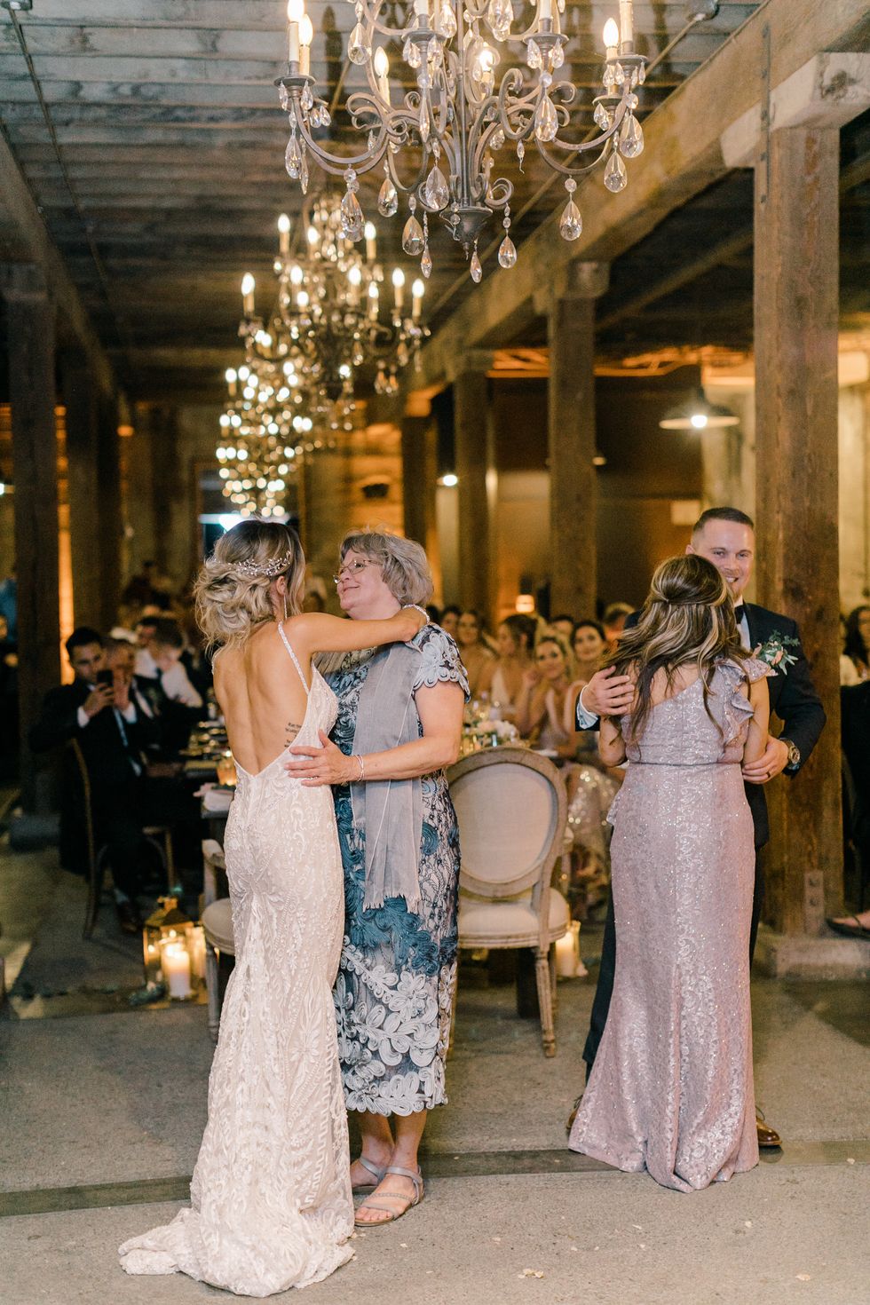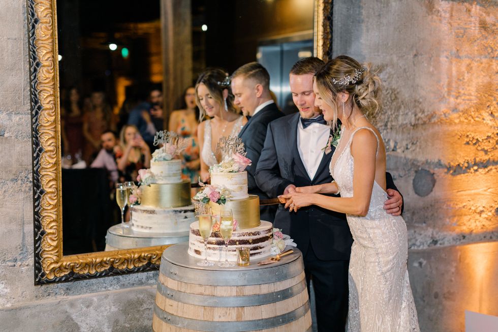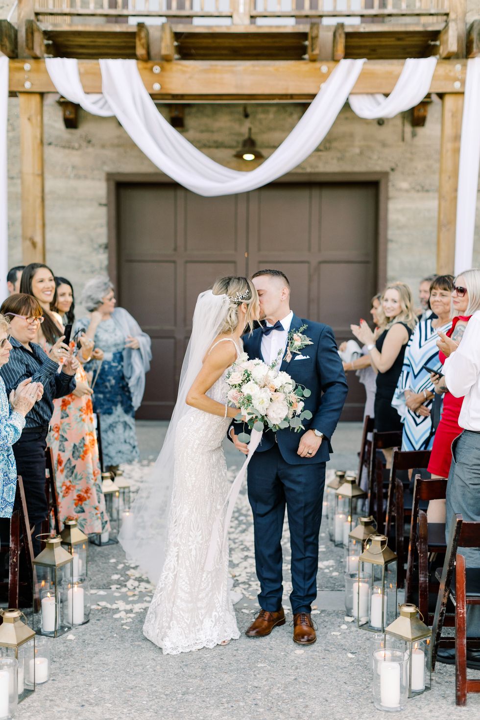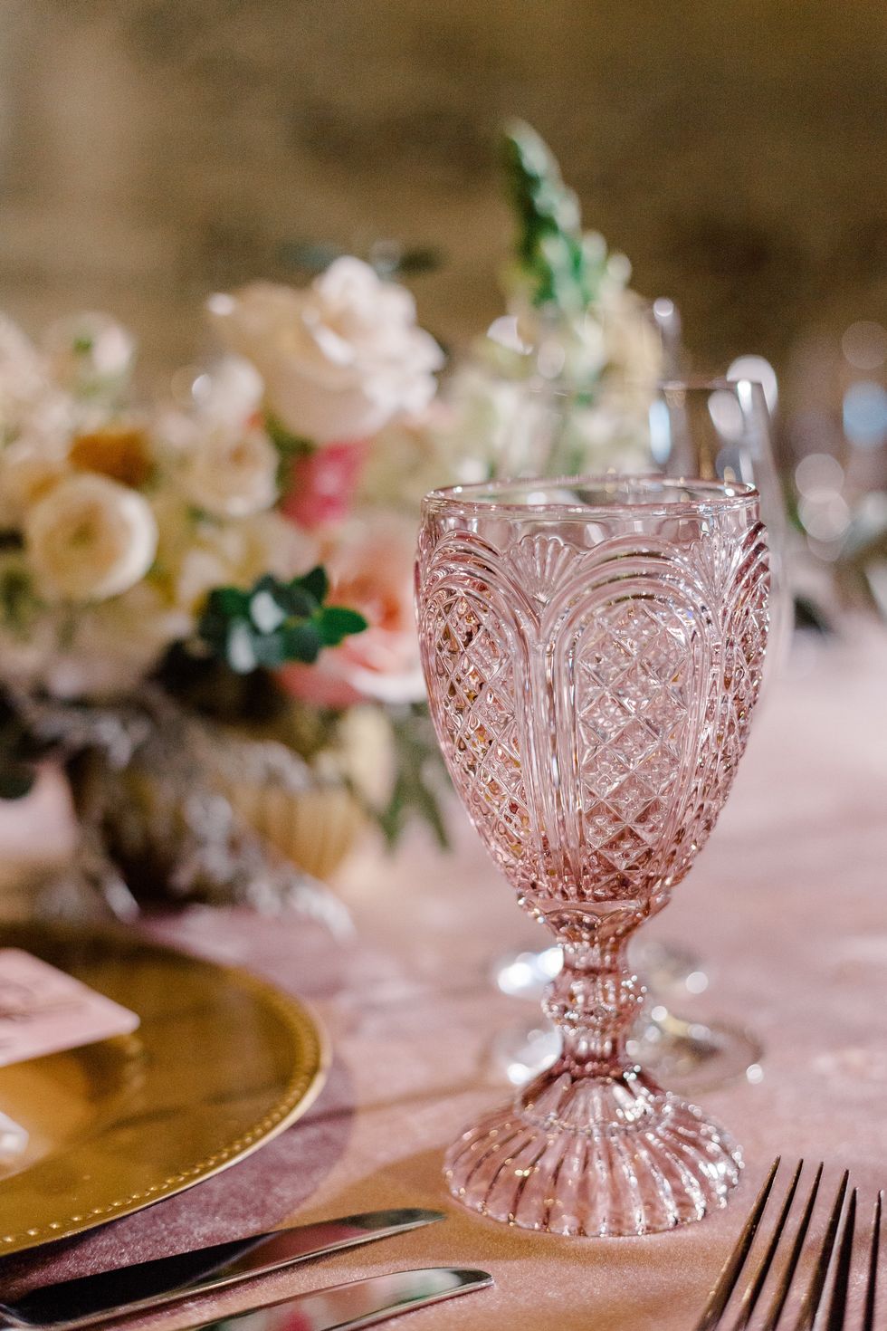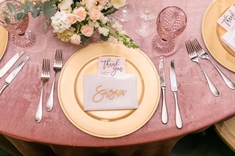 Their event was swathed in a sweet neutral palette, with bouquets of blooming blush peonies, white roses, and eucalyptus. Ivory candles, faceted pink goblets, and touches of gold in the place settings and on the three-layer wedding cake added a bit of sparkle.