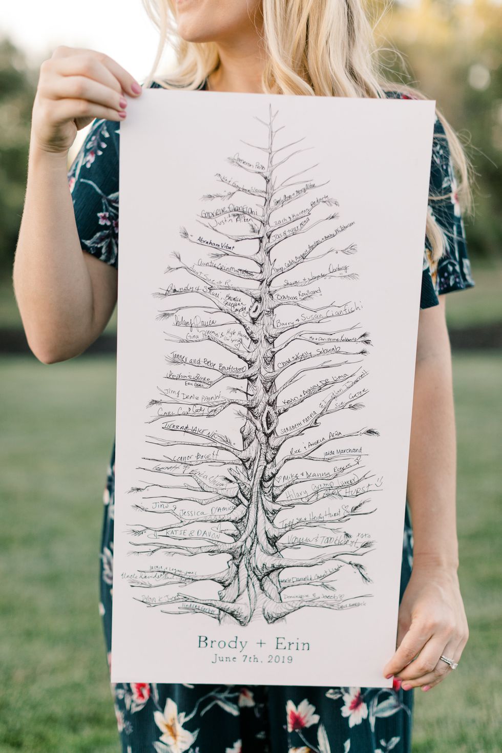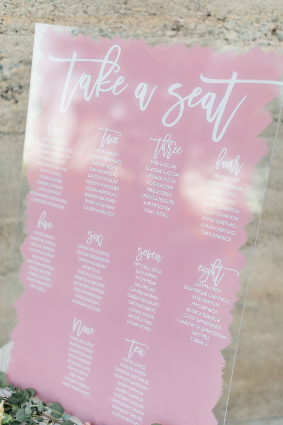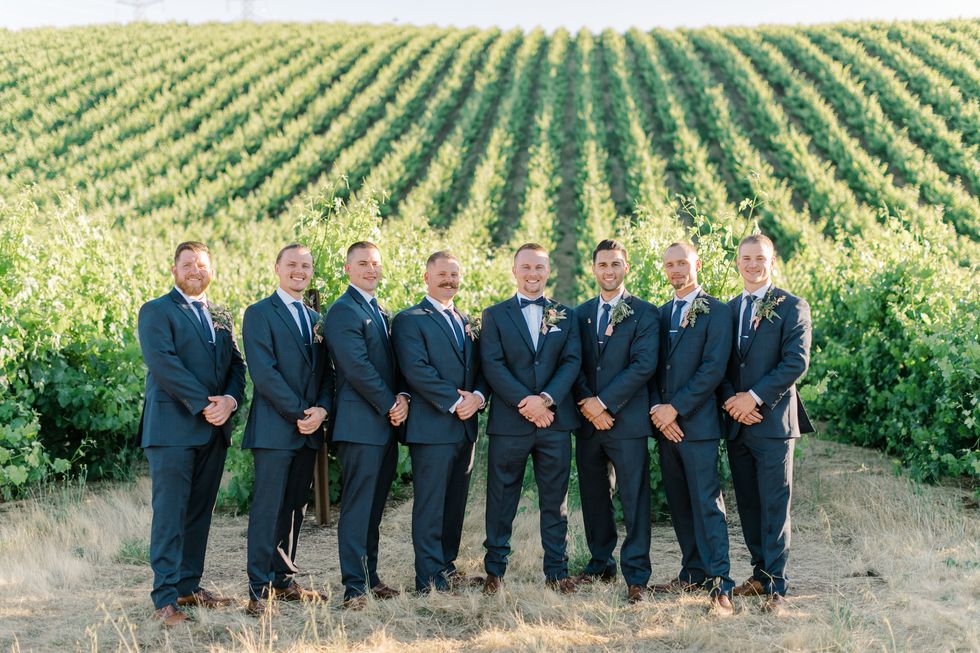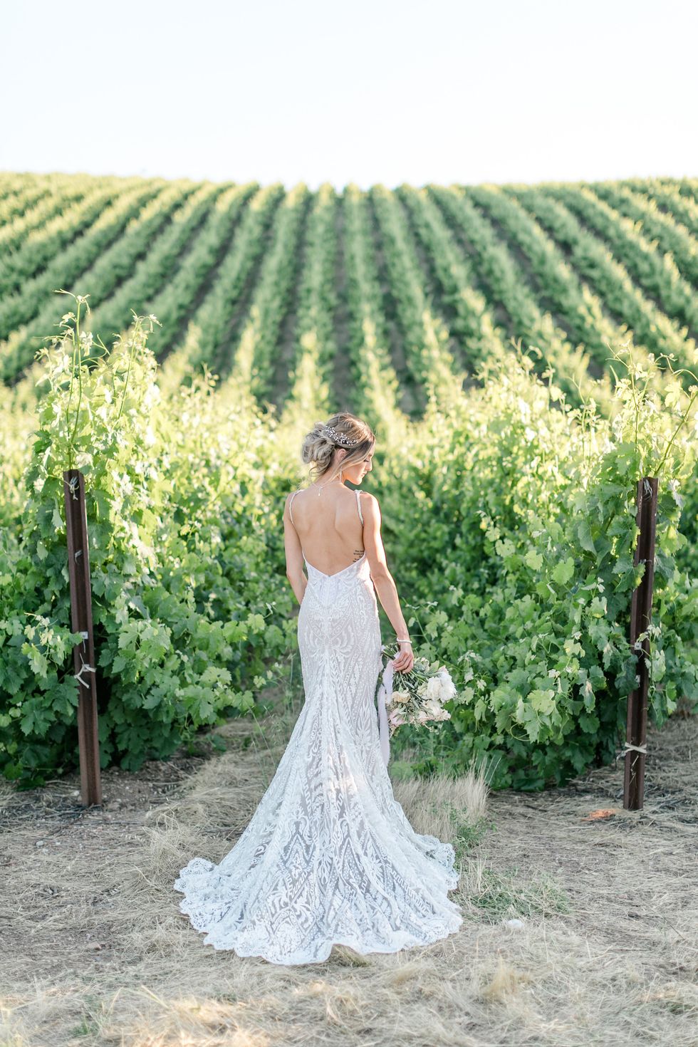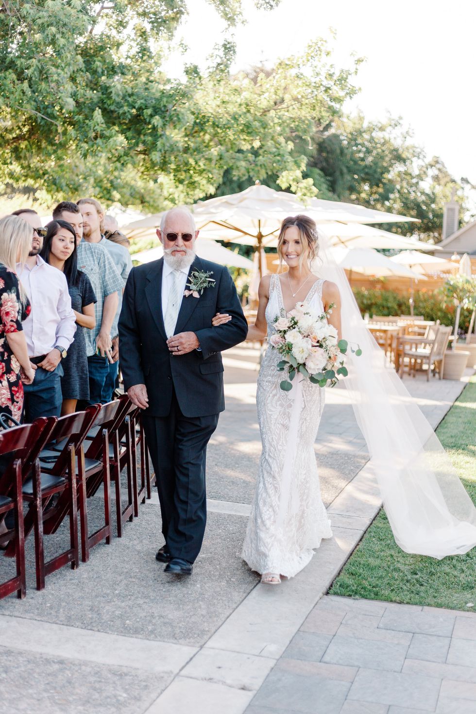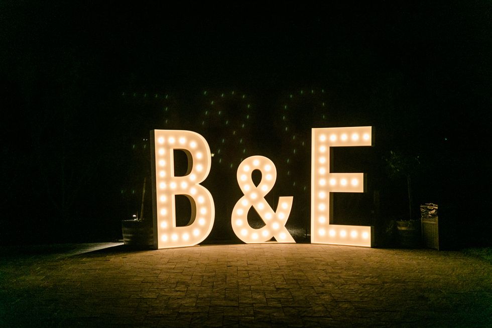 The couple kept with a vineyard theme, selecting Livermore Valley's picturesque Wente Vineyards for their ceremony and reception. A light-up marquee-style sign of their initials announced the event and also served as a remembrance of Erin's late father—the sign was created using his tools; this was his "gift" to them.