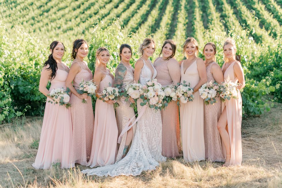 The couple exuded easy California glamour, Erin in an embroidered lace gown with a plunging neckline, Brody and his groomsmen in dark grey suits. The bridesmaids' pale pink dresses echoed the florals.