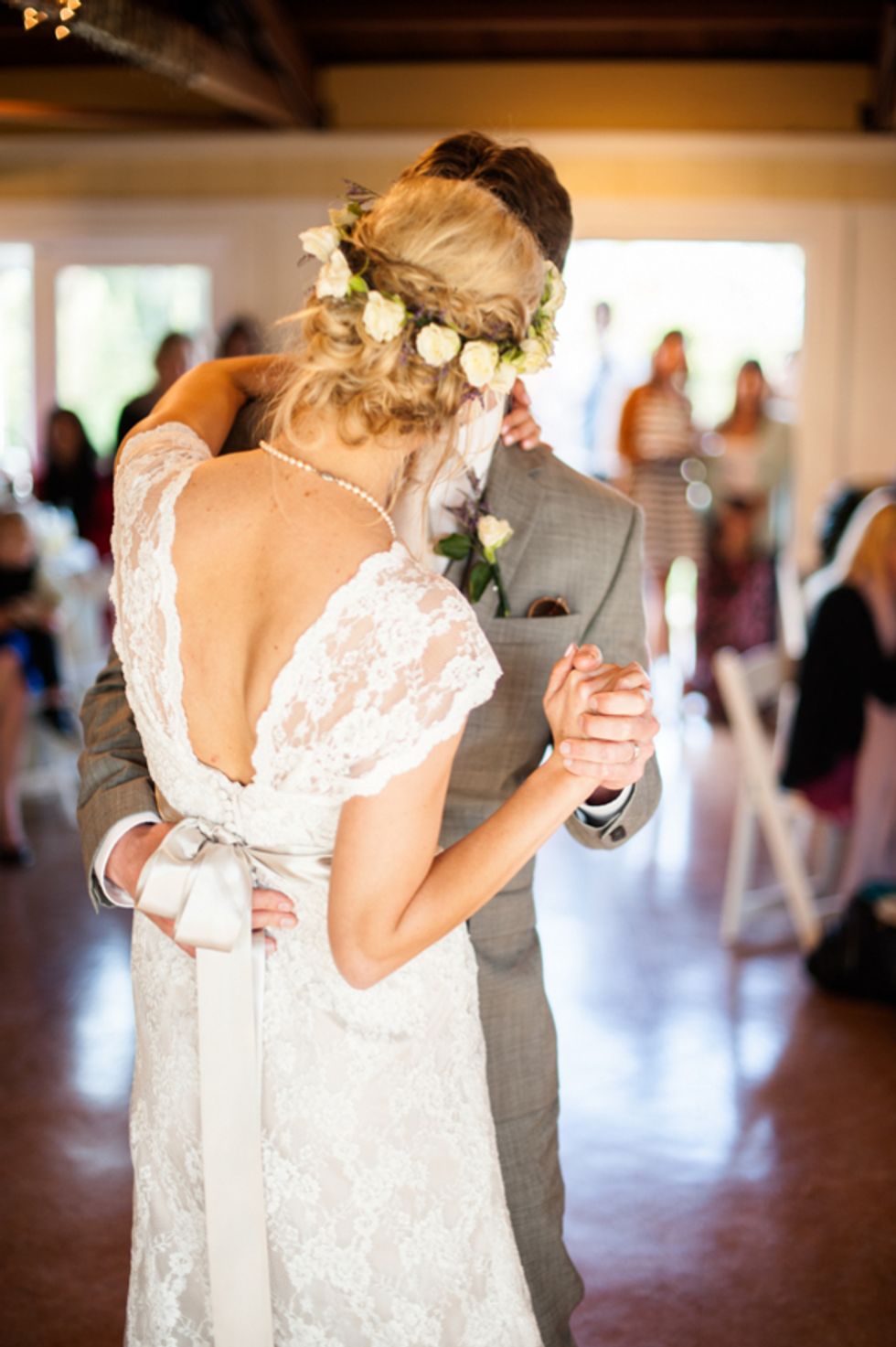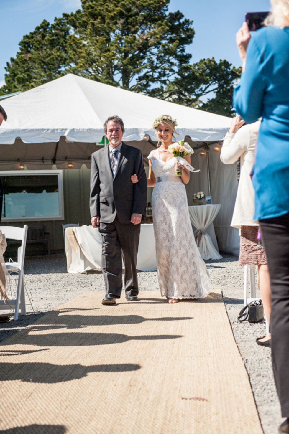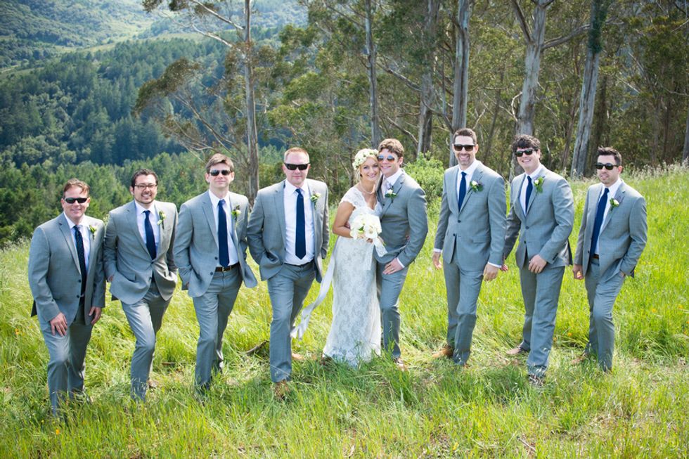 Chelsea and Jimmy's nuptials celebrated nature atop Mt. Tamalpais. The bride looked beautiful in a V-neck lace gown and a flower crown in lieu of a veil. Her bridesmaids wore contemporary matching blue-and-white striped, knee-length dresses.