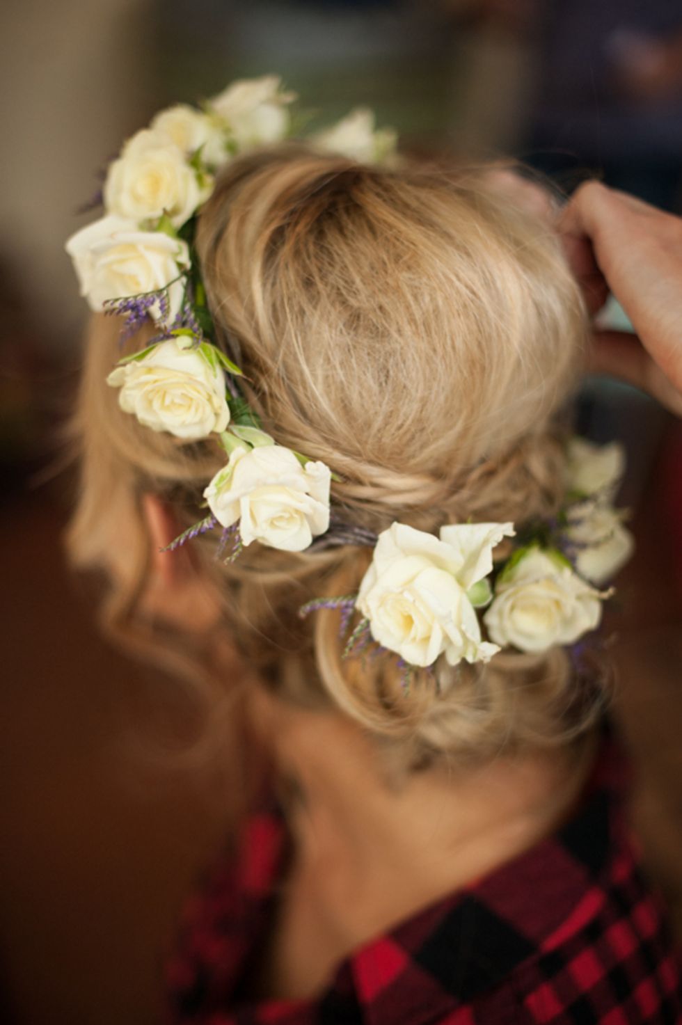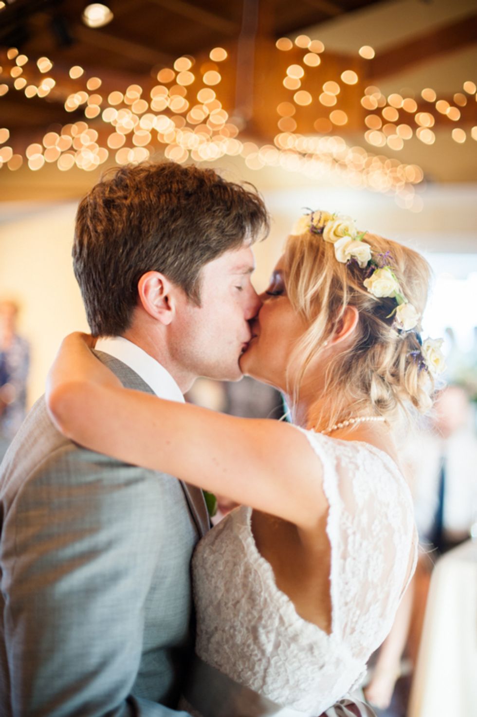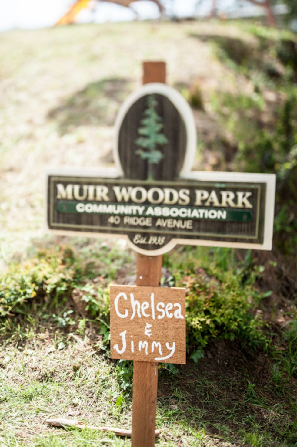 Chelsea and Jimmy's nuptials celebrated nature atop Mt. Tamalpais. The bride looked beautiful in a V-neck lace gown and a flower crown in lieu of a veil. Her bridesmaids wore contemporary matching blue-and-white striped, knee-length dresses.