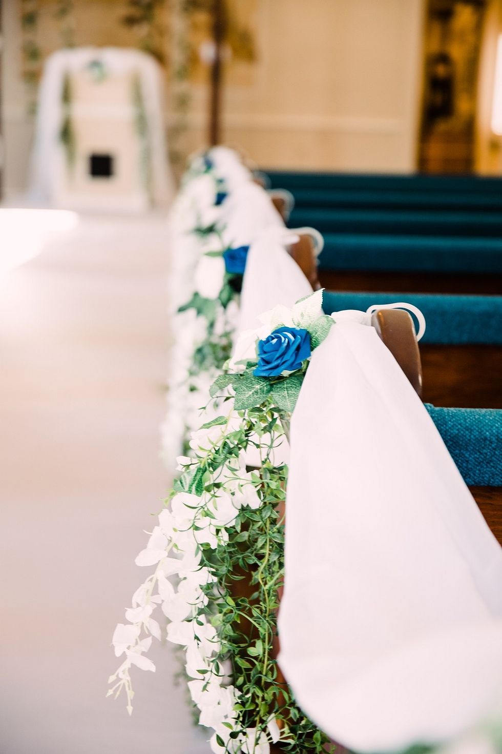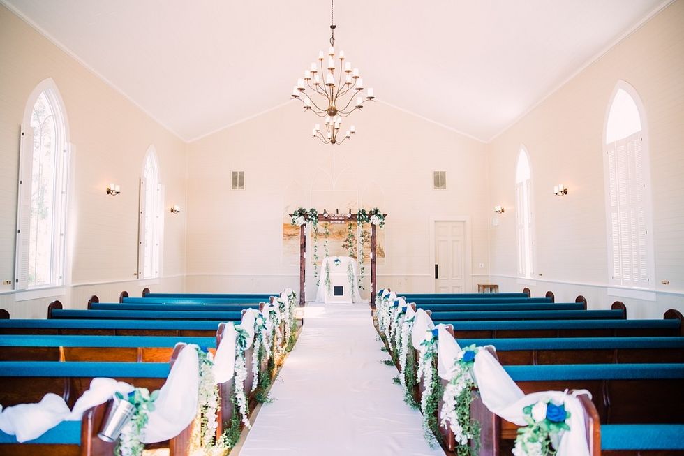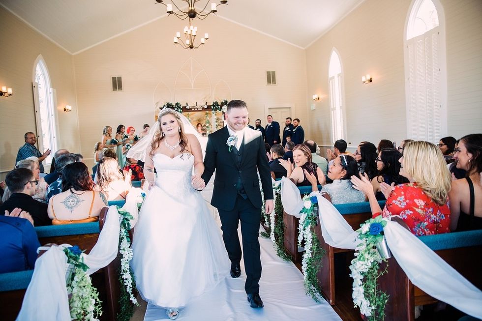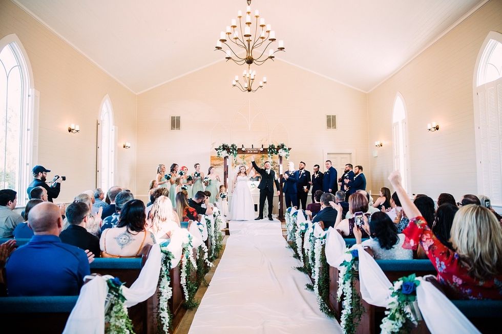 Nestled in the historic Quarry District and built in 1883, the quaint church with tall, arched windows was beautifully restored in the early 2000s with teal velvet upholstery on the wooden pews and chandeliers overhead. On top, a bell is rung when couples say "I do."