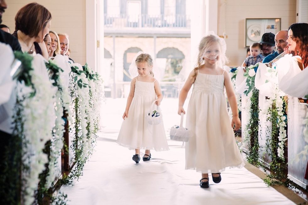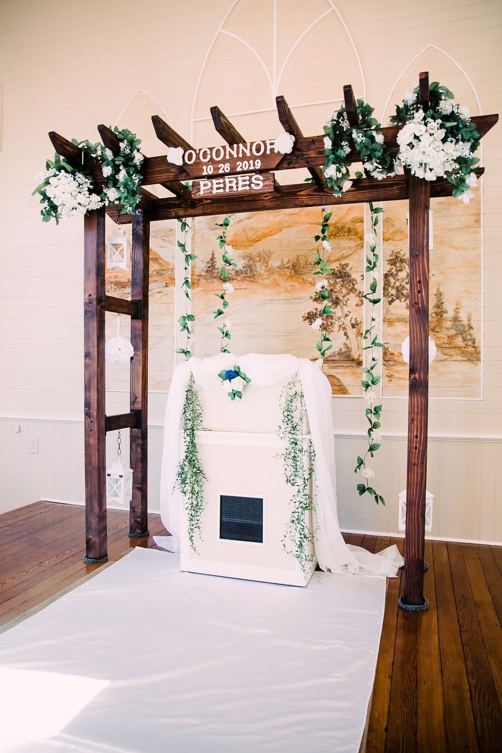 The wedding arch was sawed and polished specially for their big day and personalized with their last names and the date. Perched atop were blooms bursting from the corners as well as hanging down to form a romantic backdrop for the ceremony. Tulle and hanging florals floated from one row of pews to another forming an enchanting aisle.