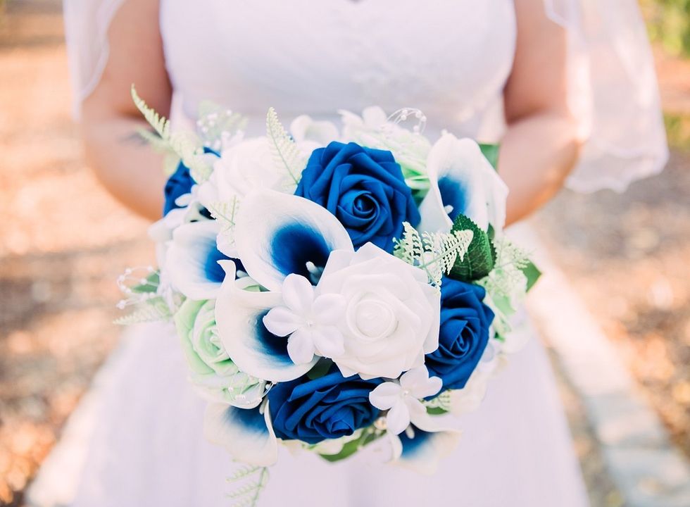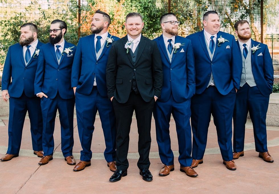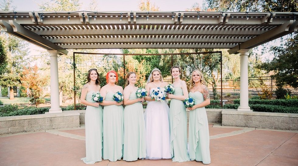Peres and O'Connor's families came together to create this wedding's decor by hand. They designed all the floral arrangement in a bold blue and white palette (which also matched the groomsmen's attire). With matching bouquets in hand, the bridal party wore sea foam green floor-length frocks.