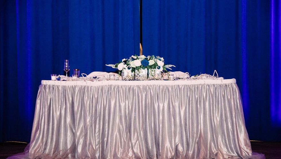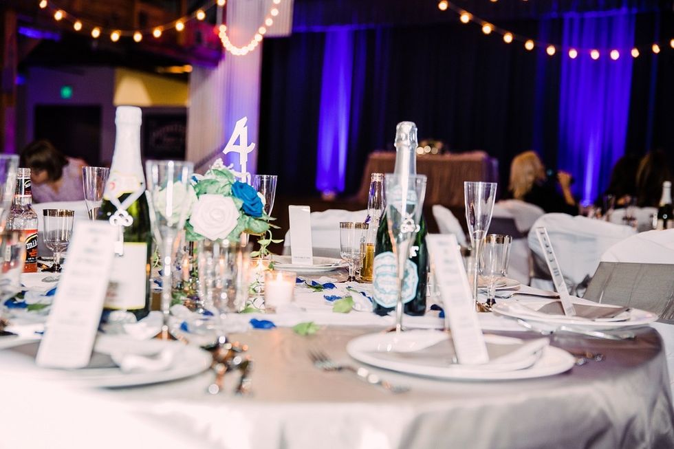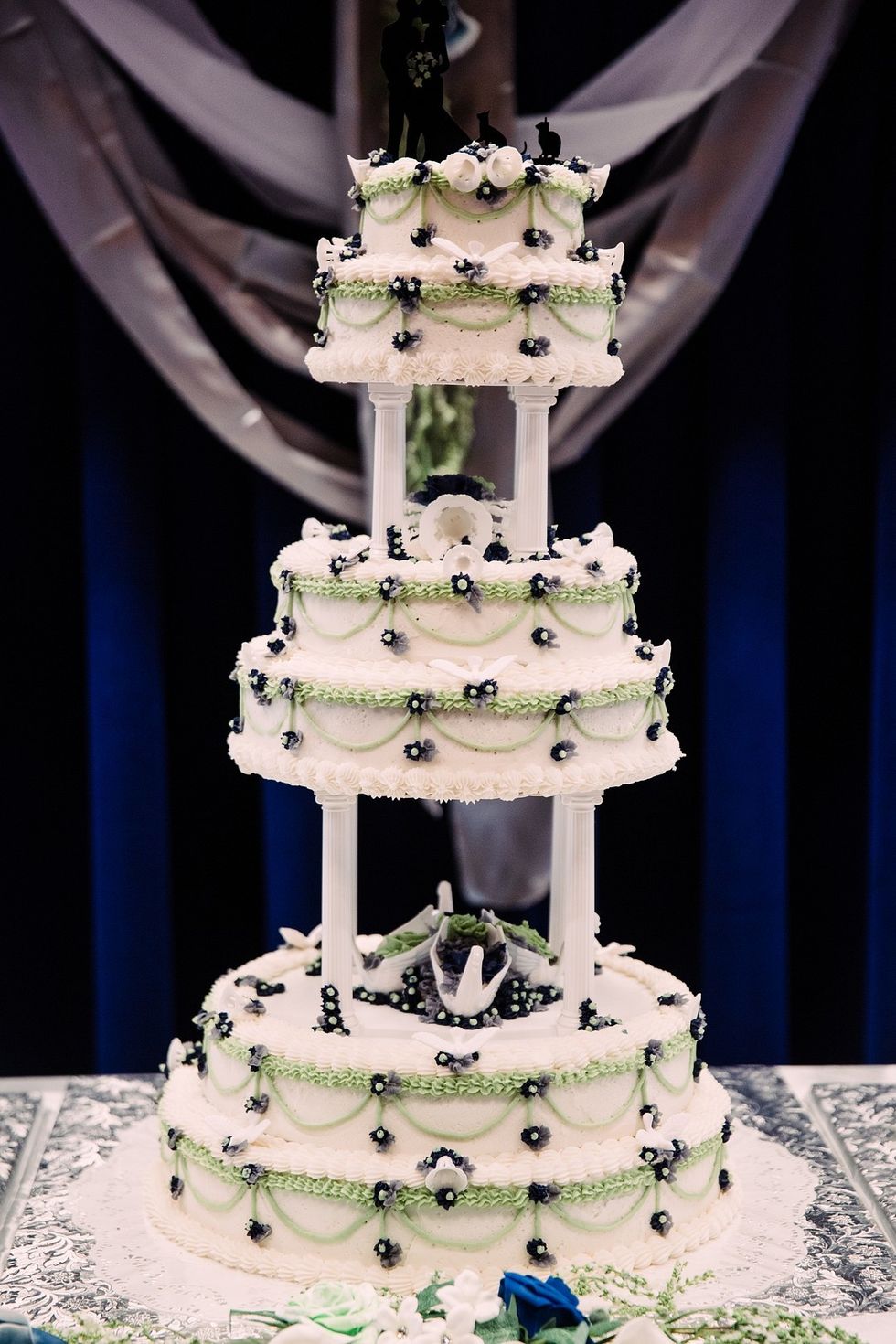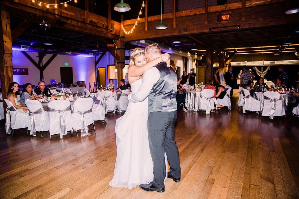 Leaving the country setting behind after the ceremony, the party made its way to the Blue Goose Event Center in Loomis to kick off the reception. In a departure from the quaint ambiance of the old chapel, Blue Goose takes on an industrial aesthetic, clad in steel and wood. Personal touches included DIY table arrangements in the same indigo hue and even a three-tiered homemade cake complete with swans and handmade roses. String lights overhead topped off the sense of romantic charm.
