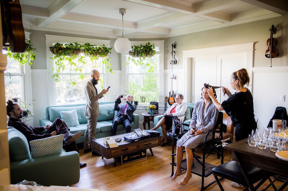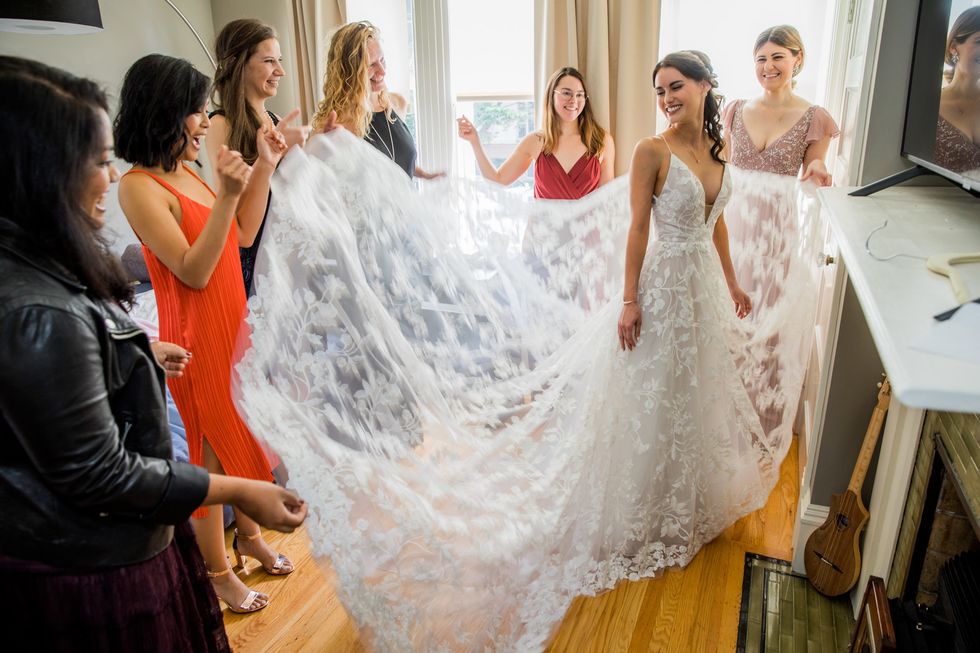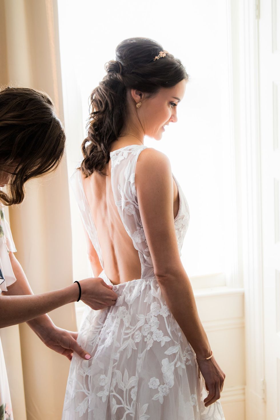 Keeping it intimate, the two got ready together at their apartment. His parents and their closest friends came over for breakfast and mimosas while she got her makeup and hair done. "It was wonderful to be able to have that experience with everyone because we kept our wedding party really small—just my sister as maid of honor and his best friend as best man."