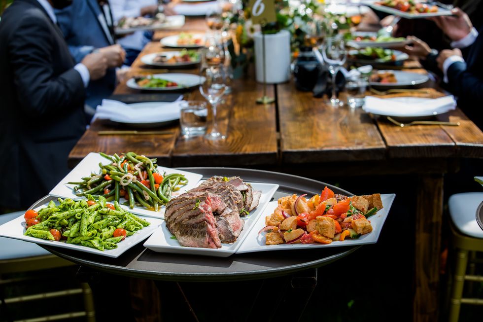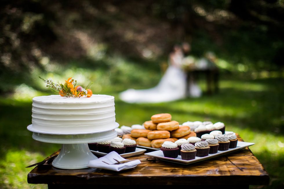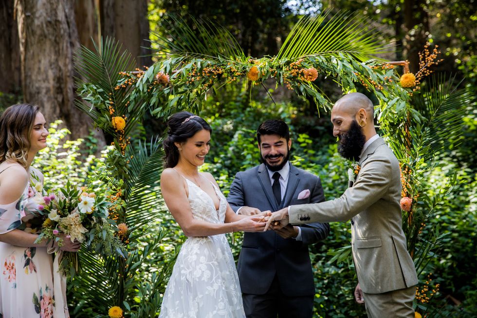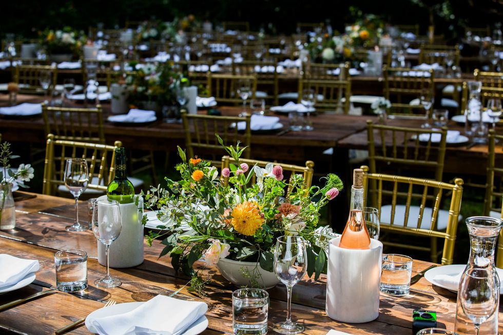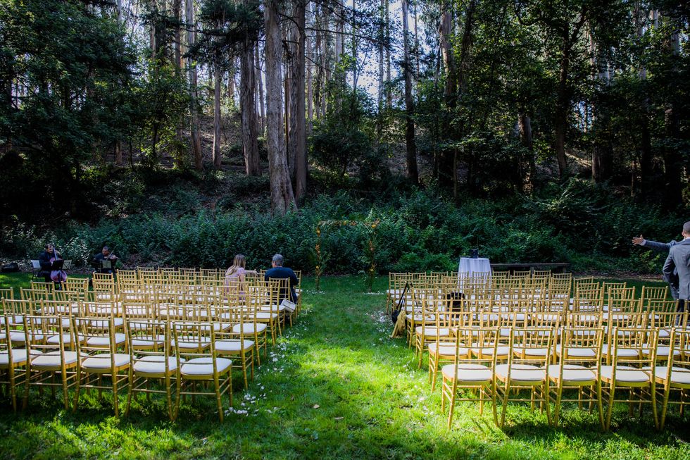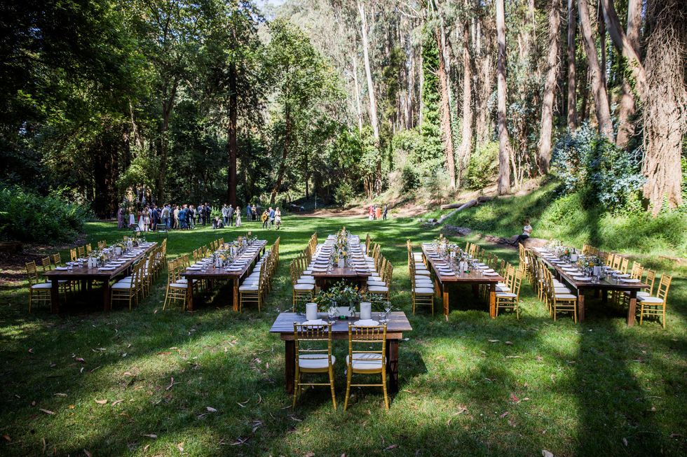 In what they describe as an "organic, relaxed, and elegant vibe," they highlighted the beauty of the redwood grove and clearing outside Stern Grove Trocadero clubhouse with flowers, dark wood tables, and gold chairs and flatware. Each of their mothers read during the ceremony and they incorporated a number of DIY and multi-purpose elements. Their planner arranged a wood coffee and tea bar with small floral highlights in the grove for guests to enjoy before the ceremony; this became a mimosa bar for cocktail hour.