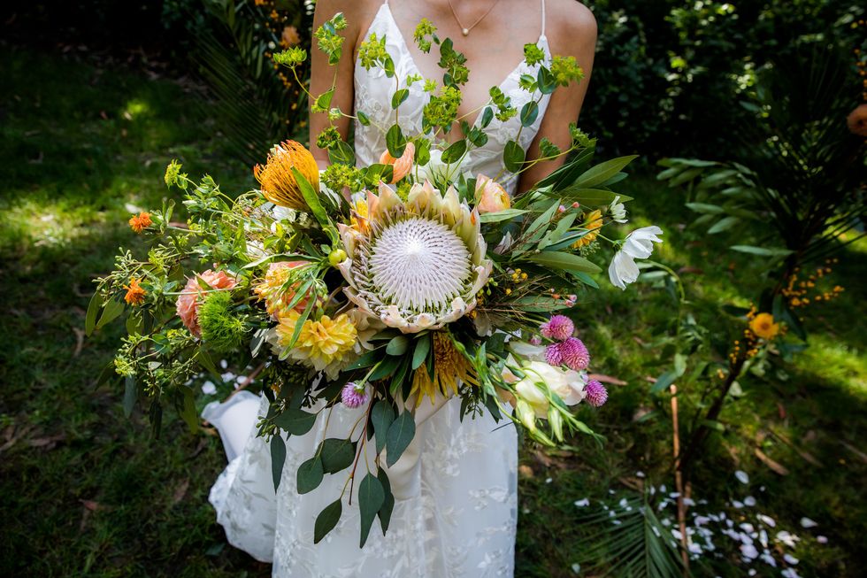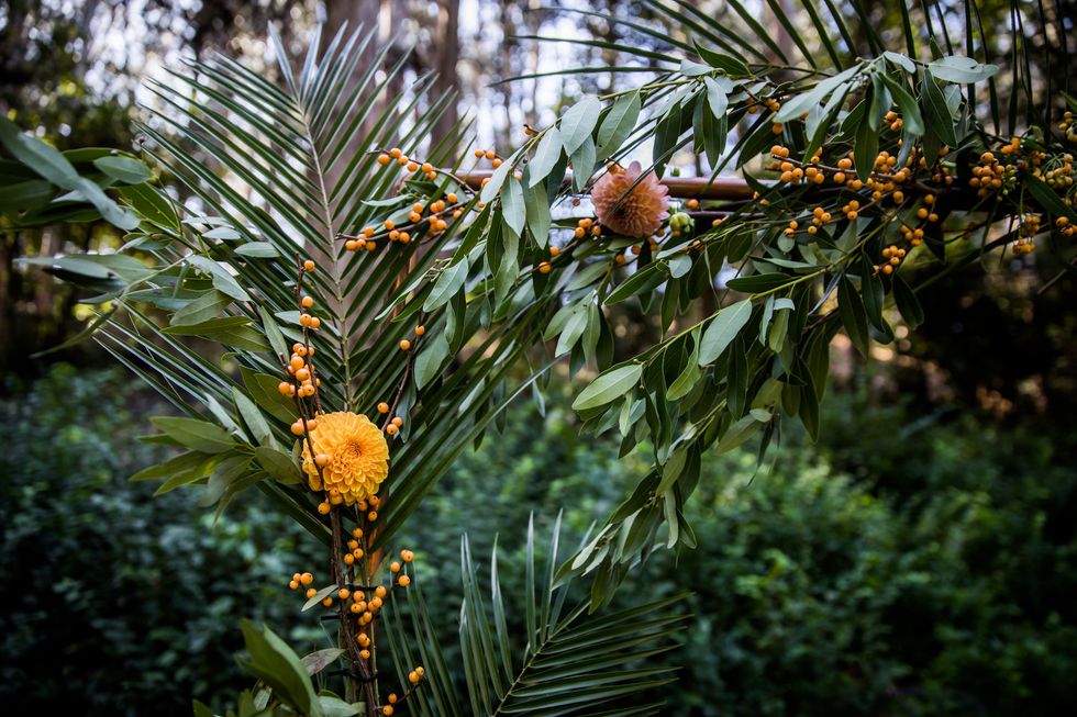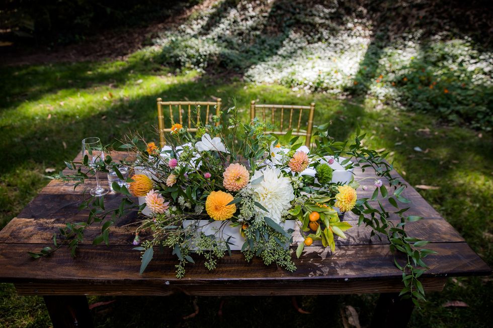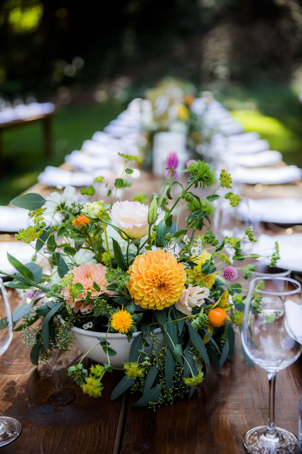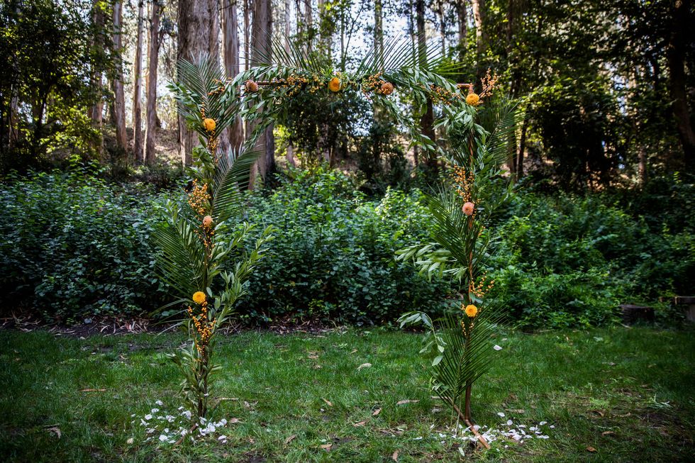 In the clearing, the couple gathered with 115 guests, all seated in gold Chiavari chairs, beneath a rectangular arch adorned with lush blooms and foliage; their friend officiated. Afterward, everyone enjoyed brunch at tabled decked with florals. "The colors were directly inspired by the color of the leaves and bark of the redwood and eucalyptus trees in the grove and the California Golden Poppies that grew underneath them," Laura explains.