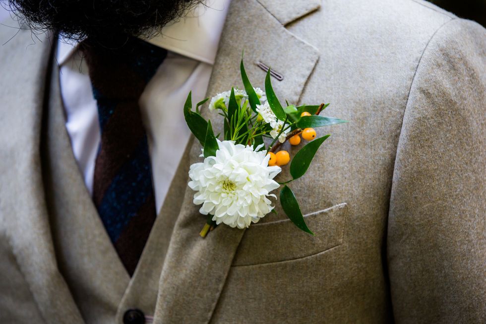 Laura wore a Haley Paige's Fleur de Lis lace, open-back ballgown with a plunging neckline, full train, and organic floral patterning. "I put it on and immediately felt like the most elegant forest queen," she says. She crowed the look with a simple tiara that she already owned and comfortable Toms rose gold suede and leather Poppy sandals. Francesco rocked a bespoke tweed three-piece suit inspired by late 19th century British attire. A custom blue and burgundy accent tie and blue suede shoes tied it all together. While she sported understated jewelry, he accessorized with 24 karat gold one-inch tunnels in his ears and a yellow and rose gold septum piece.