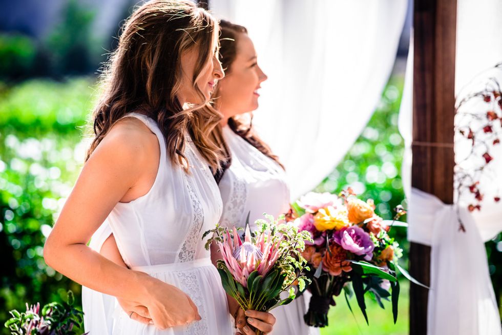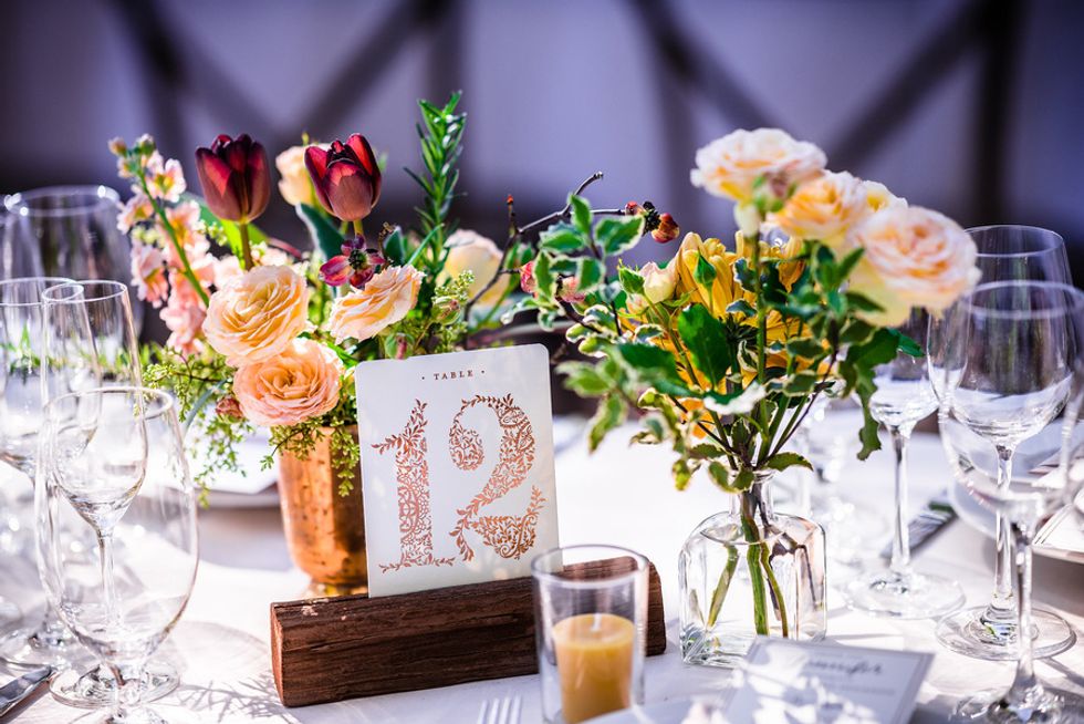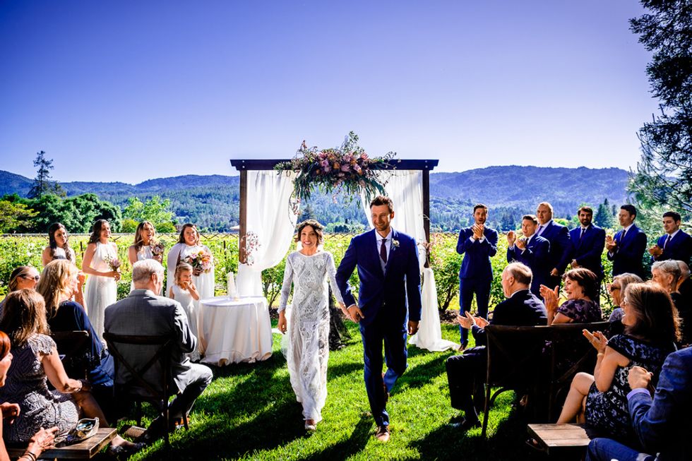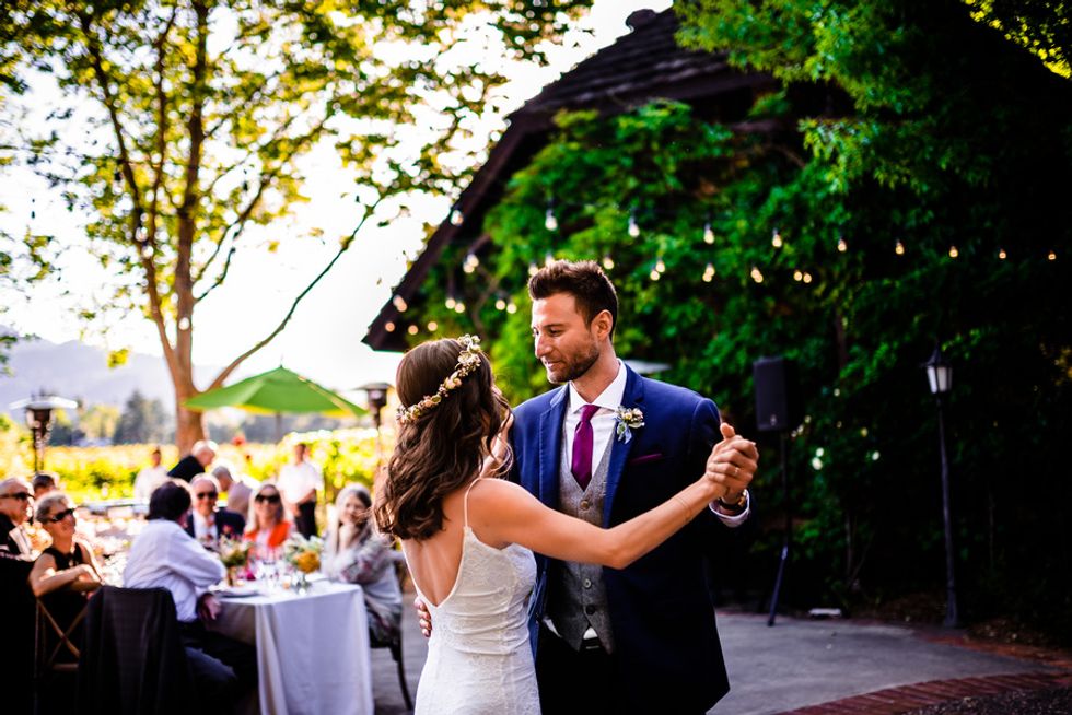 The lovebirds organized the entire wedding themselves, which meant every last detail was personally thought out. Each guest had a menu personalized by a calligrapher; the flowers—vibrant canary and rose blooms—looked stunning juxtaposed against St. Helena's grapevines; and Dominique had not one gorgeous dress, but two (and a second pair of shoes to match, naturally).
