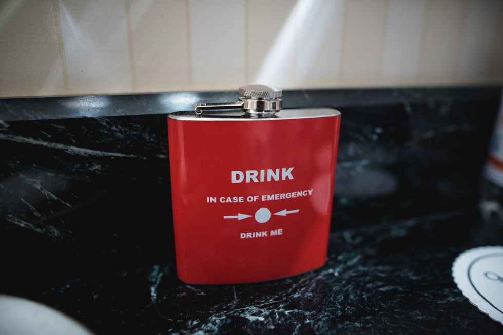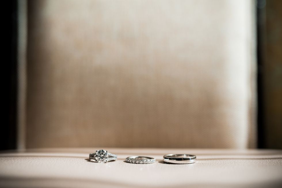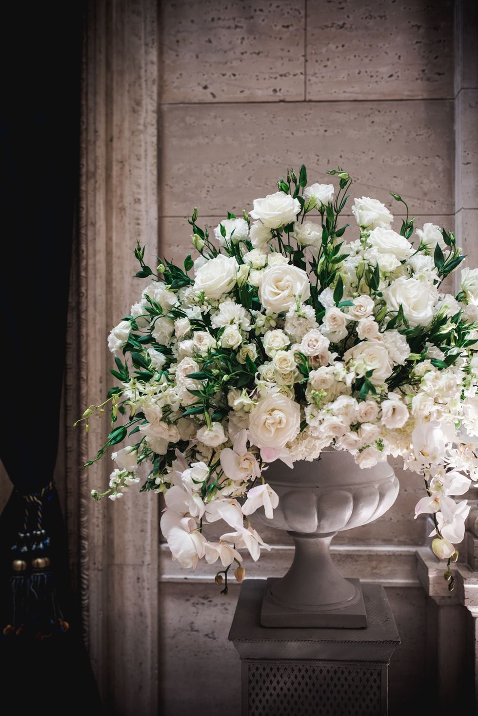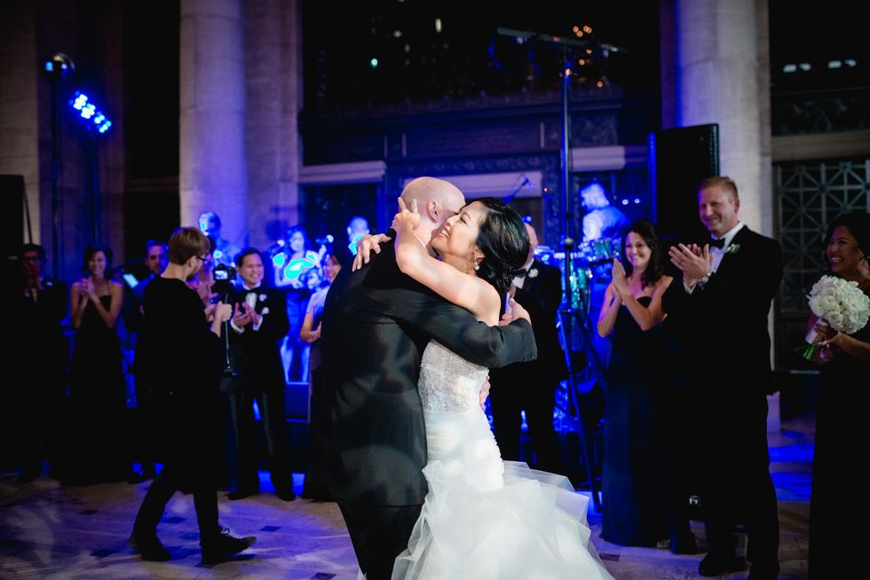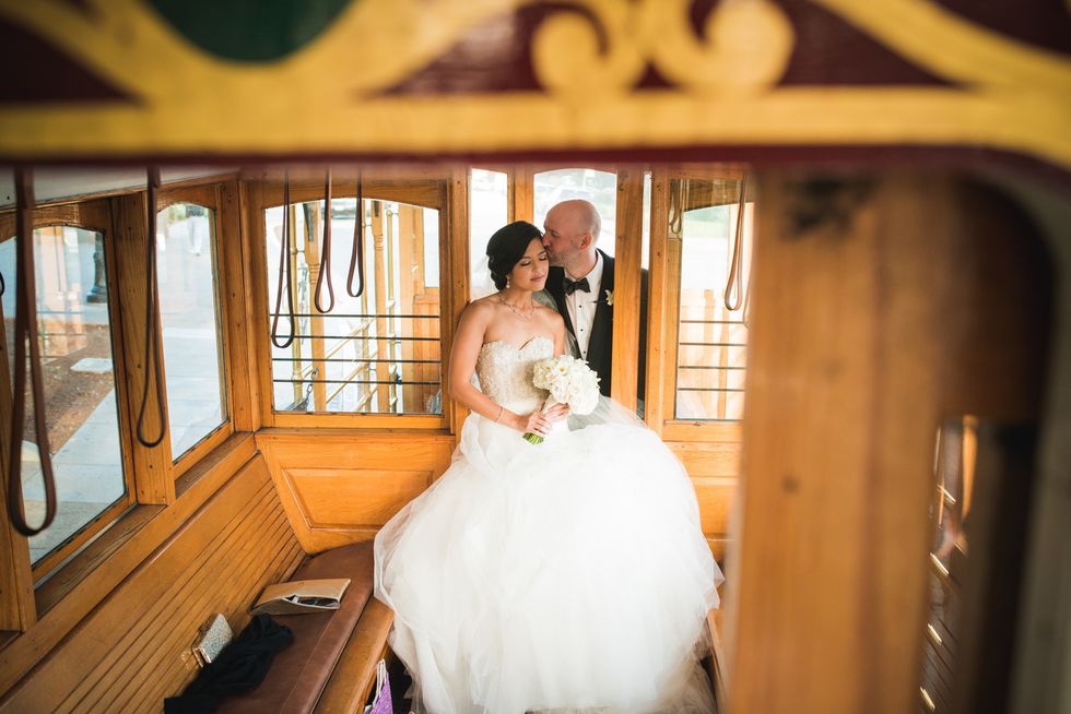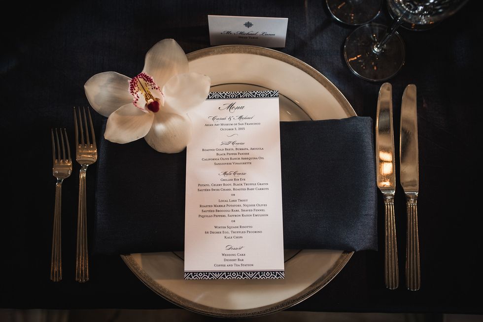 Following the ceremony, there was a trolley ride to Fort Point and to the Palace of Fine Arts for photos before heading to the Asian Art Museum for a black tie reception and dance party. Guests sipped cocktails in the loggia to the sounds of a cellist. To add a touch of romance, they added pillar candles and mirrored signs describing their signature drinks. Afterwards, the navy drapery covering the double doors of Samsung Hall were opened, and guests were escorted inside to dine and dance amid travertine marble columns and walls, a cathedral ceiling with a chandelier, and rich architectural details.