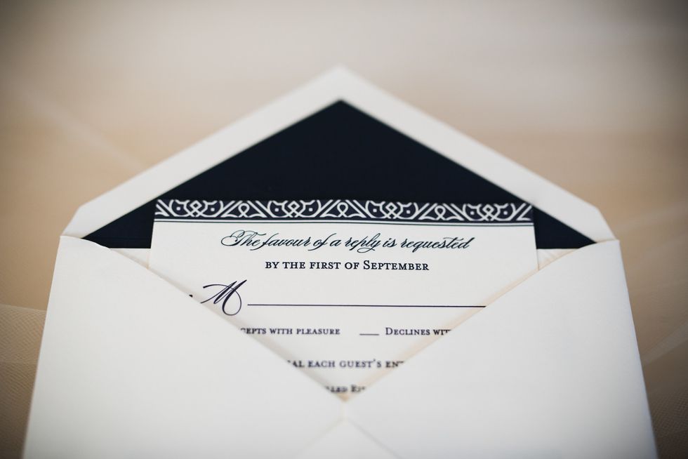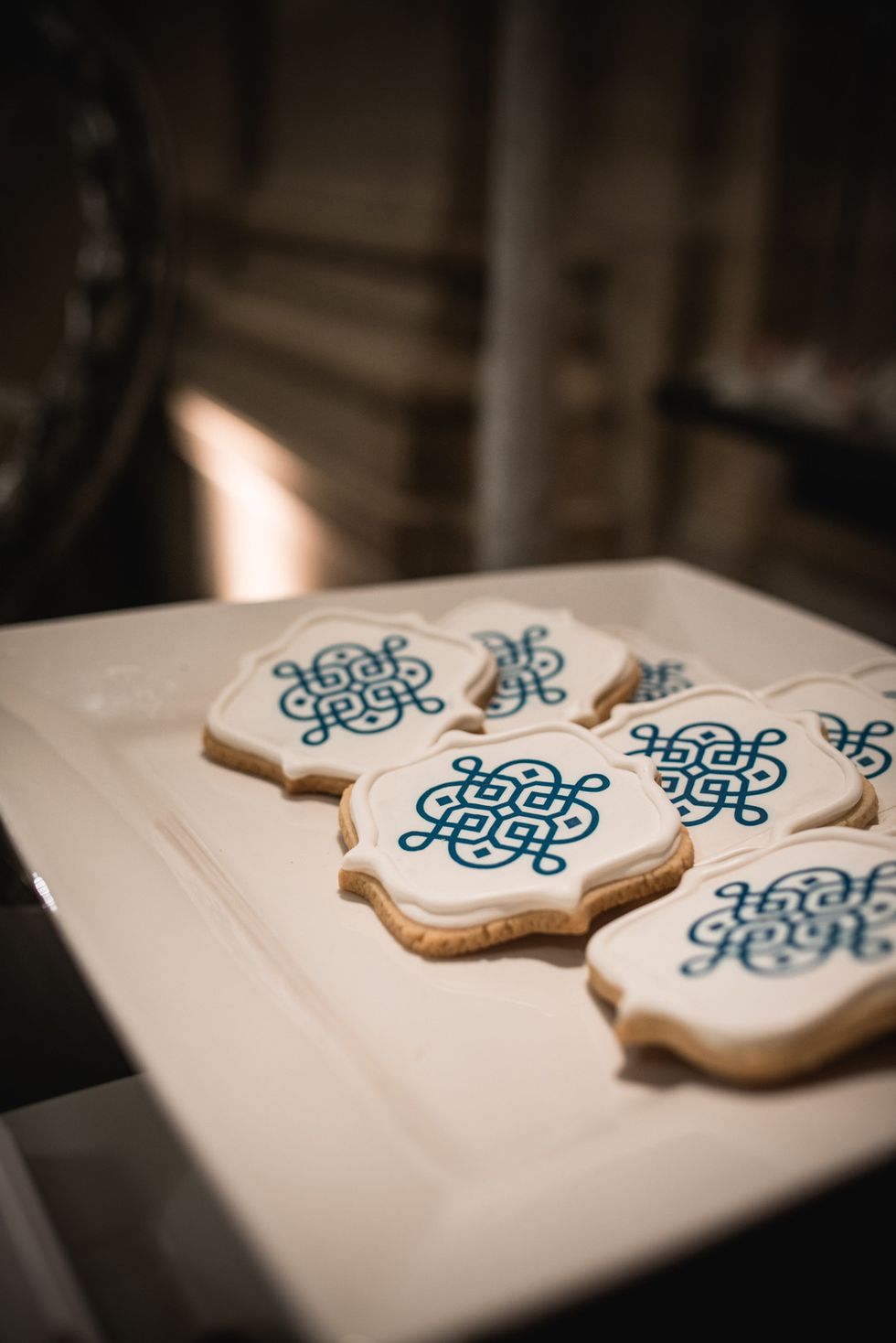 Deep shades of navy blue (Carah's favorite color) swathed the space, softened by lush creamy florals and French blue accents. With the help of a local graphic designer, a geometric pattern they fell in love with at a fabric store made its way into the lattice border of their letterpress invitations, ceremony programs, menu cards, cocktail napkins, and even the cookies on the dessert table. "Using this pattern was a fun and creative way to put a personalized, unique stamp on our wedding day."