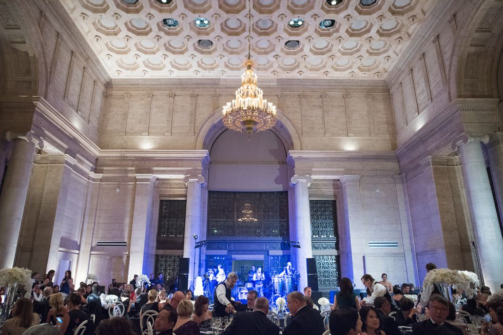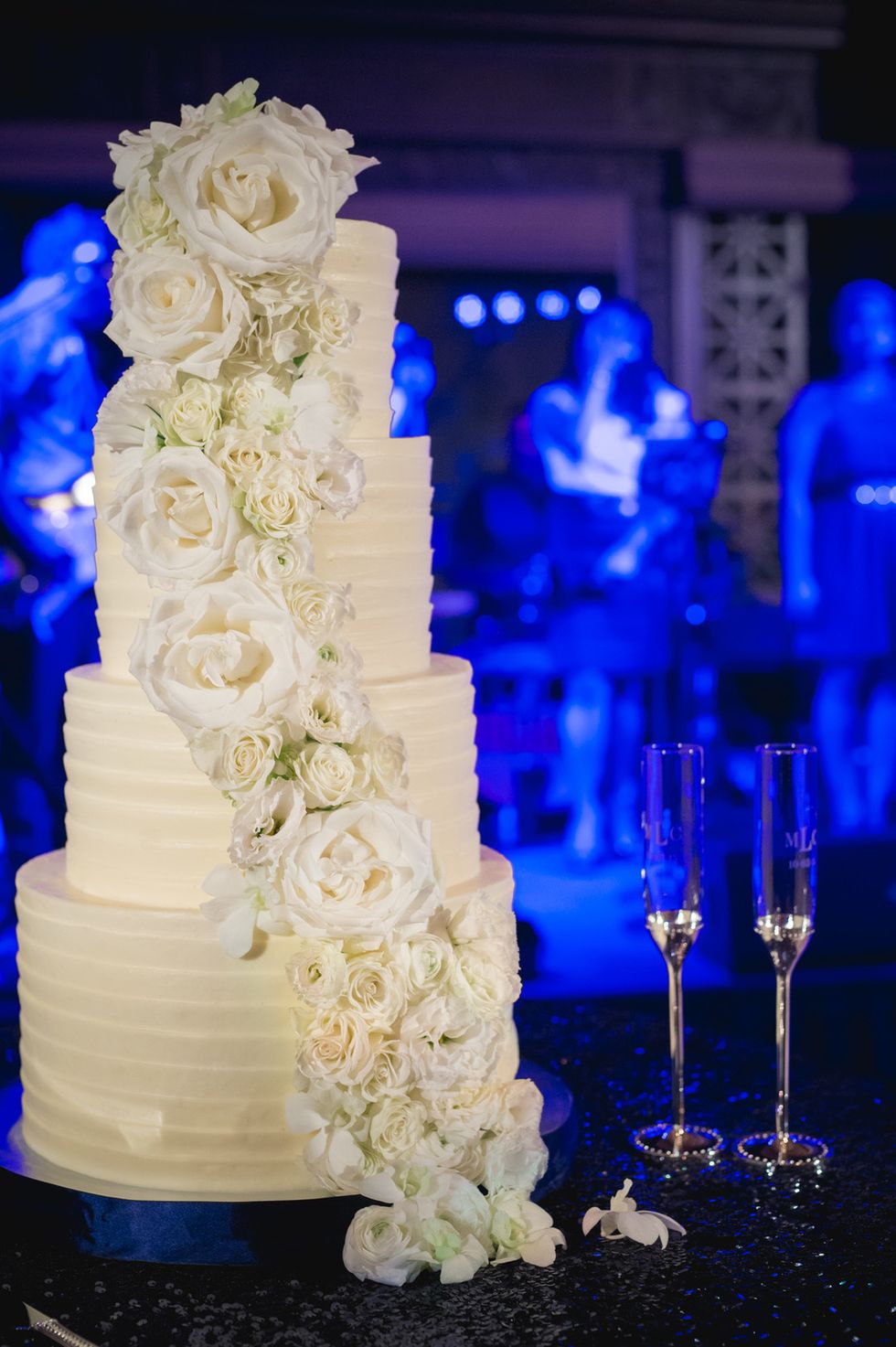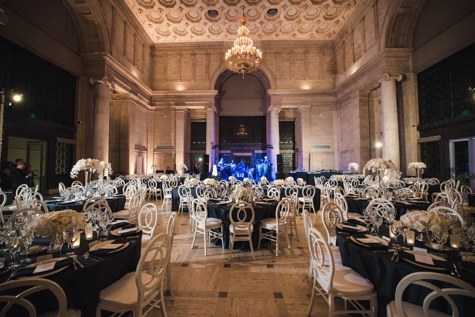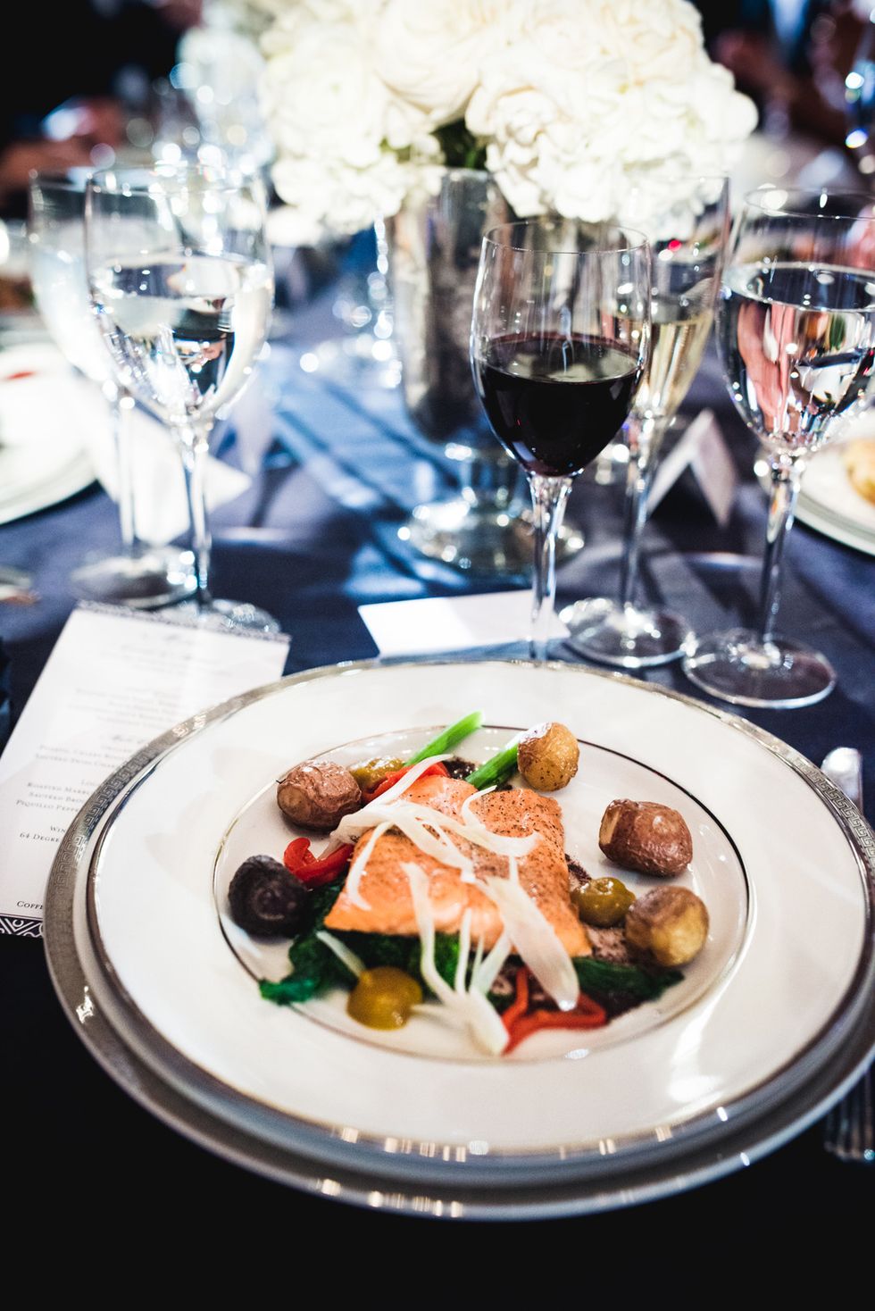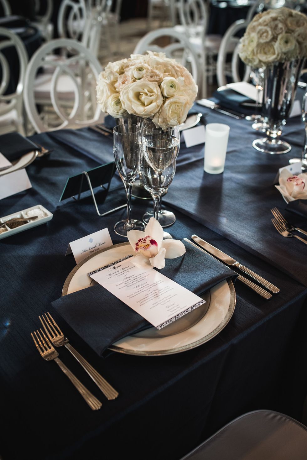 They wanted to allow the space to shine on its own, adding just a bit of soft, amber lighting to create a warm glow. Navy linens were paired with white chairs, and floral centerpieces with glass pedestals held snowy orchids, hydrangeas, and garden roses. After a formal sit-down dinner and speeches, guests noshed at the dessert bar with a sailboat groom's cake and danced until midnight.
