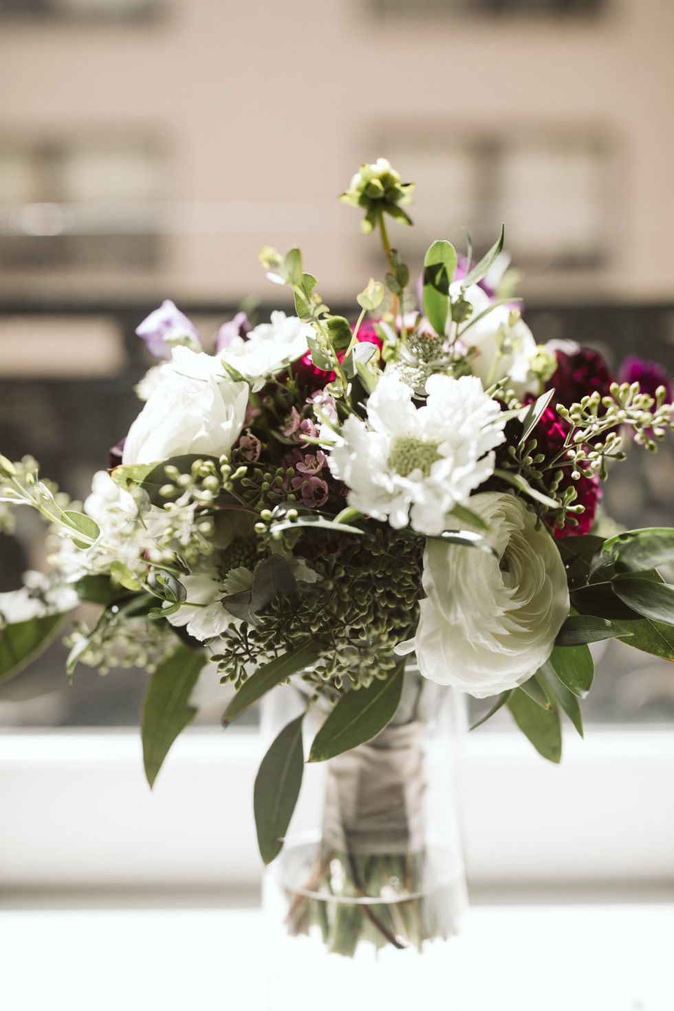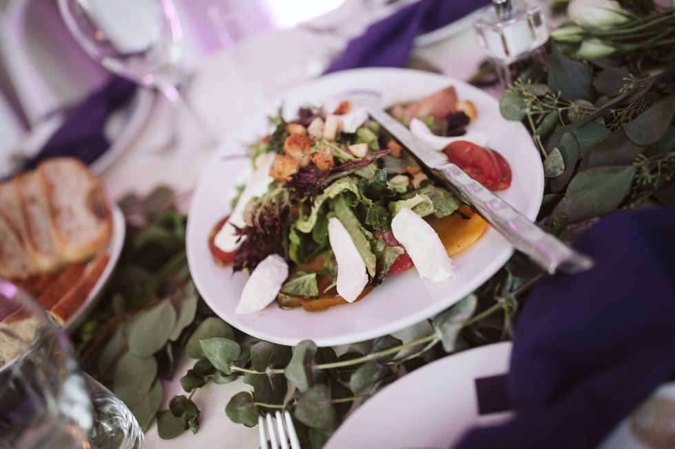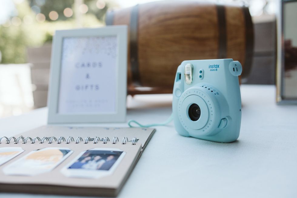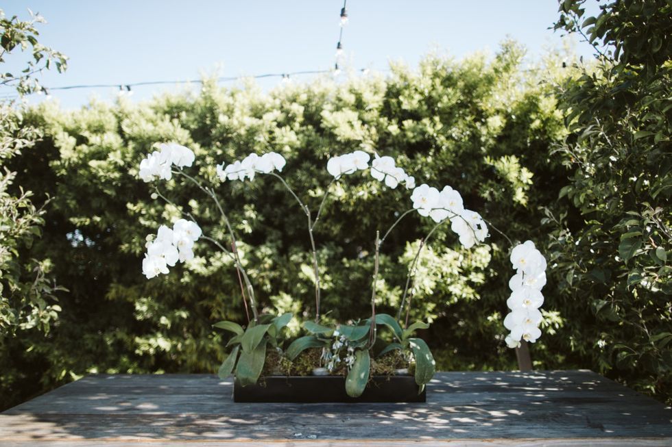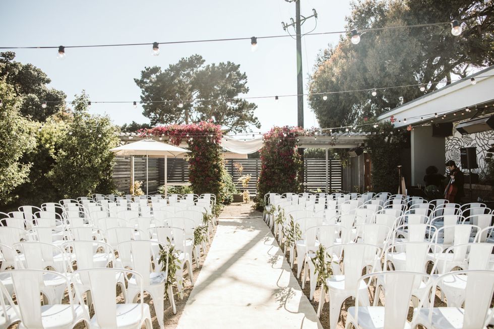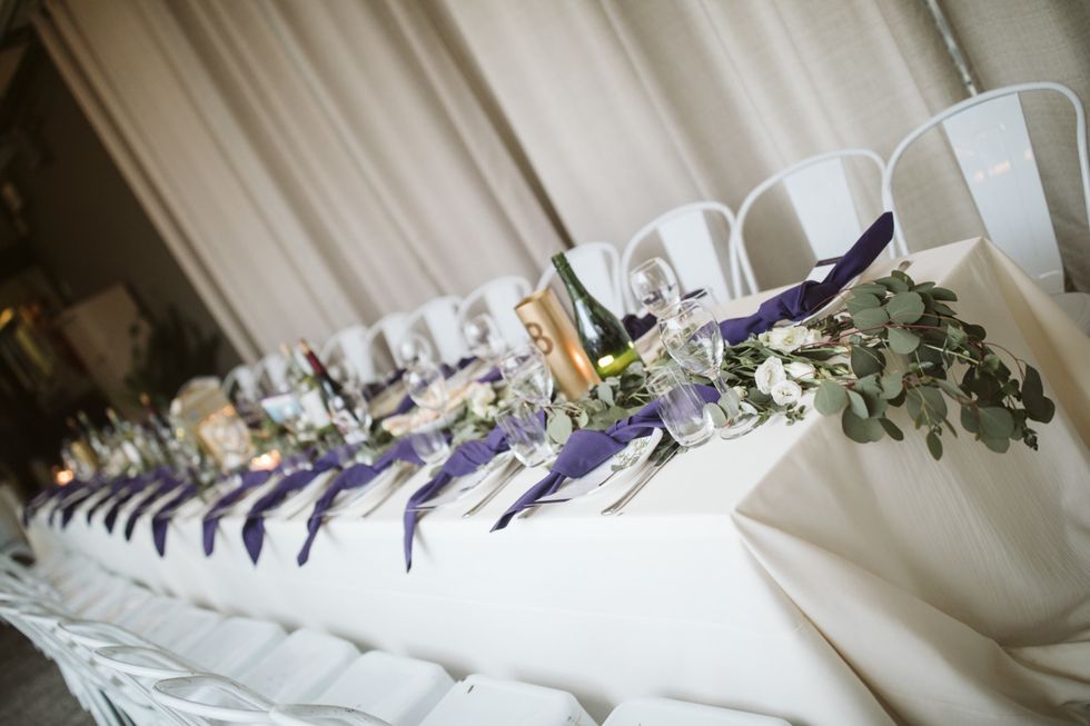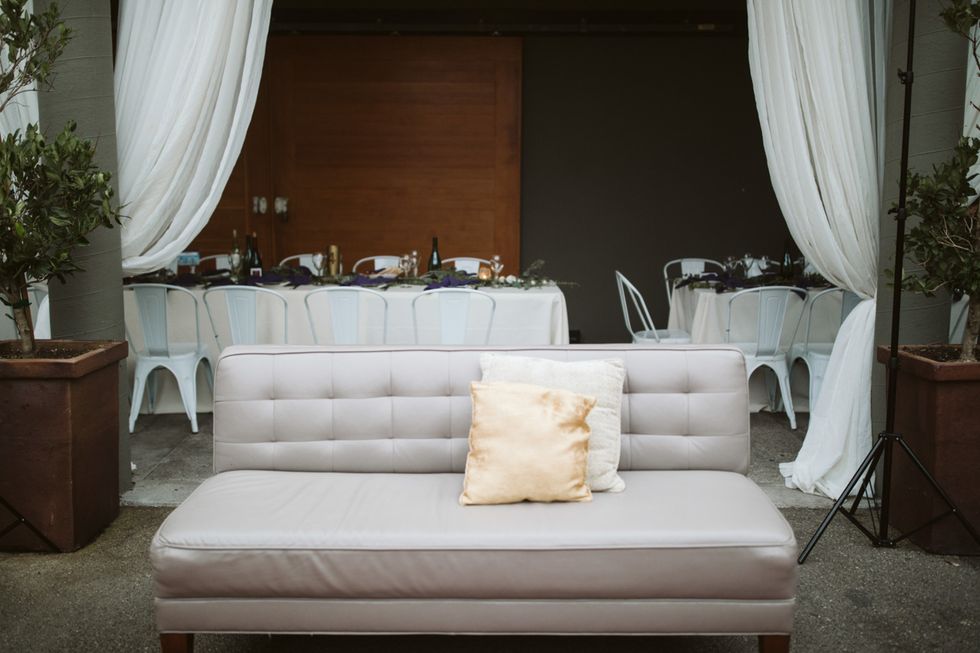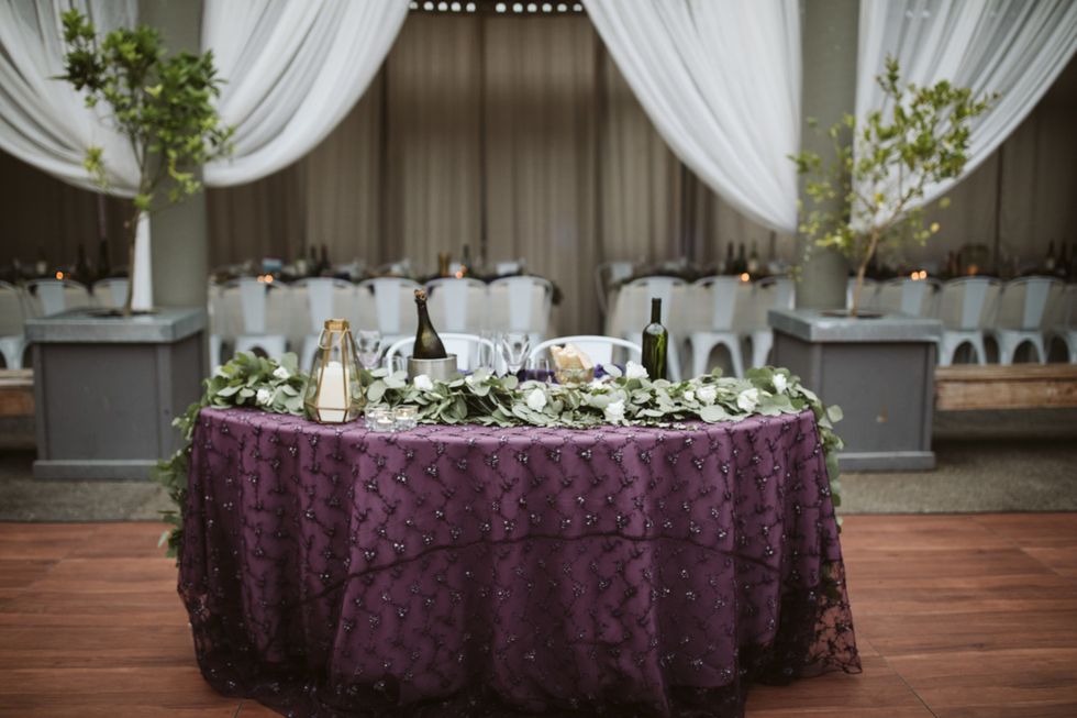 The Arecely Cafe, once an elementary school, checked the box for a wholly unique venue, where the courtyard brimmed with succulents and blooming bougainvillea with string lights overhead. Boughs of fresh eucalyptus accented the white chairs and tables at the reception, which was dressed in rich, plum-hued linens to match the bridesmaids' frocks.