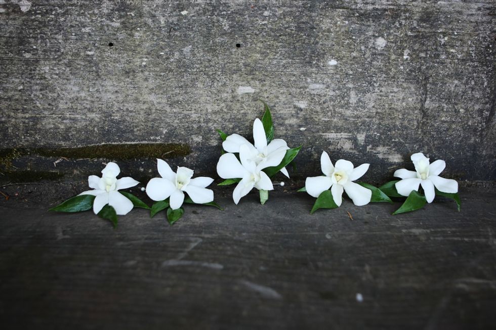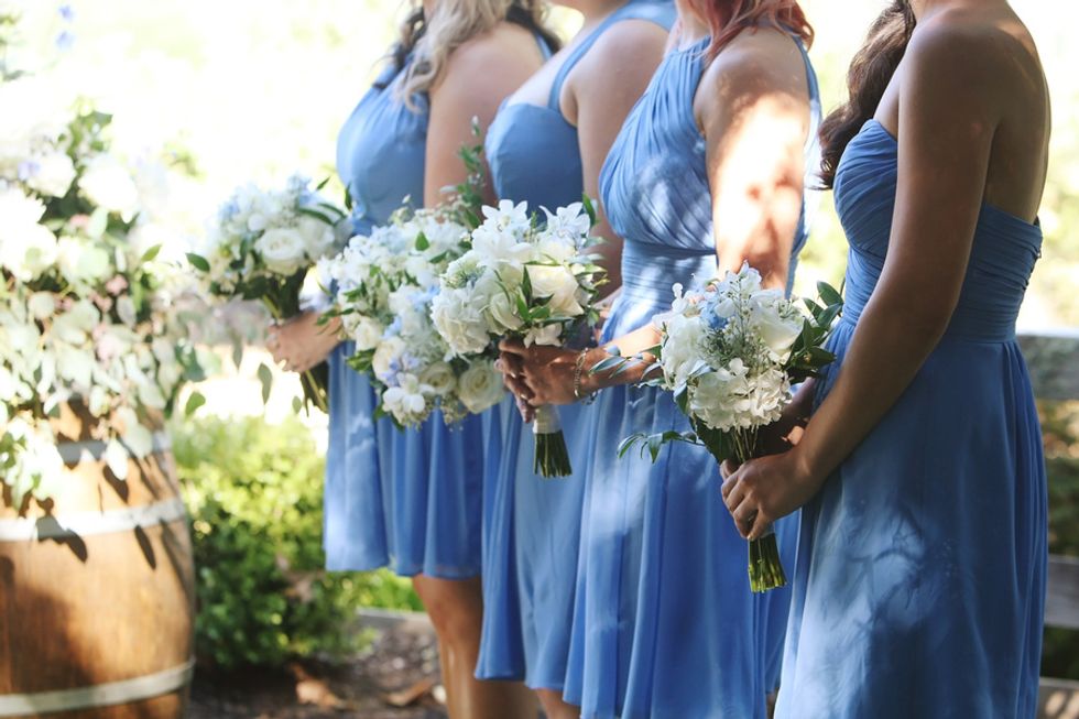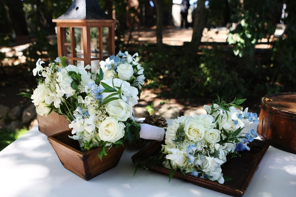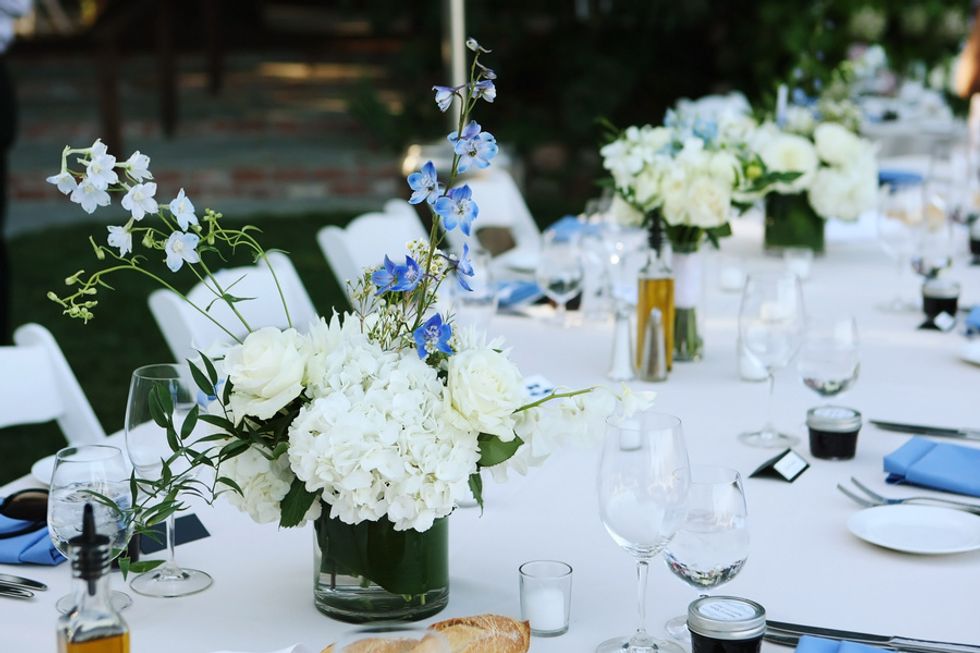A palette of black, white, pale green, and cornflower blue was splashed through the floral arrangements, decorations and wedding party attire. To complement their signature cornflower hue, Italian ruscus, and cascading seeded eucalyptus adorned the bride's bouquet, while the bridesmaids' flowers were brimming with white dendrobium orchids, white roses, white hydrangeas and a few blue hyacinths and delphinium. The groomsmen's boutonnieres were scaled-down versions to match.