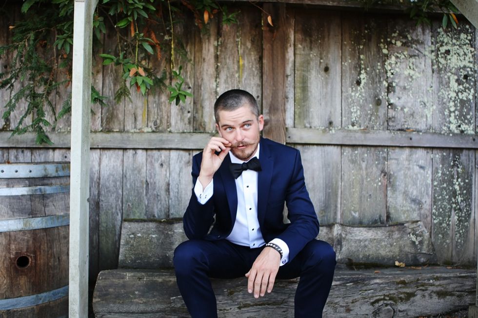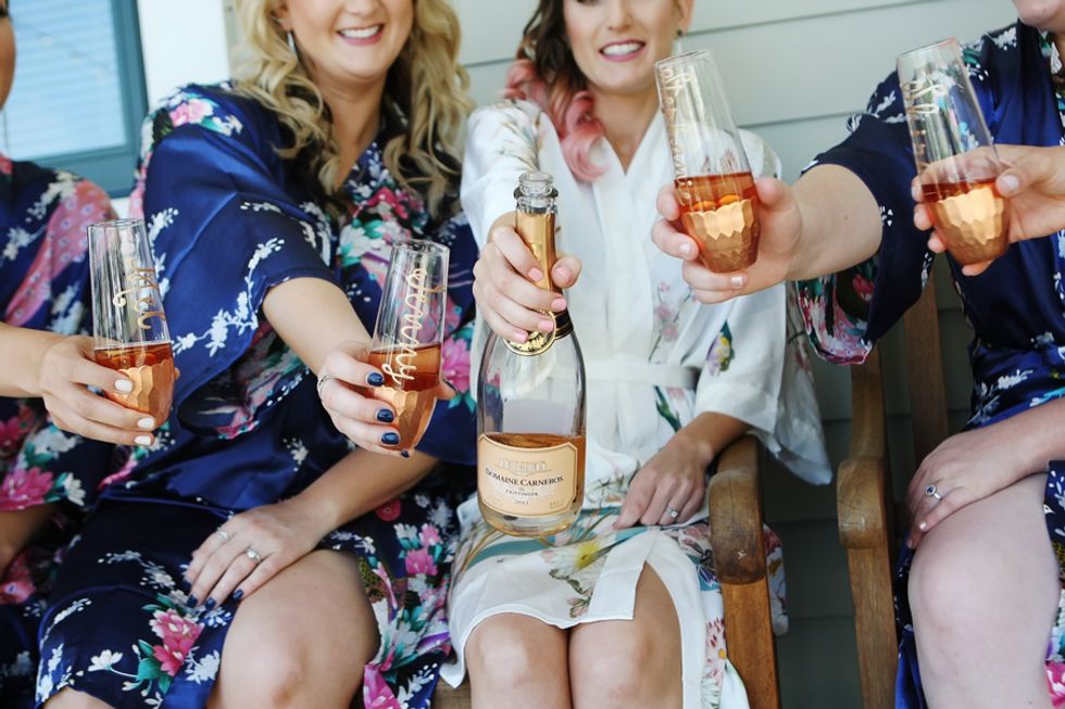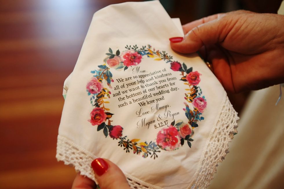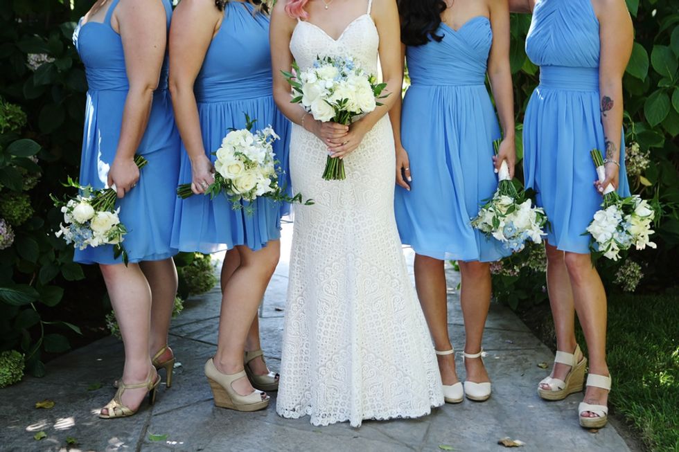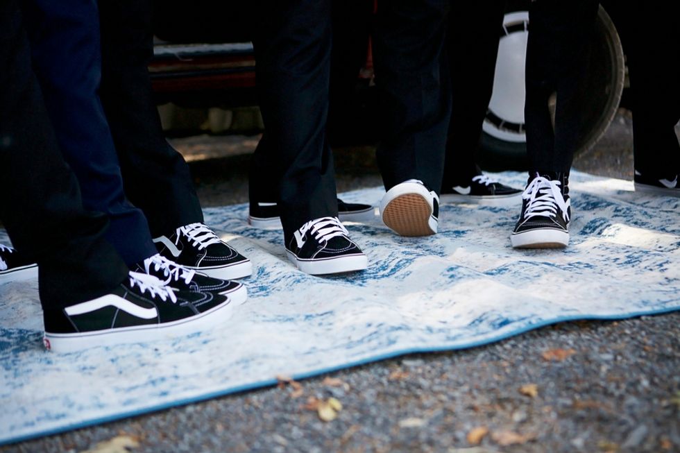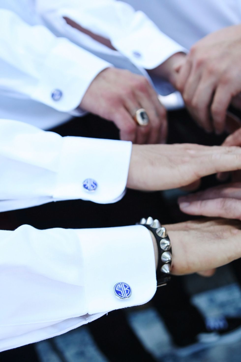 While the bridesmaids selected their own styles of dress—all in the same fabric by one designer—the groomsmen's attire paid tribute ti Schindler himself, riffing on the look he had worn we he took his bride to high school prom: a suit and with old-school Vans high tops. The addition of cufflinks, custom monogrammed with their initials in Art Deco–style font, added a grown-up element.