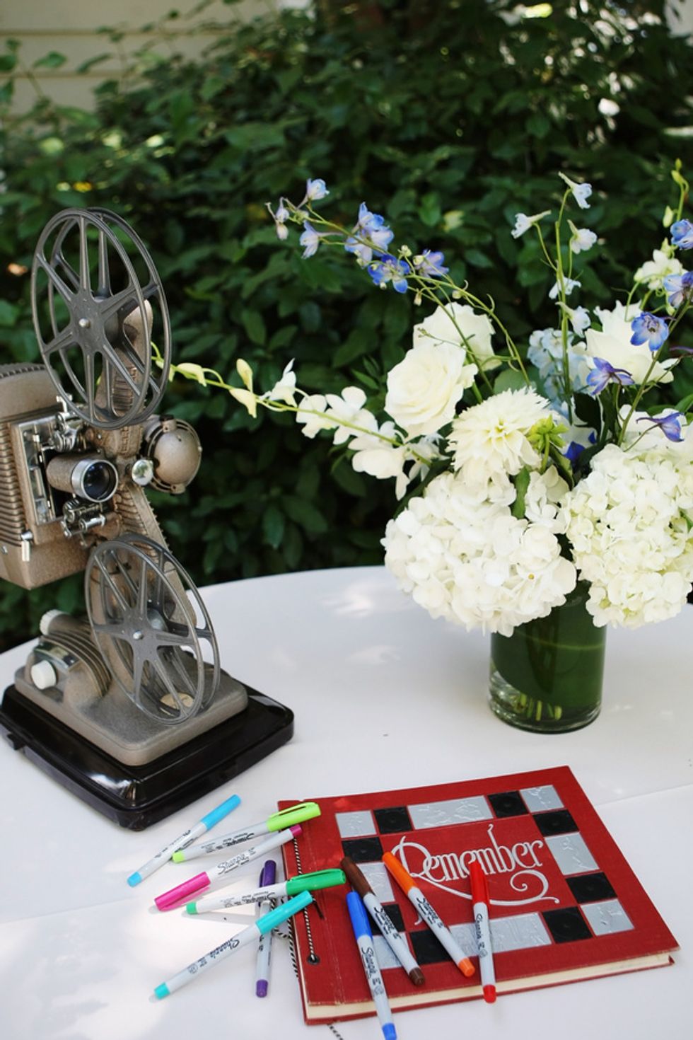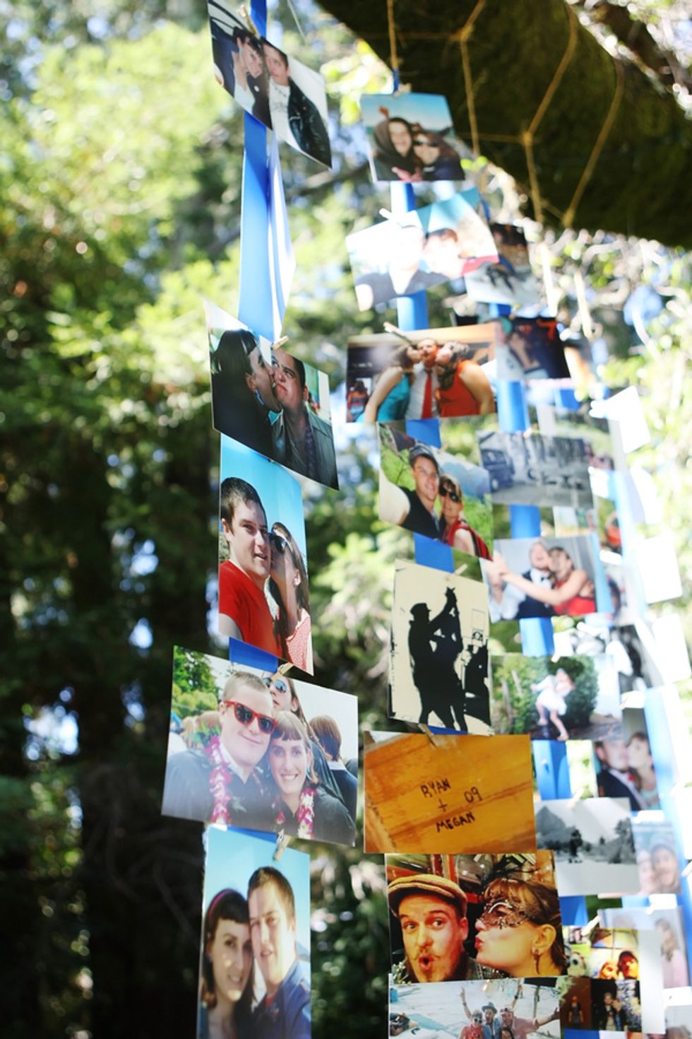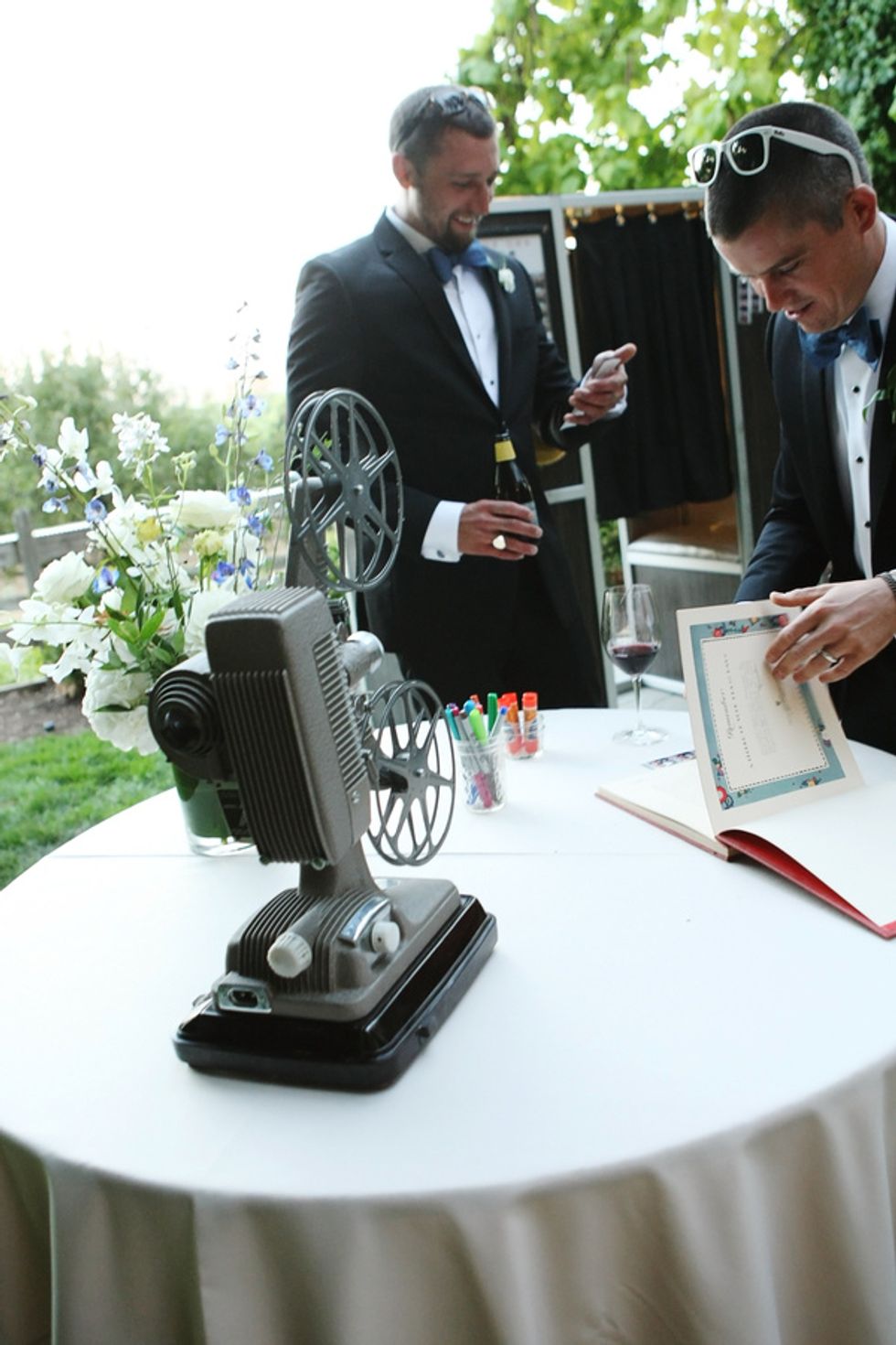 Vintage elements—a 1970s photo booth, a 1930s photo album used as their guestbook, an antique 16mm reel to reel film projector—accented the decor, while personal bits were found aplenty: Table markers were designed and illustrated by a friend with the van and pandas in Art Deco style; from an old oak tree hung 150 photos that told the story of the couple's romance from the age of 15 all the way up to the big day.