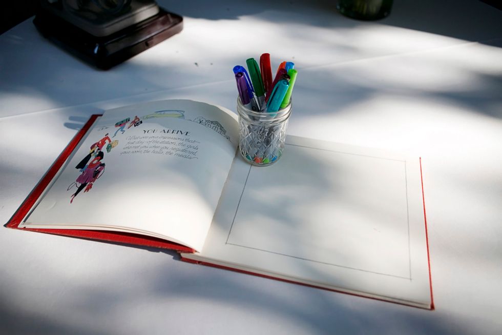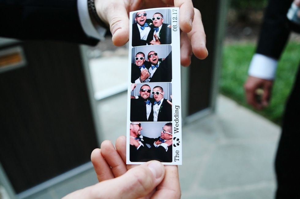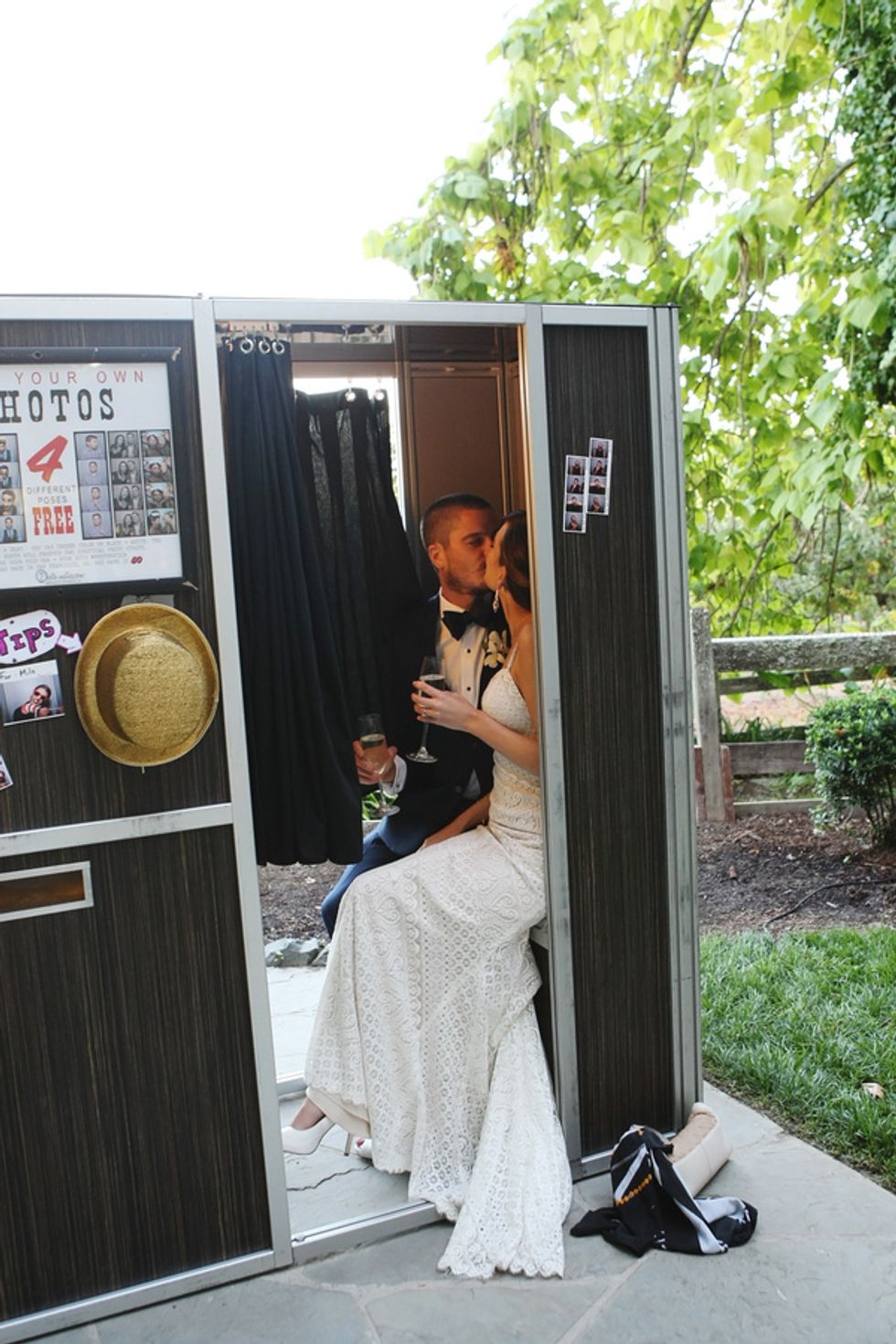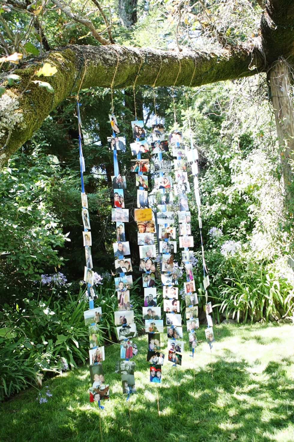 Vintage elements—a 1970s photo booth, a 1930s photo album used as their guestbook, an antique 16mm reel to reel film projector—accented the decor, while personal bits were found aplenty: Table markers were designed and illustrated by a friend with the van and pandas in Art Deco style; from an old oak tree hung 150 photos that told the story of the couple's romance from the age of 15 all the way up to the big day.