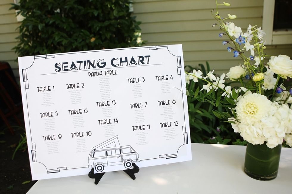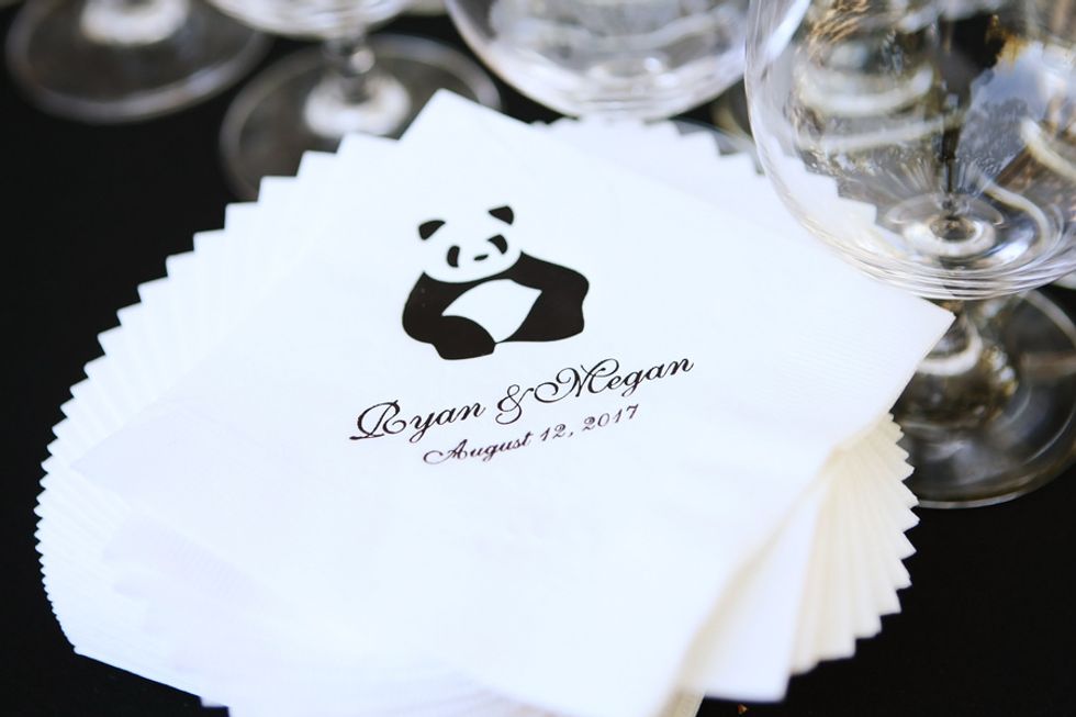 Their love of adventure carried over into their decor, and naturally they had to include their VW van as a backdrop for wedding photos, draped in floral garlands and tricked out with props including a retro full-length standing mirror, a large rug, wine barrel, a vintage suitcase, and throw pillows. And because the two endearingly refer to each other as "panda," panda bears appeared throughout.