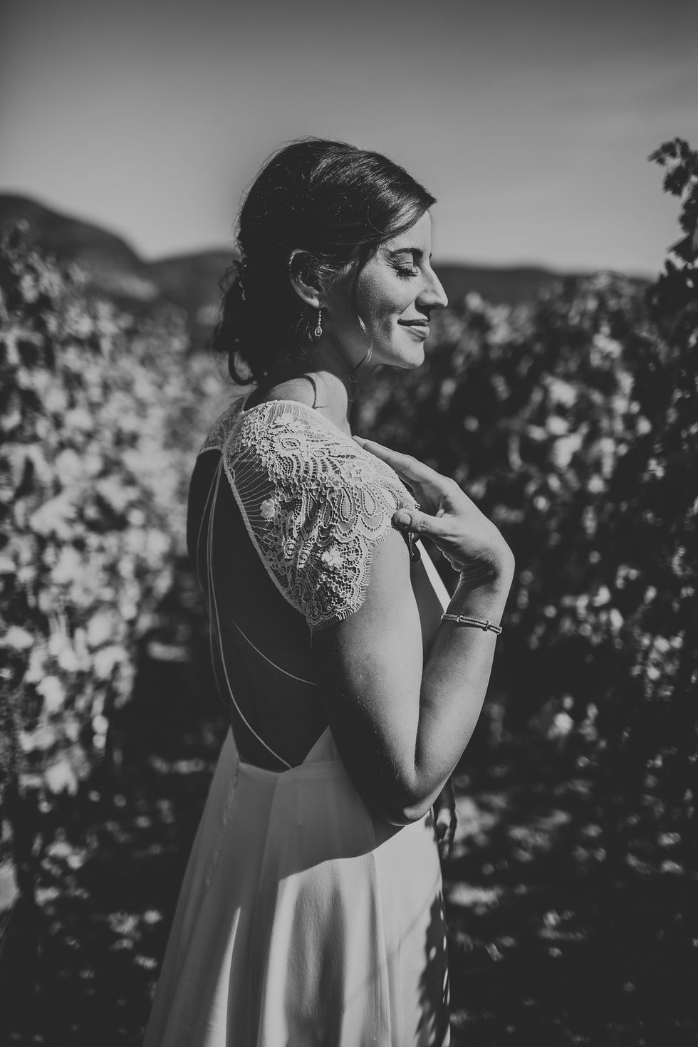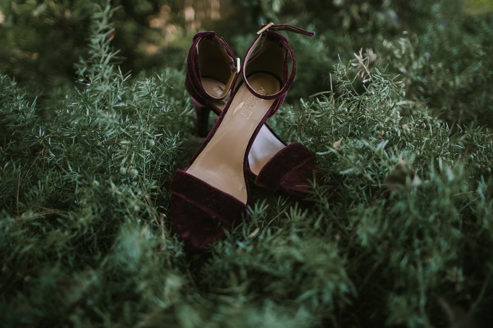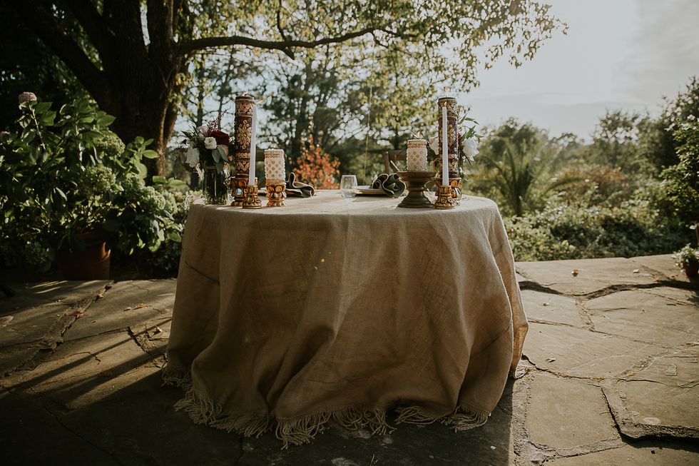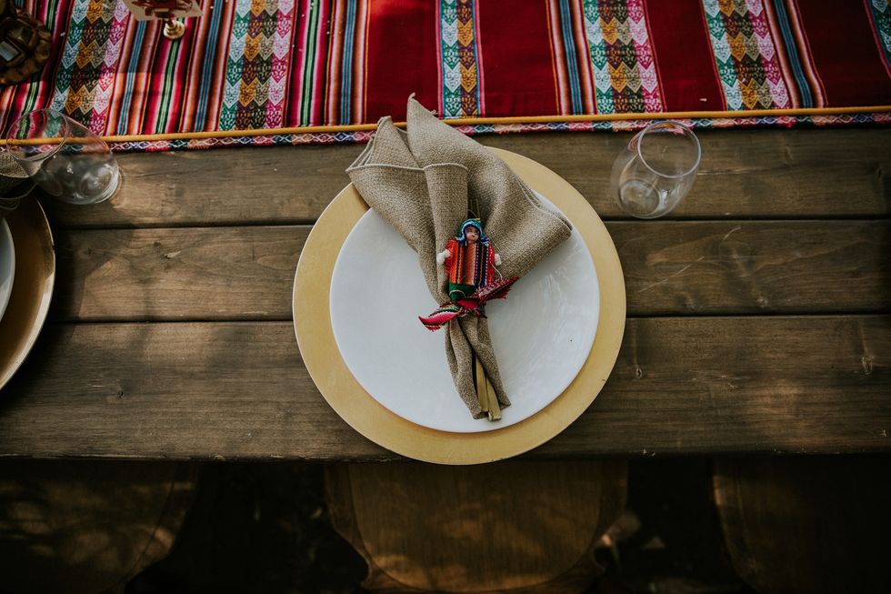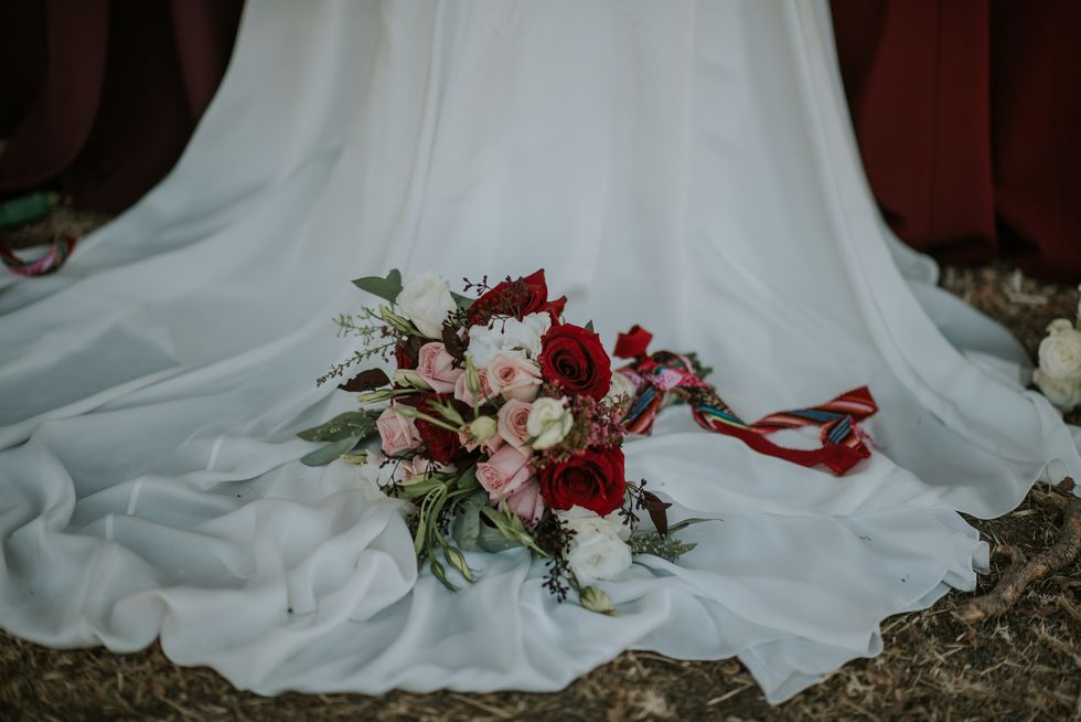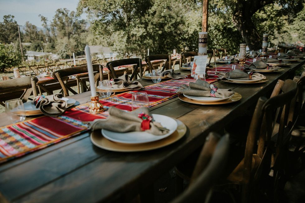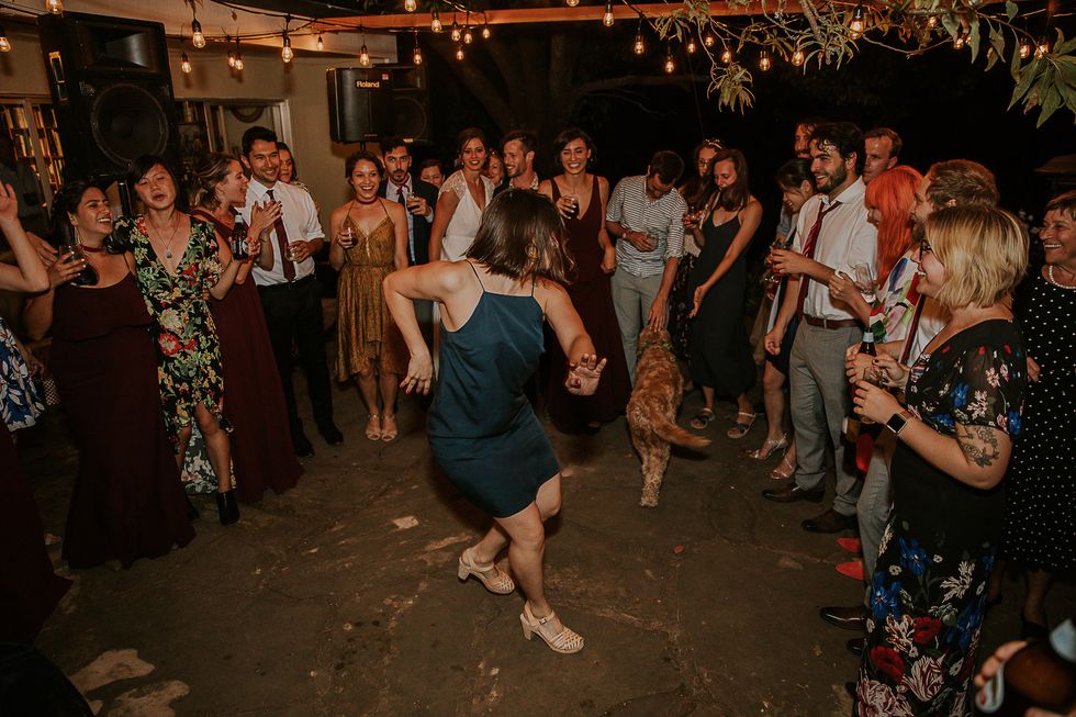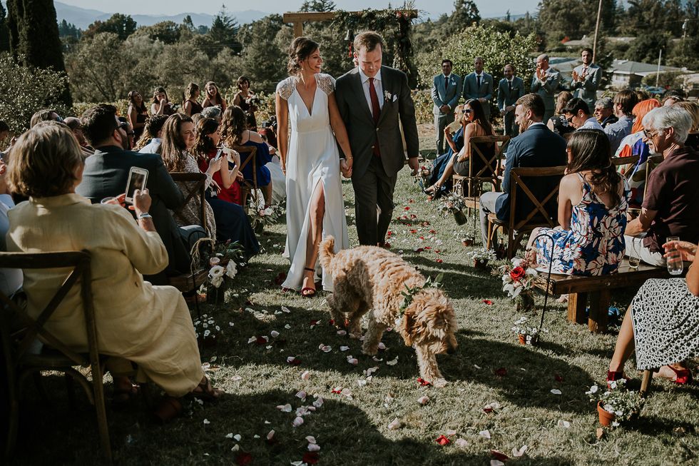The color palette and design echoed the surrounds, with rustic decor and wine-hued florals; the bride wore velvet wine-toned sandals and carried a plummy bouquet, and the bridesmaids wore burgundy dresses to match. A long wooden table was embellished with a woven Peruvian table runner and worry dolls, a DJ spun records, and the couple's dog, Belka, marched down the aisle with the lovebirds. It all culminated in a dance party under the stars.