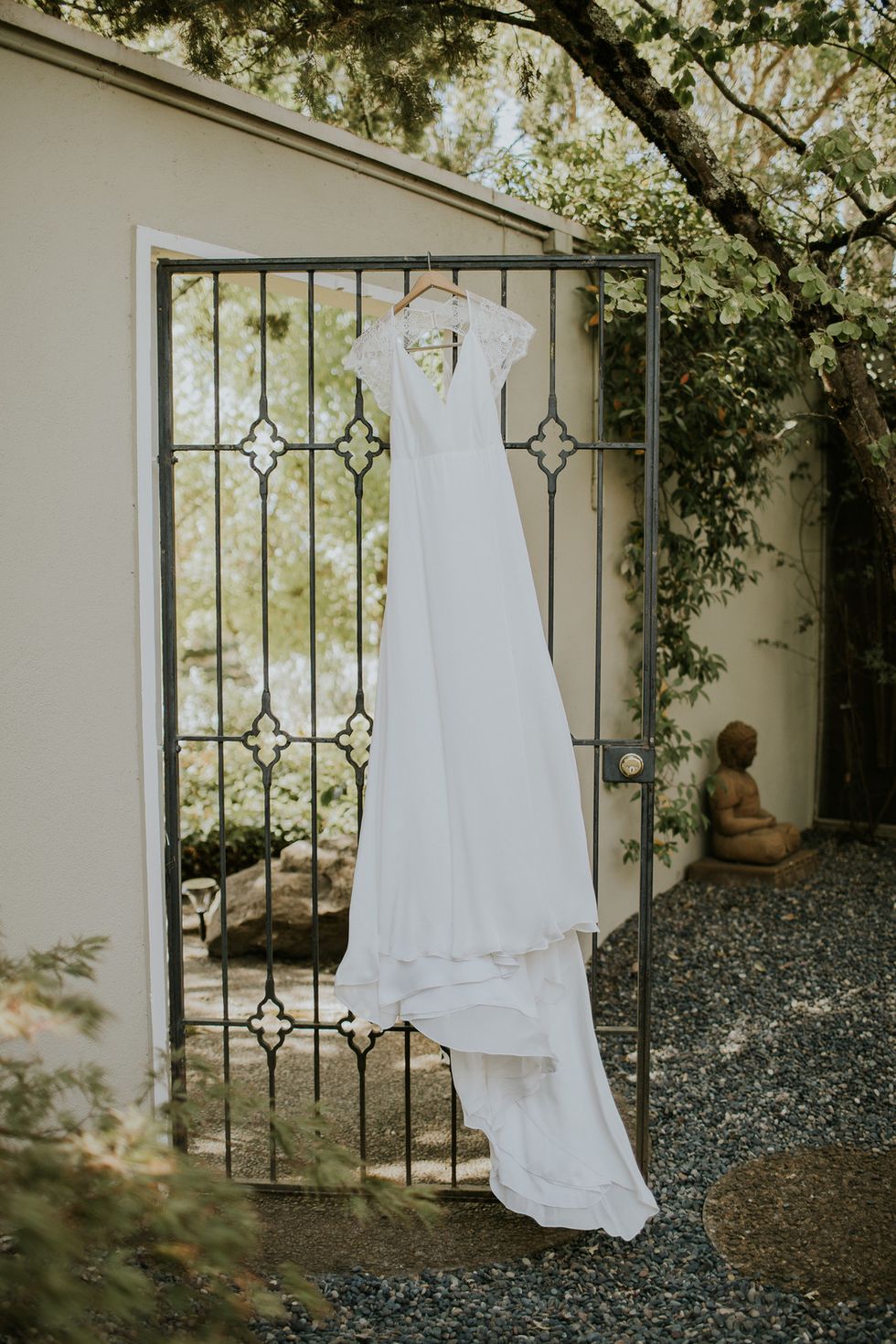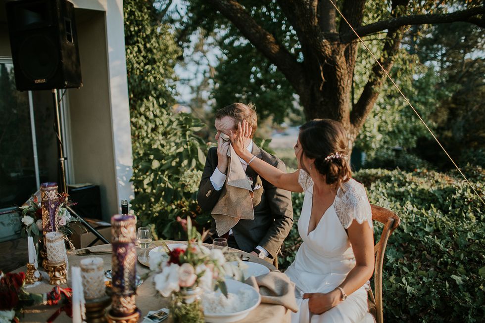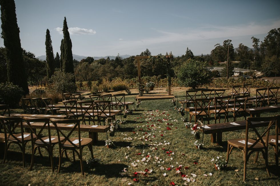 Months were spent preparing the backyard for the party. The land was, fortunately, untouched by the recent Napa fires, making the couple's big day and extra special celebration. Both students of philosophy and spirituality, the bride and groom's fathers served as officiants; Lazo's dad translated the ceremony for her Spanish-speaking family.