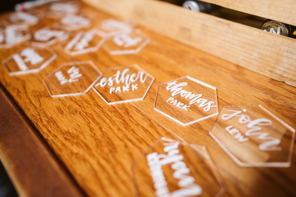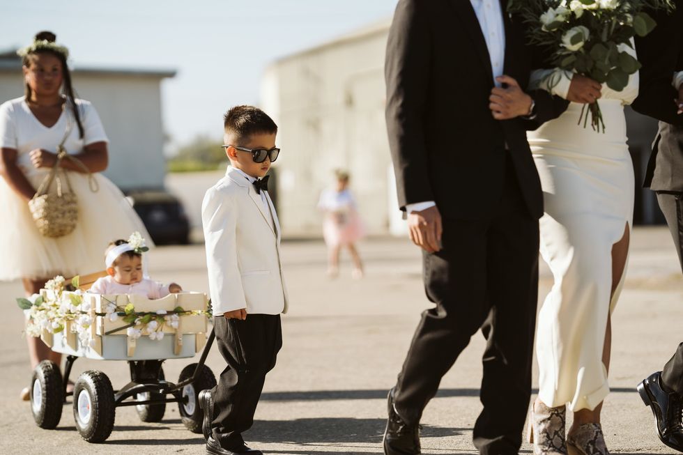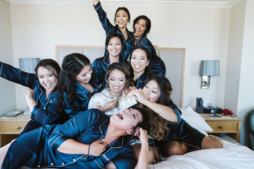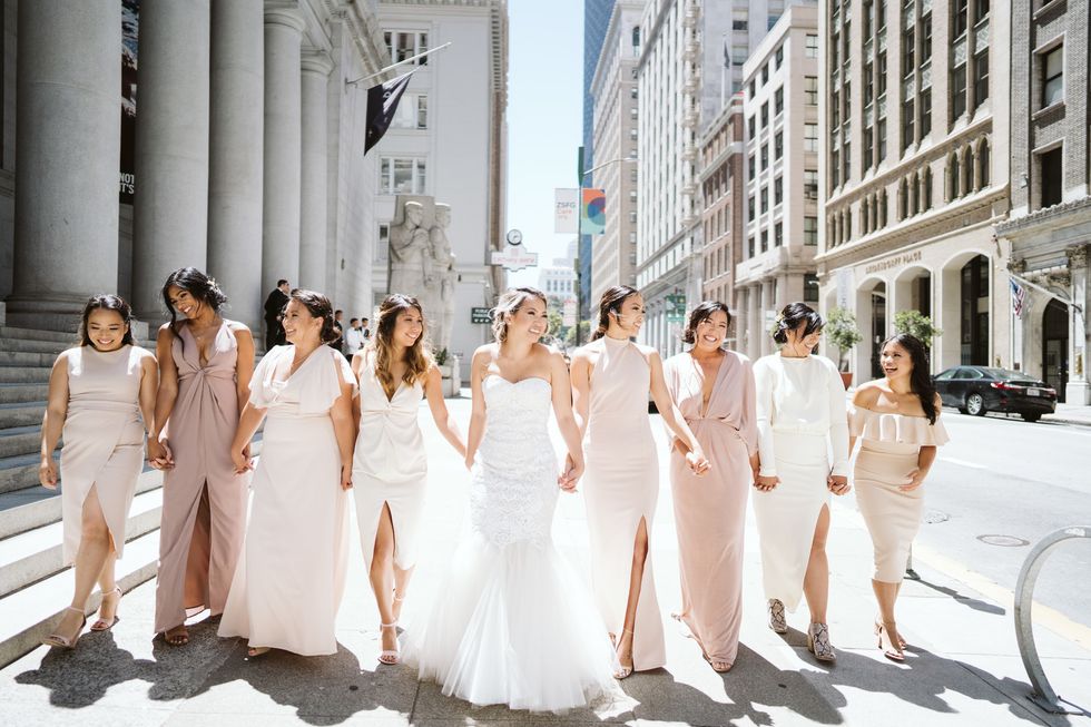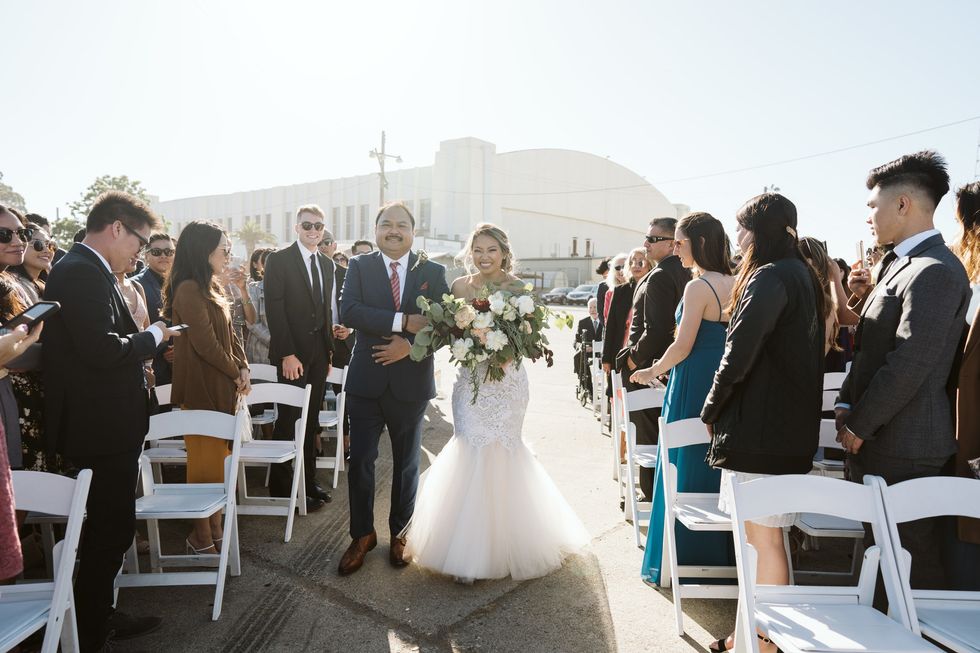 All about nostalgia, the lovebirds even took their wedding party to 7-Eleven to seal the deal with Slurpees, just as they had when they first became "official" back in high school. Then, they said "I do" under a eucalyptus arch framing the Bay Bridge.