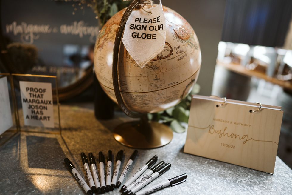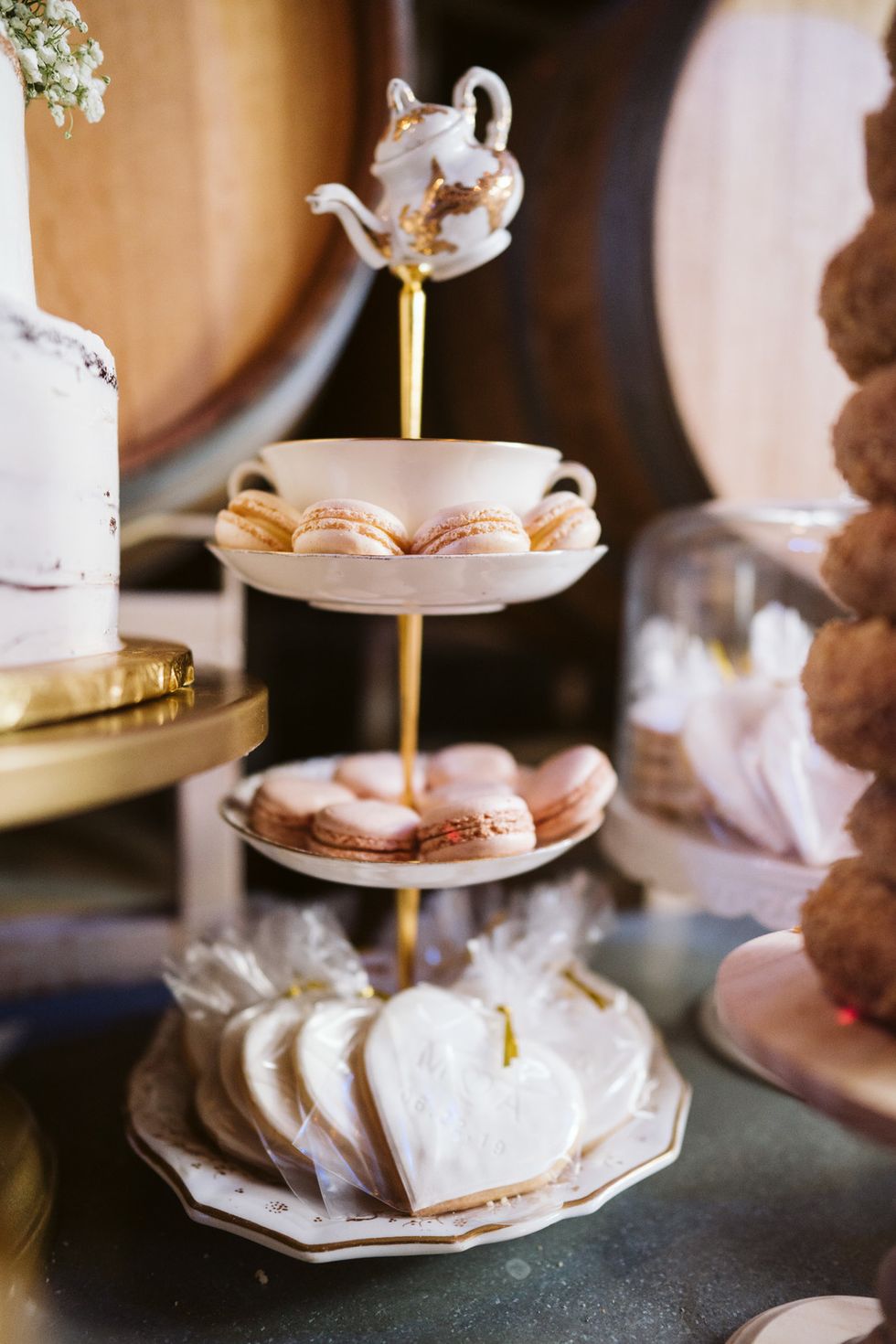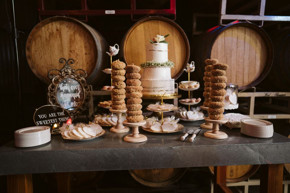 Topping it off was a dessert table teeming with tiered trays of macarons and cookies with their initials and date surrounding a three-layer cake, and of course, multiple towers of Bob's Donuts.