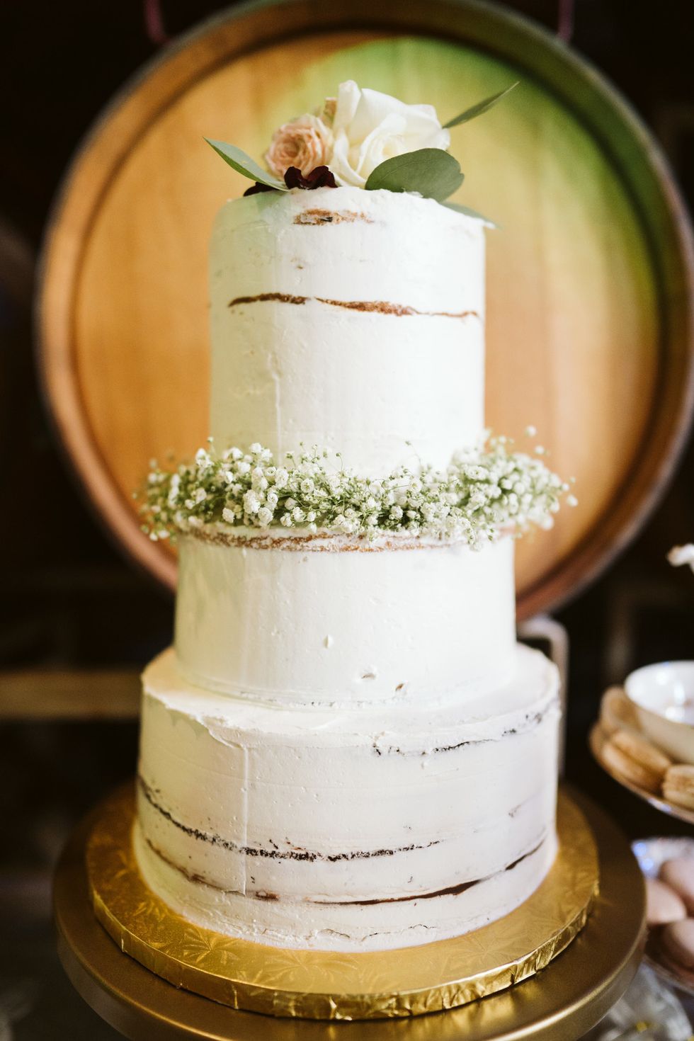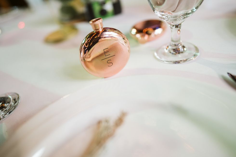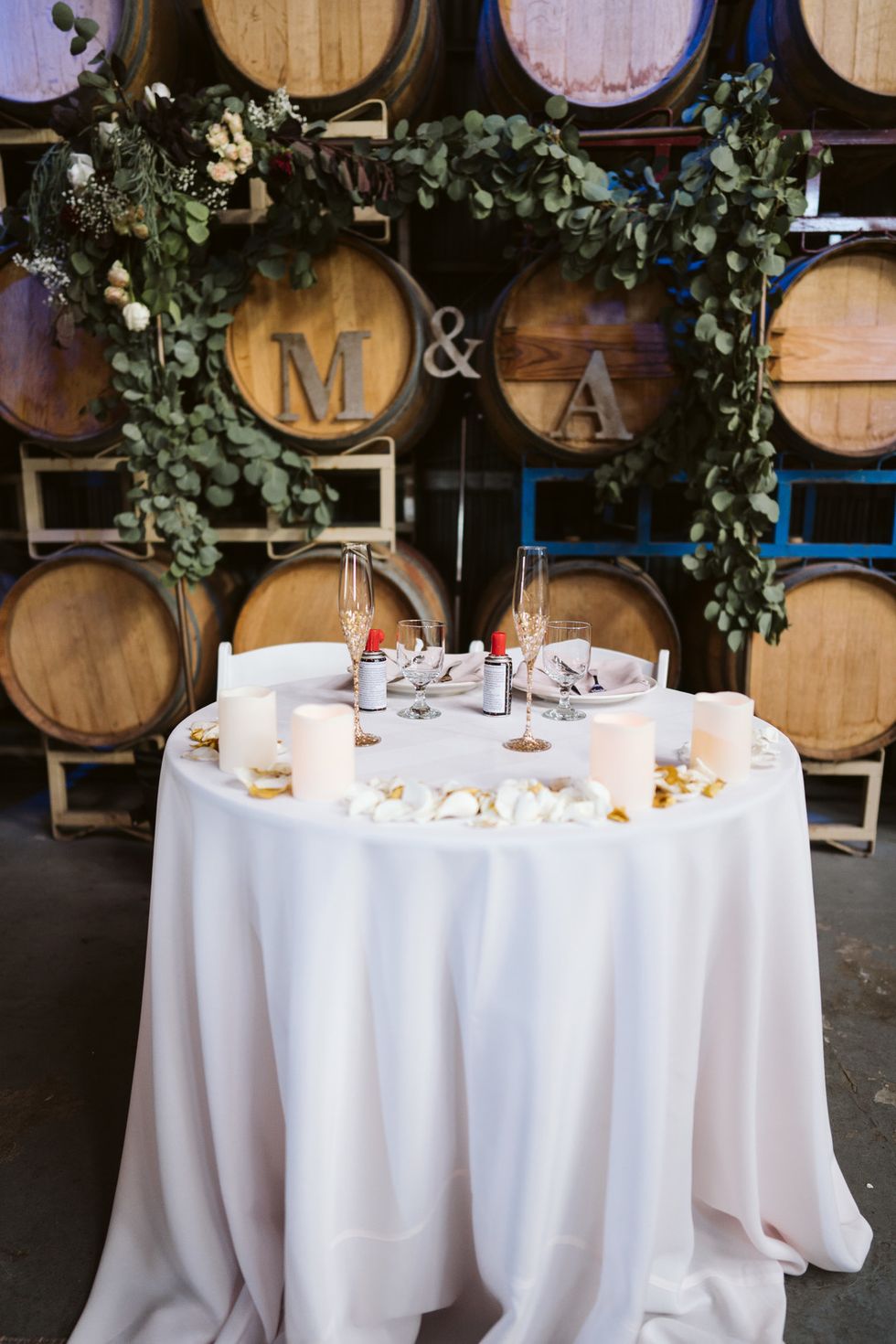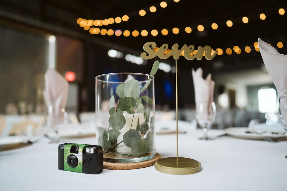 Inside, the reception exuded charming elegance with wine barrels all around, an abundance of foliage and florals, and all of the vintage touches. Adding to the ambiance were disposable cameras at each table. "We're pretty excited for these because we plan to look through each table's (one camera per year) developed photos every year when we celebrate our anniversary."