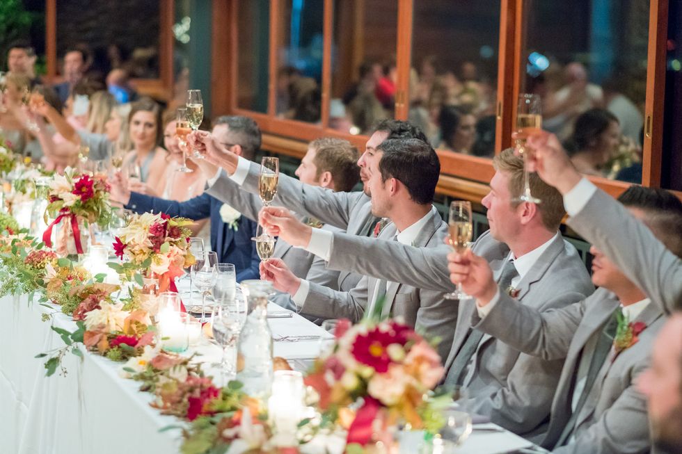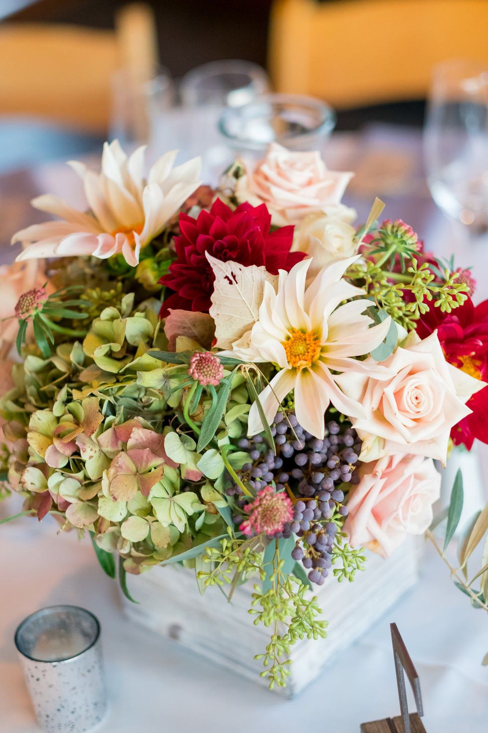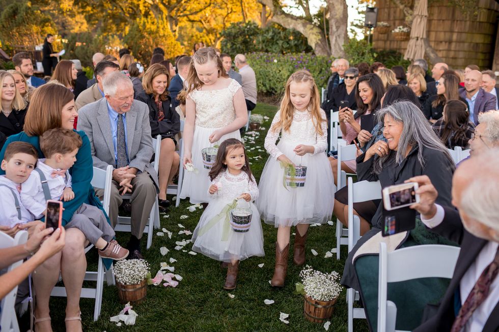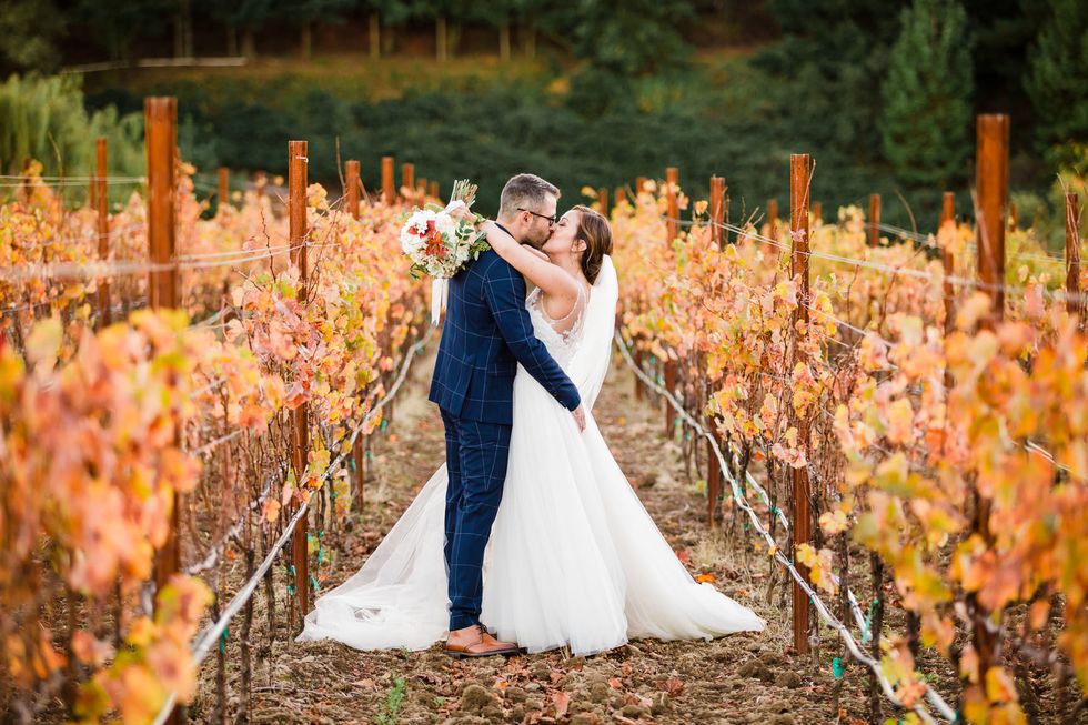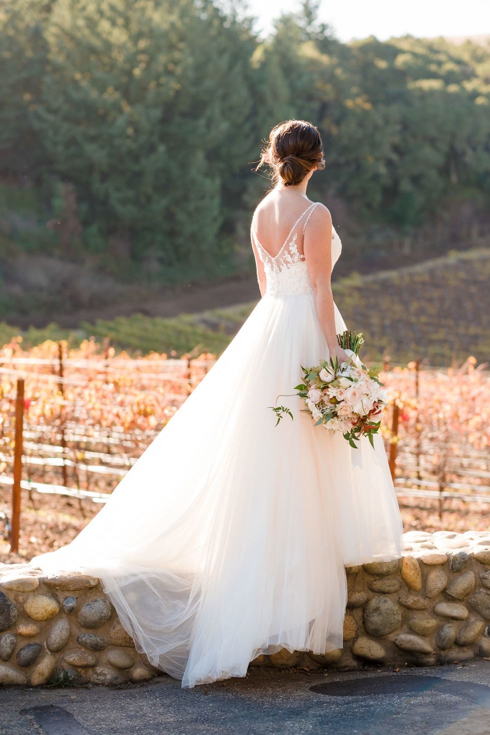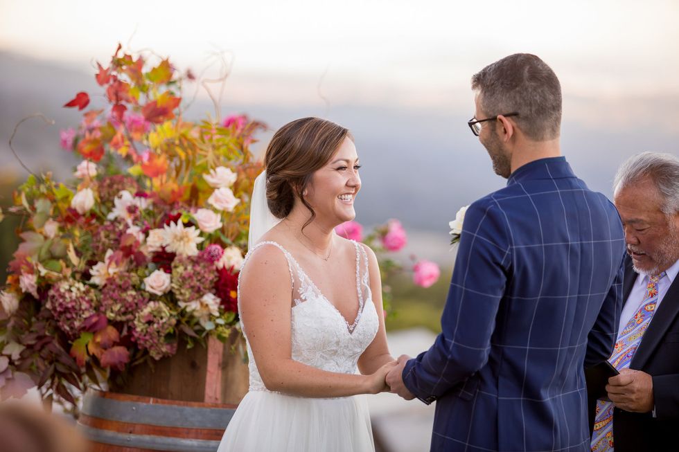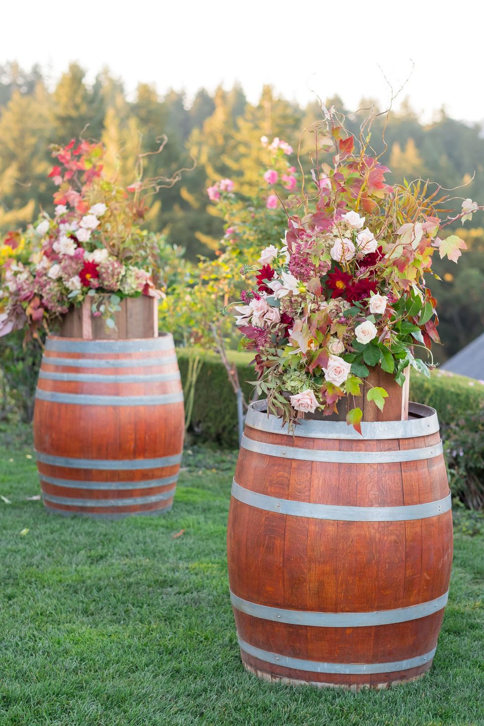 Accents of autumn were everywhere at the outdoor ceremony, with massive floral arrangements of crimson, pale pink, and leafy blooms topping wooden barrels and complementing the surrounding golden vineyards and fallen leaves. The aisle was lined with buckets of baby's breath and rose petals, and the couple said "I do" before frolicking through the vineyards.