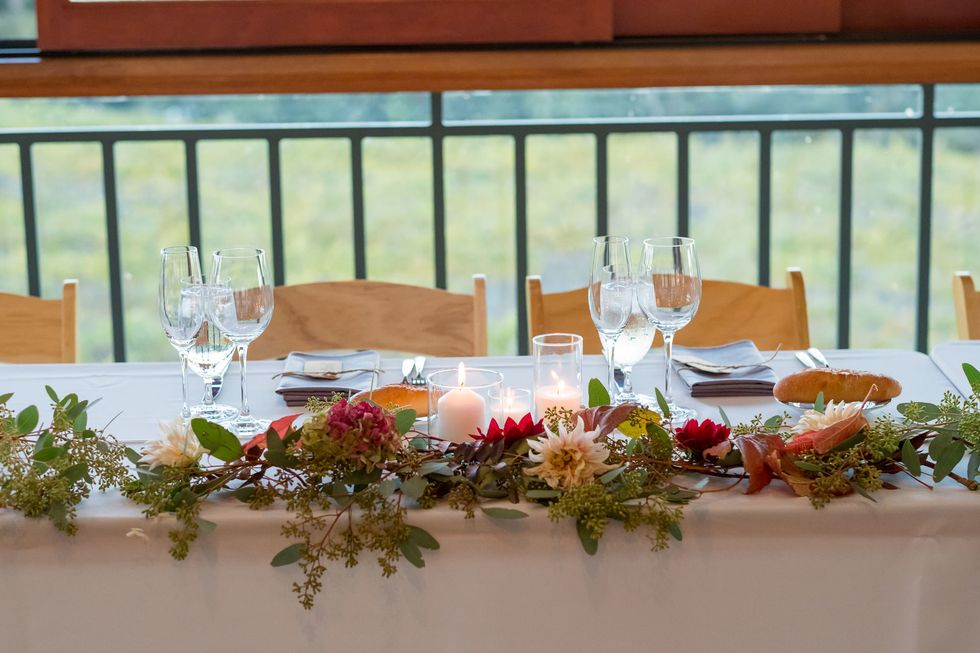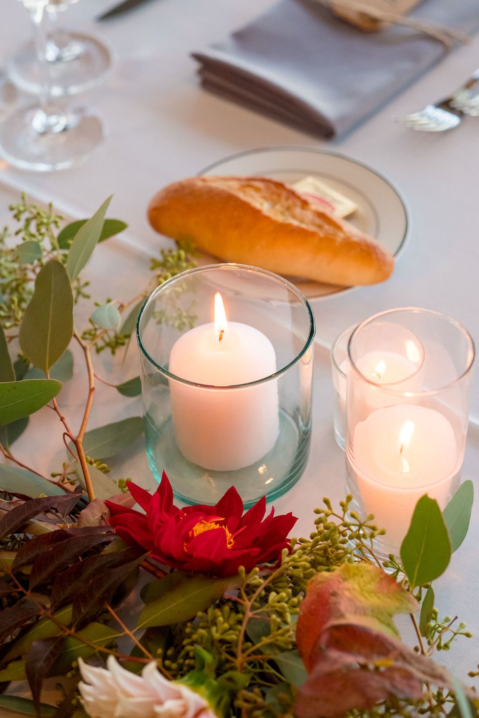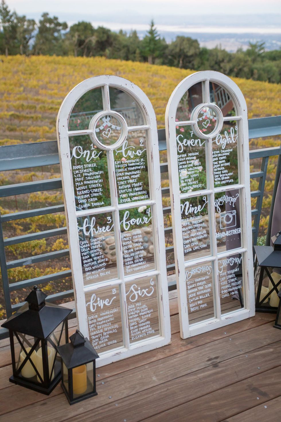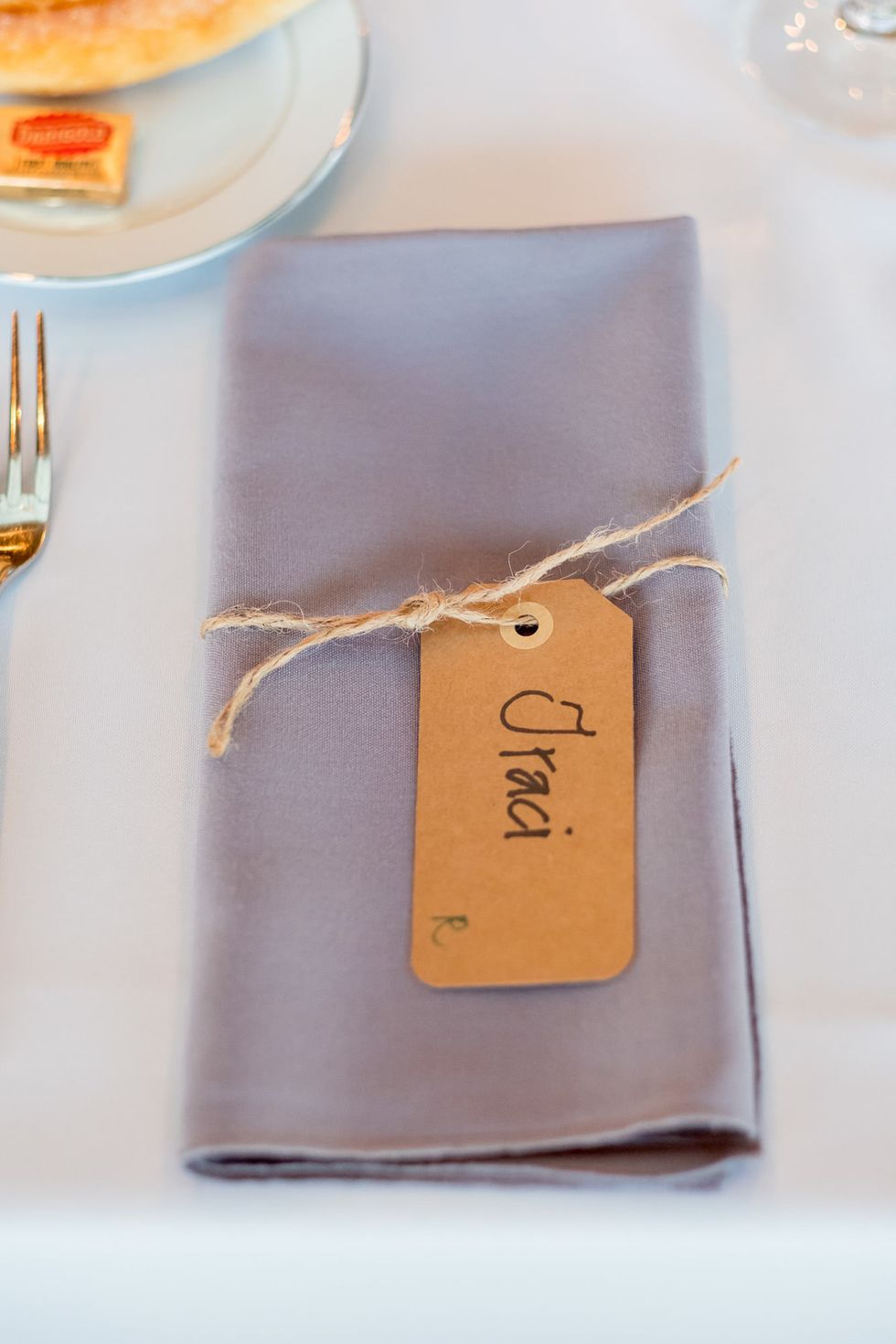 At the reception, two instructively decorated windowpanes led guests to their tables, and centerpieces in wooden vases added colorful accents. Linens were kept simple—white tablecloths and lavender napkins with names tied to them.