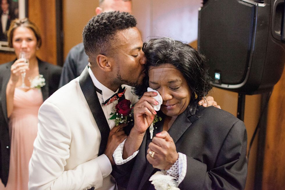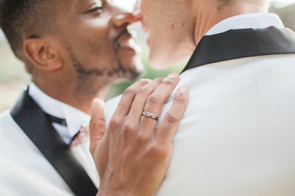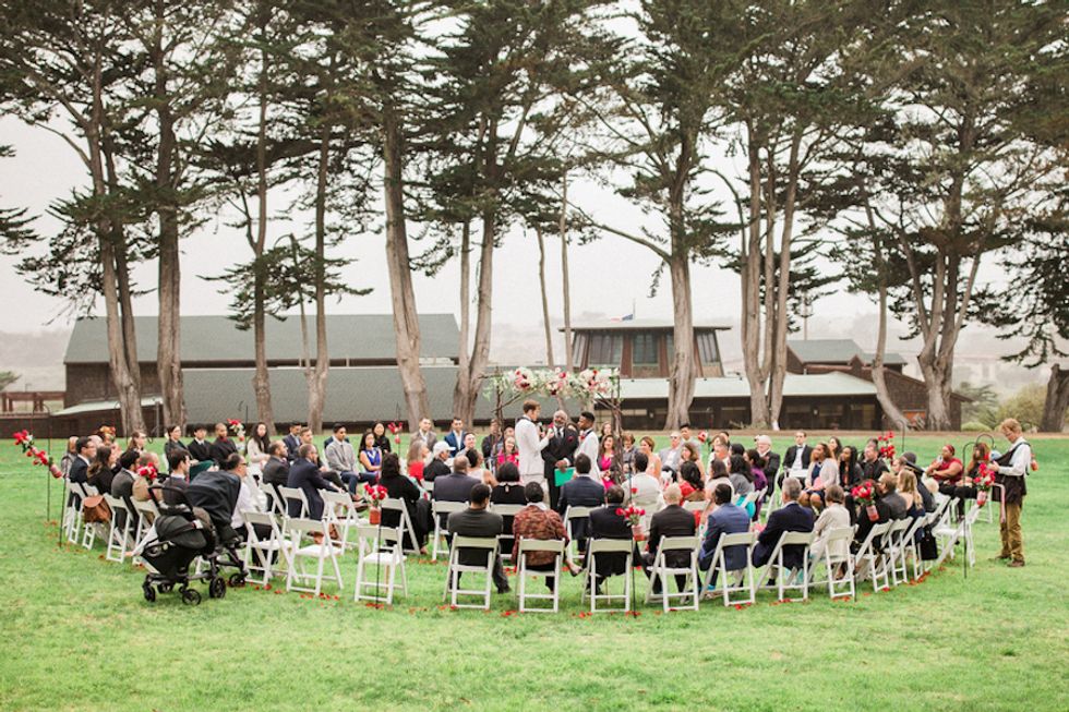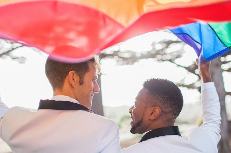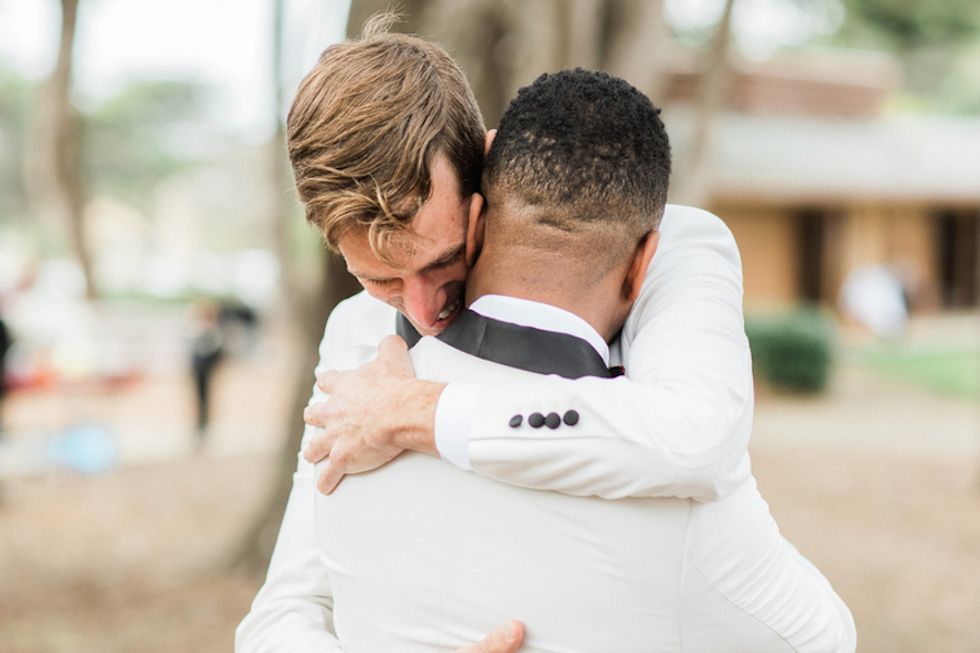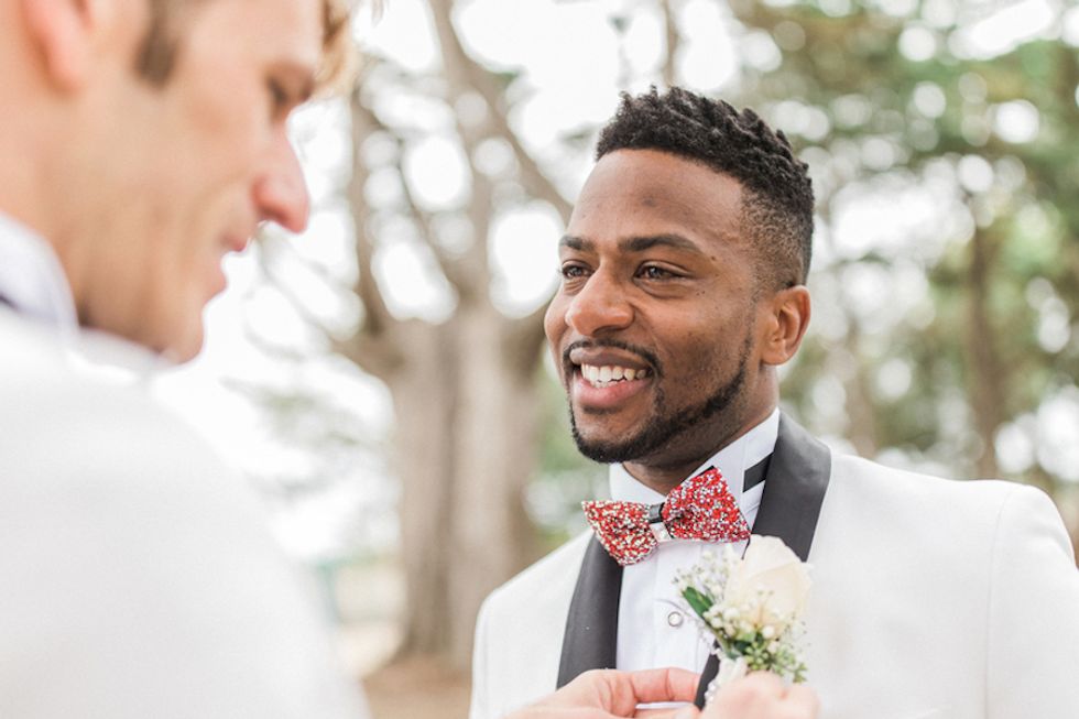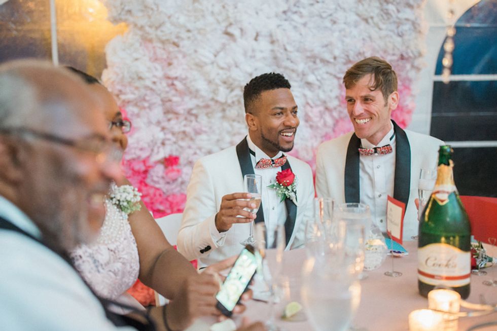 With the rainbow Pride flag as the wedding's piece de resistance, Darin took the opportunity to bestow upon his husband the true gift of color: His colorblind hubby Mark saw color for the very first time during their ceremony when Darin gifted him a pair of glasses that allow colorblind folks to see the world in its multiprismatic glory. Cue the tears.