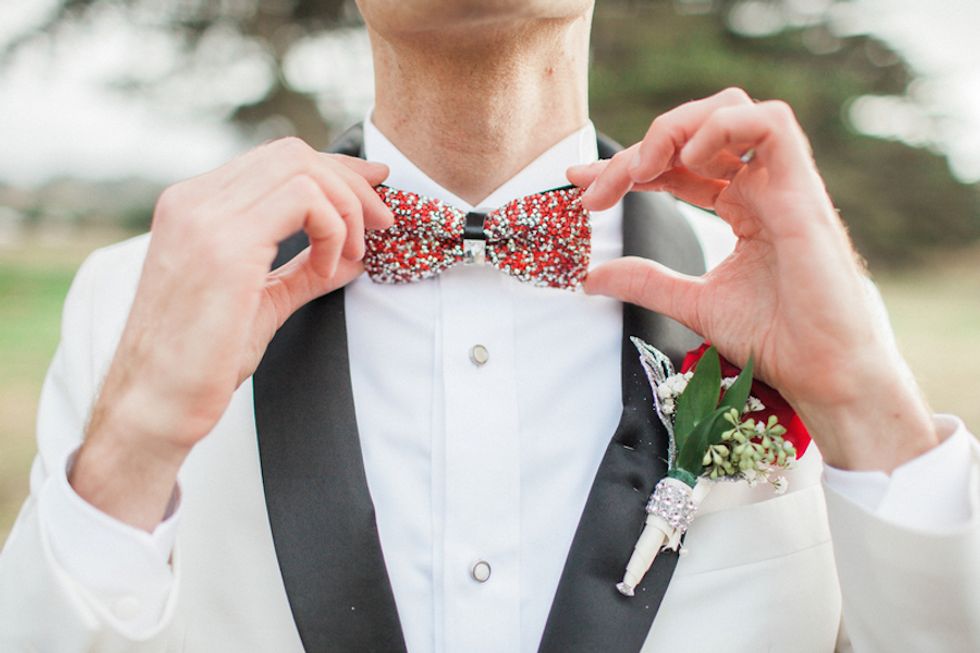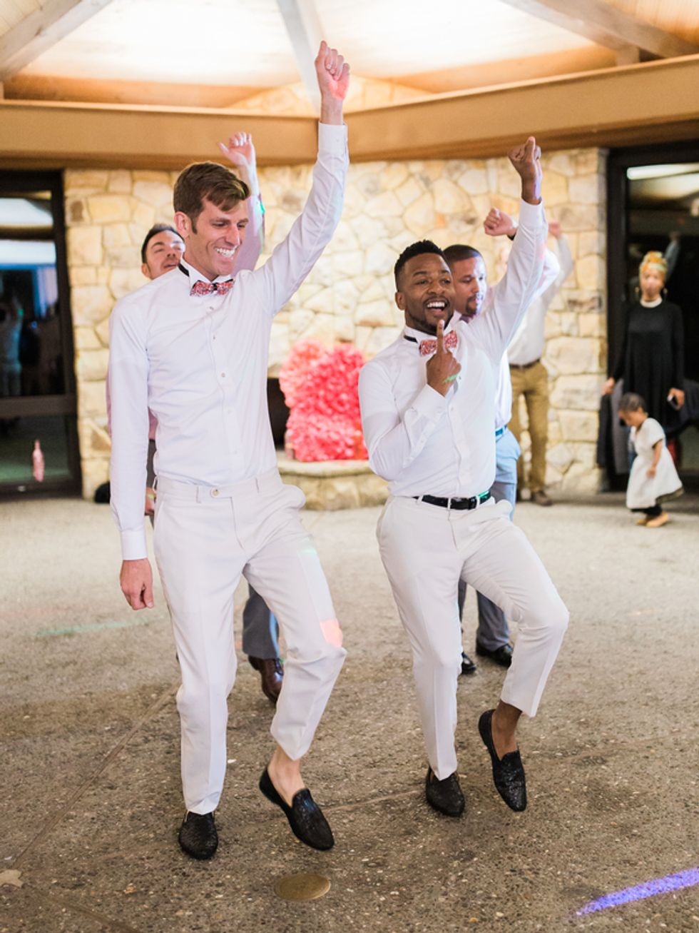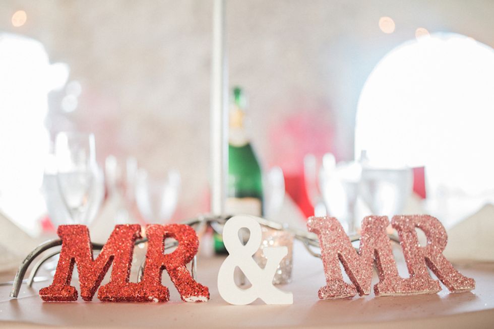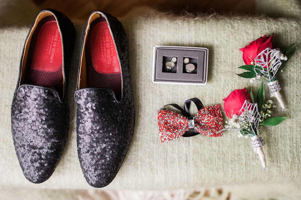 The couple could not have been more gorgeous, clad in matching white tuxedos pinned with rich red roses, sparkly bowties, and the most stunning sequined loafers ever. The wedding party showed their pride with special fake tattoos, and got an extra dose of gay glamour in the glitteriest cake you ever saw. The newly minted Mr. and Mr. even performed a synchronized dance routine at the reception! What could be more fabulous?!