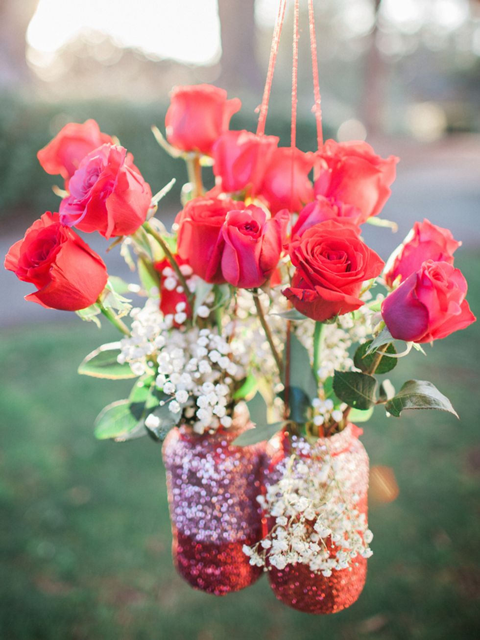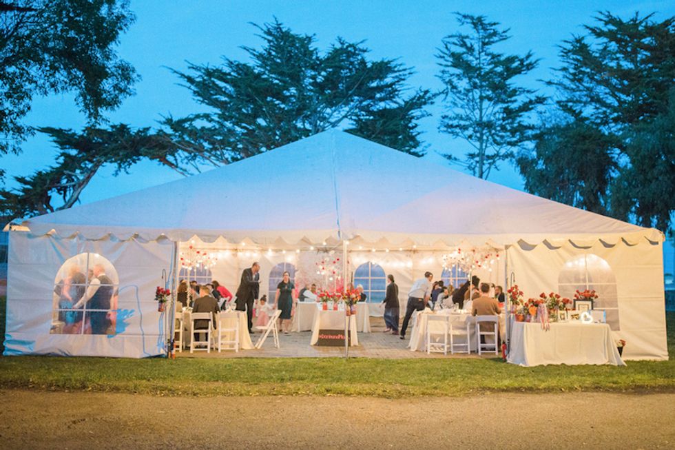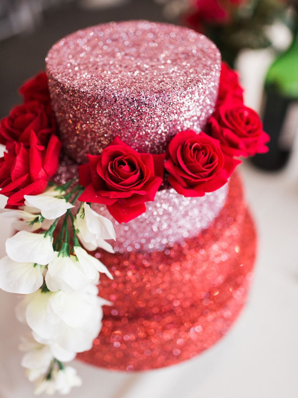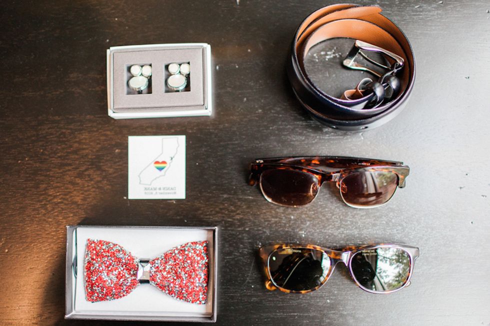 The couple could not have been more gorgeous, clad in matching white tuxedos pinned with rich red roses, sparkly bowties, and the most stunning sequined loafers ever. The wedding party showed their pride with special fake tattoos, and got an extra dose of gay glamour in the glitteriest cake you ever saw. The newly minted Mr. and Mr. even performed a synchronized dance routine at the reception! What could be more fabulous?!