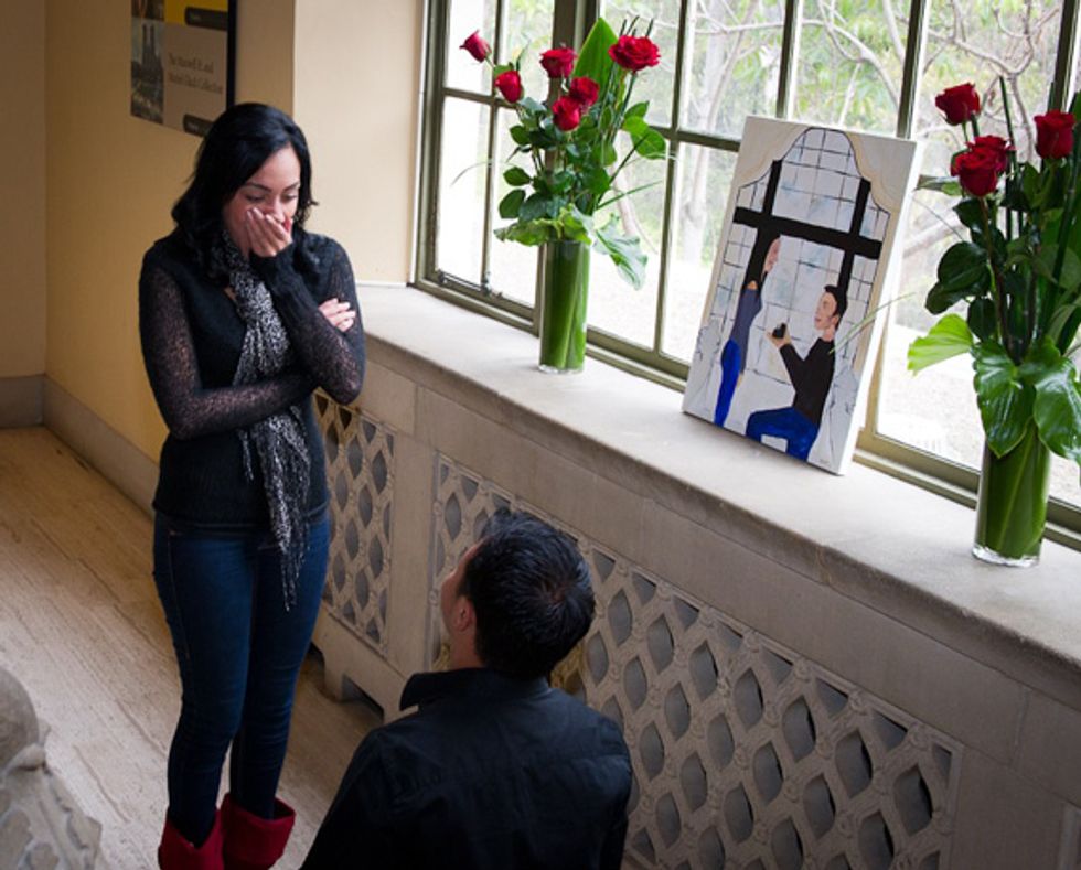 Vaughn launched another couple’s nuptials by having a man take his girlfriend on a vacation to San Diego. On a visit to an art museum, the pair was given a fake brochure listing the institution’s best paintings. The final artwork on the list wasn’t pictured. After pretending to be unable to find it, the BF excused himself, saying he needed to go to the restroom. He then called his girlfriend on her cell phone, saying he’d found the painting and telling her where to meet him. She discovered him in front of a painting showing him proposing to her. A picture is, indeed, worth a 1,000 words.