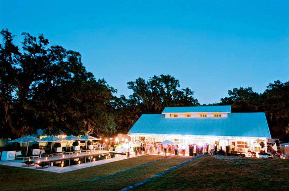 (Left) “The couple didn’t want a lot of color,” says Sorenson. “We added interest through layers of texture rather than bright hues.” After dinner, guests returned to the pool deck and danced the evening away under the stars. (Right) “We wanted a day that was stylish and elegant but not stuffy or traditional,” says the bride. “We urged everyone to relax and enjoy the day.”