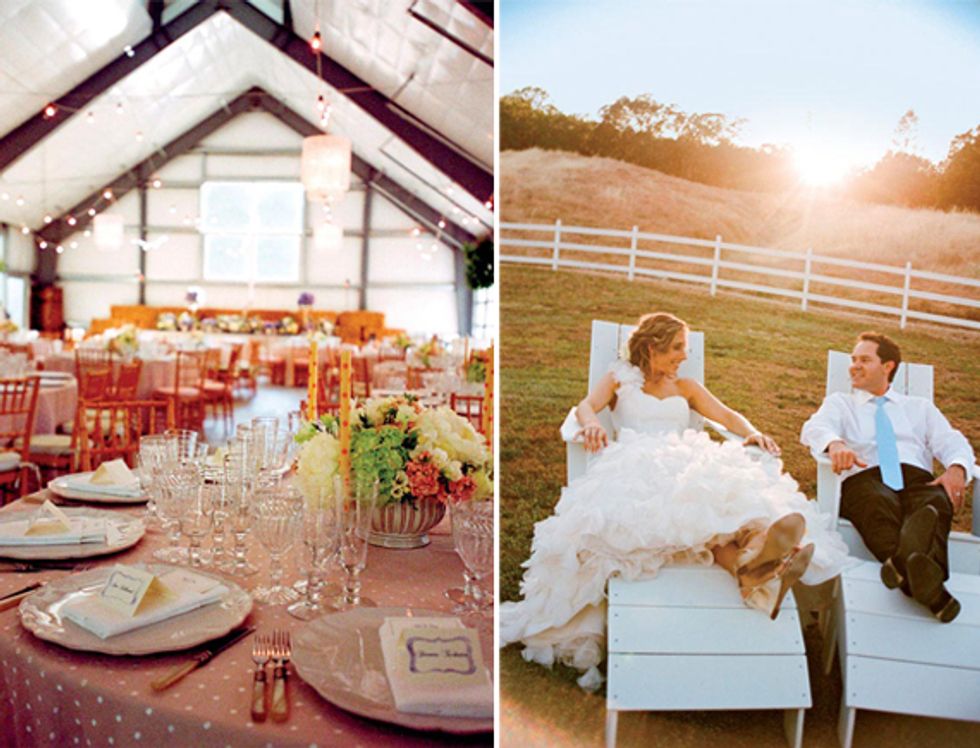 (Left) When it came to the ceremony, the couple decided to be uncharacteristically speedy. “We kept it short and sweet,” says Talia. In a nod to her Quaker upbringing, the vows included a moment of silence, a traditional part of that faith’s service. (Right) Originally, the bride planned on wearing a dress that “looked like it would be at home in a country music video” and cowboy boots. But when she saw this gown, she decided to go more runway than rodeo.