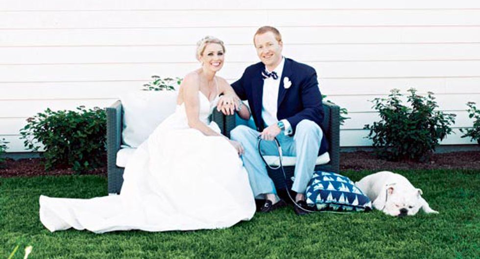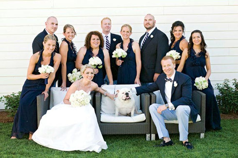 On Doug’s bookshelf, you’ll find The Official Preppy Handbook and The WASP Cookbook, so no one was surprised when he married Sarah (who shares his aesthetic) in a prepster wedding that would put a smile on a Lacoste alligator’s face. It was fitting that their faithful sidekick Cupcake, a white English bulldog, not only walked down the aisle but lay at Sarah’s feet during the vows.
