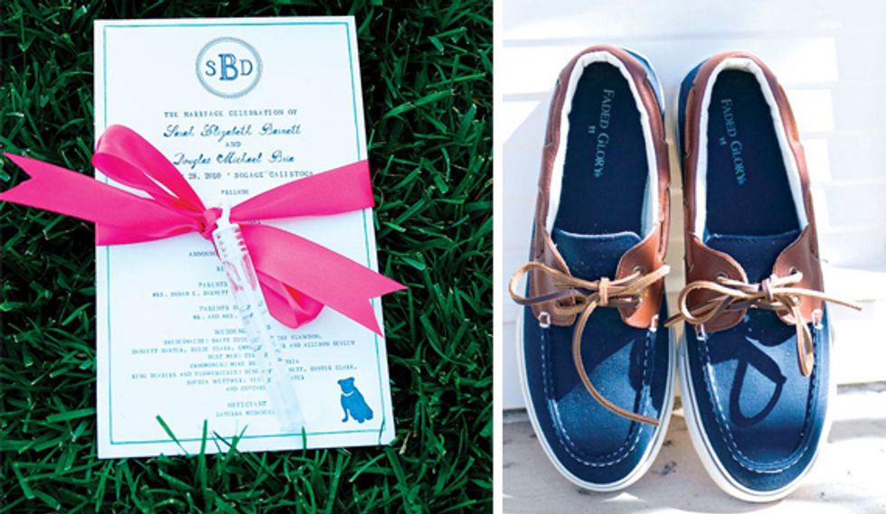 (Left) After searching everywhere for navy deck shoes for the men in the wedding party, the bride found them at an inexpensive source: Walmart. (Right) Vials of soap solution were tied on the programs so guests could blow bubbles at the newly minted man and wife.