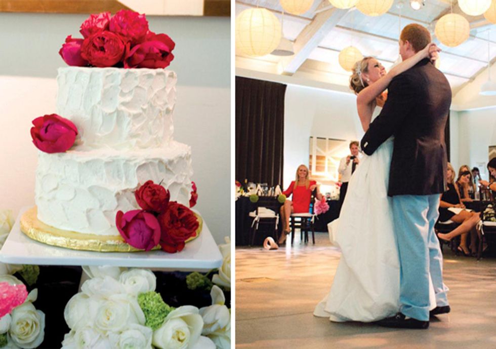 (Left) The couple took the floor for their first dance only a moment before guests (and Cupcake) joined them. (Right) The buttermilk cake was filled with whipped cream and berries and covered with vanilla frosting.