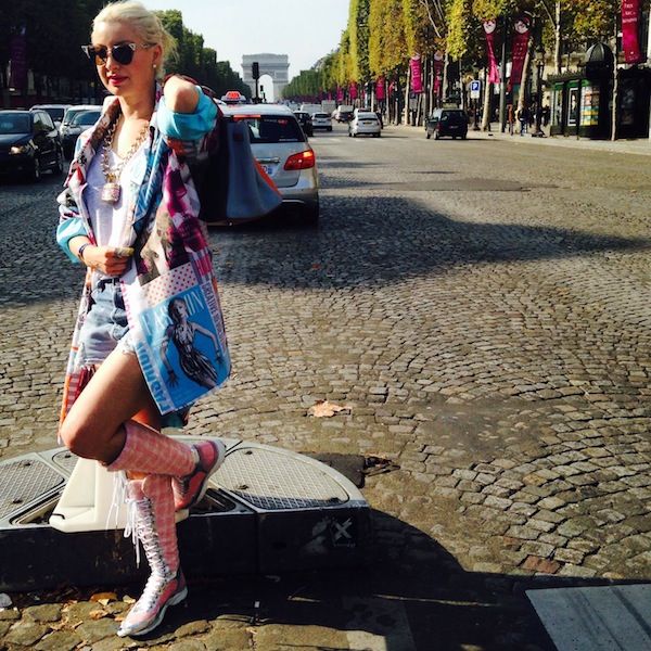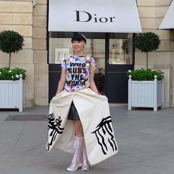 This week we see Miss Molodetskaya during her trip to Paris Fashion Week, slathered in bombastic Christian Lacroix finery, Chanel sneaker boots, chain & lock necklace, Dior shoes, and more. Gilding this week's array of attire is a Beyonce lyric emblazoned across her chest. Glorious.